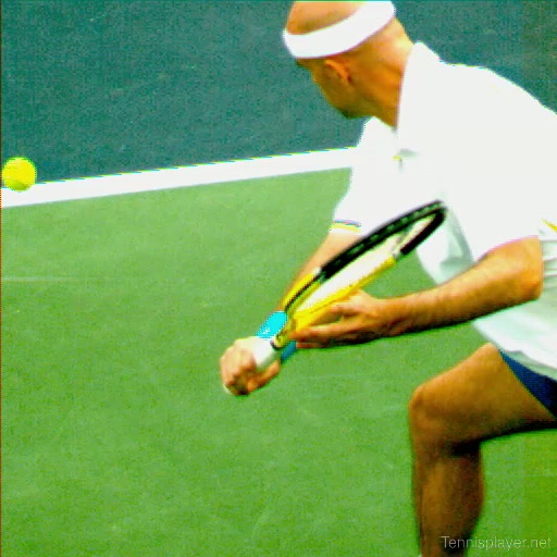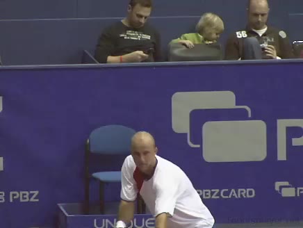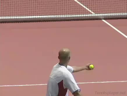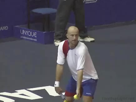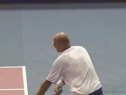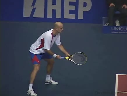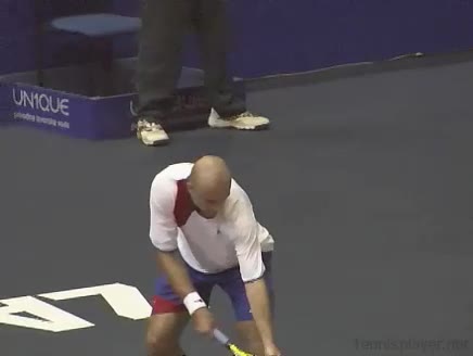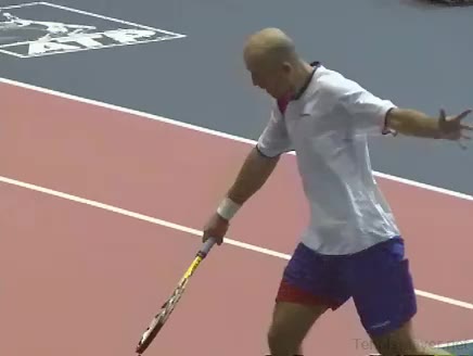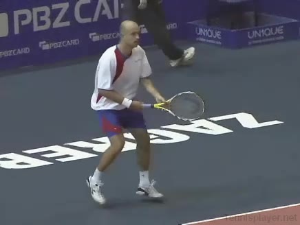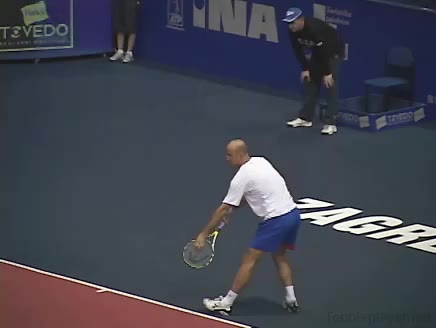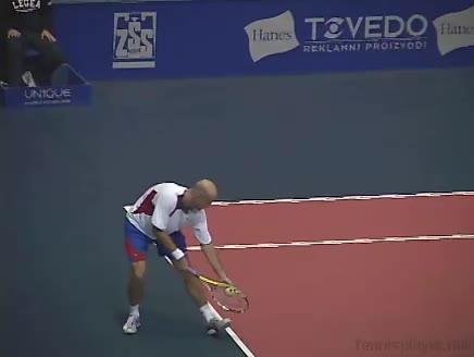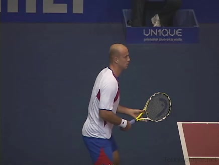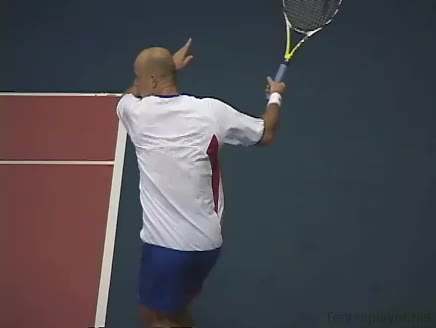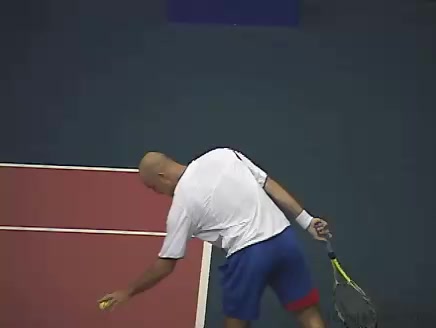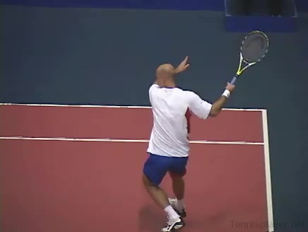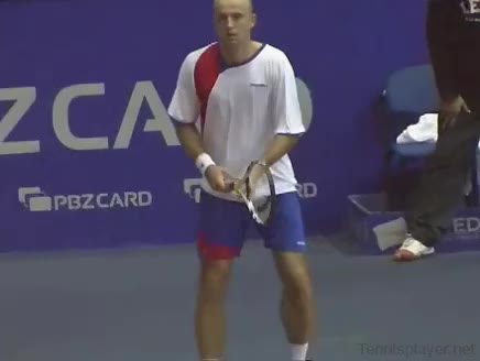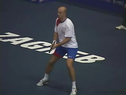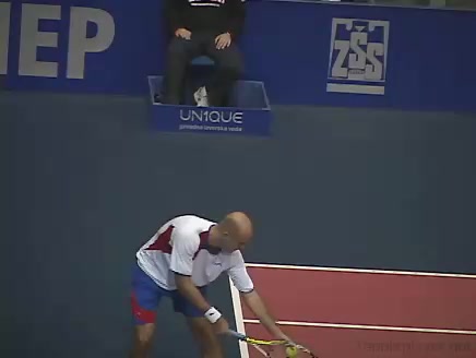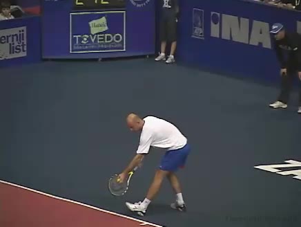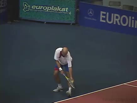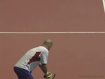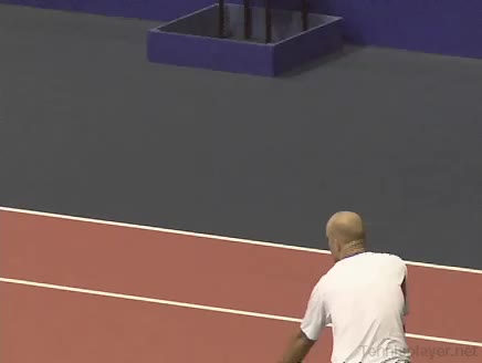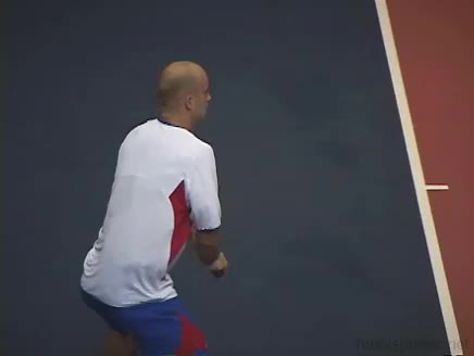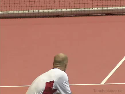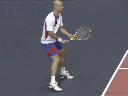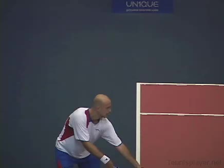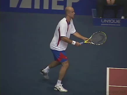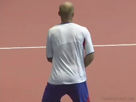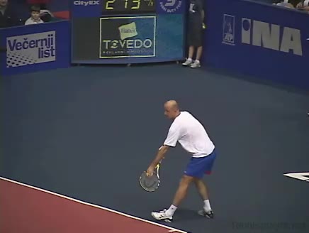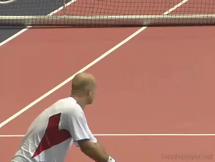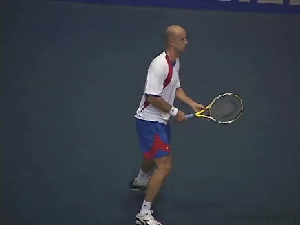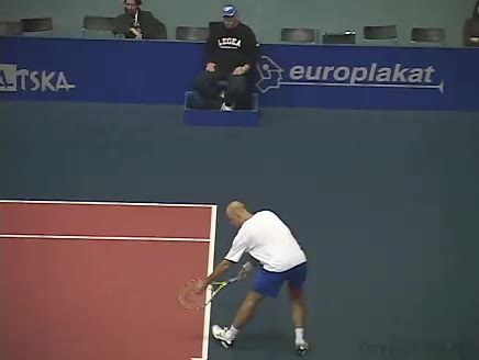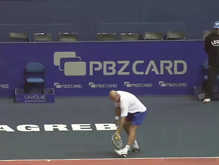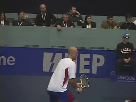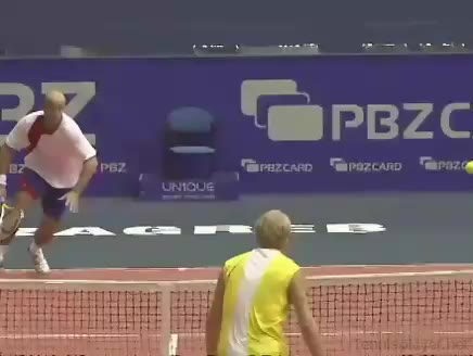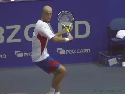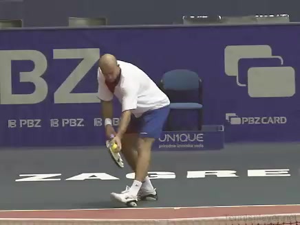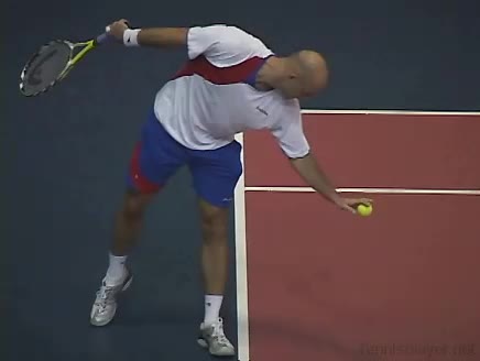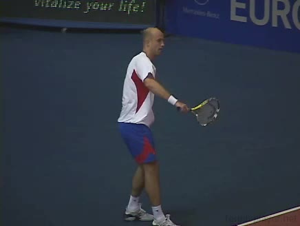 Ivan Ljubicic's wide backhand from the front. His shoulders rotate as a single unit with the trunk on the unit turn, then uncoil together through contact with minimal independent shoulder whip, making the trunk rotation the primary driver of the stroke.