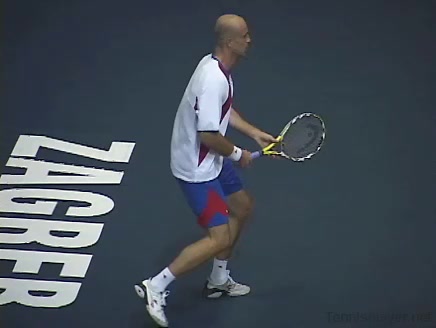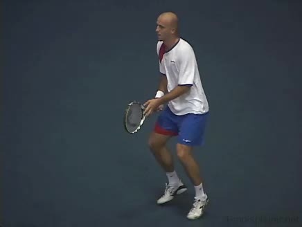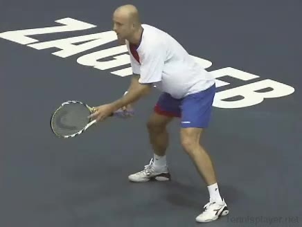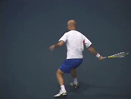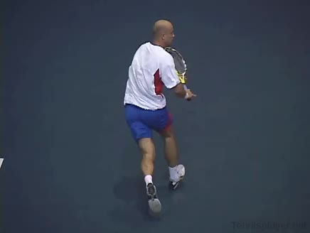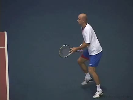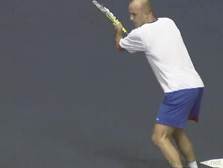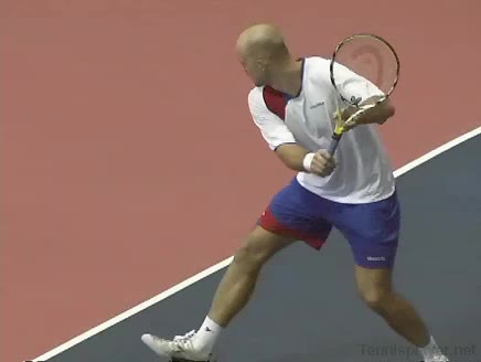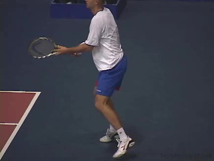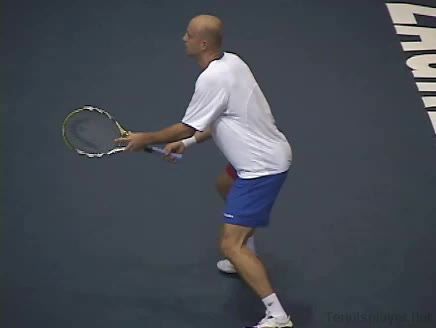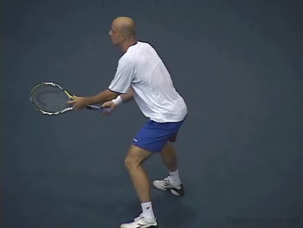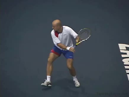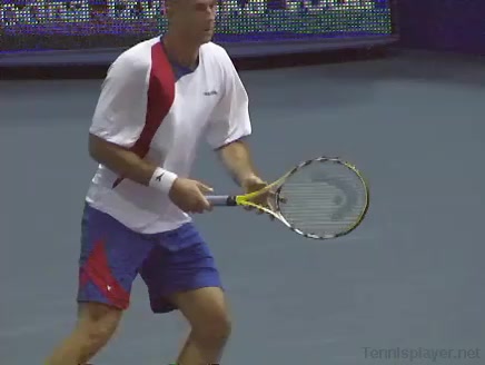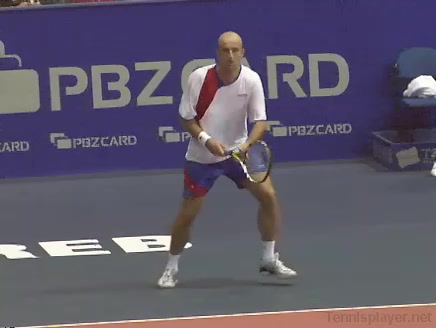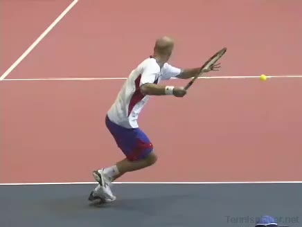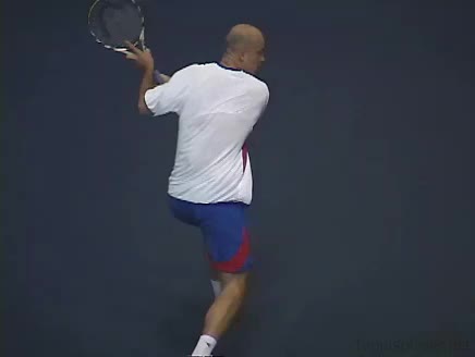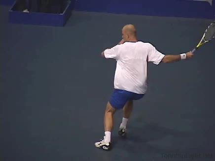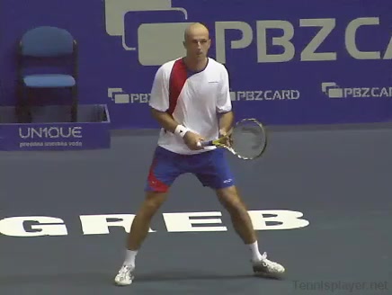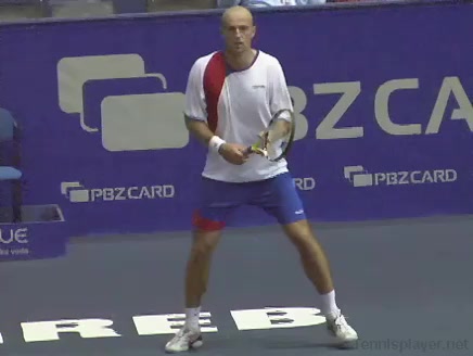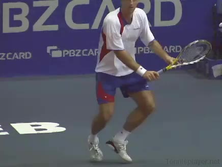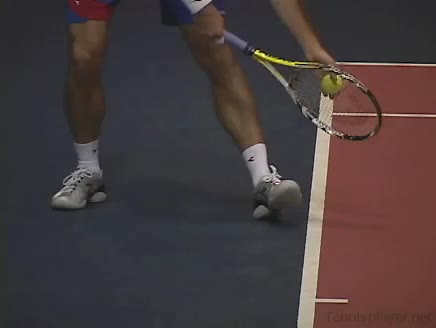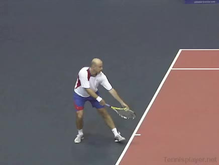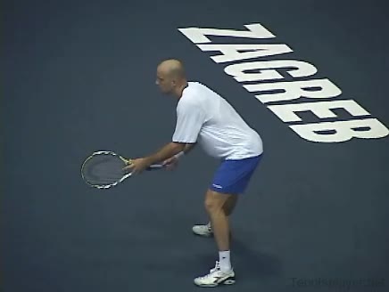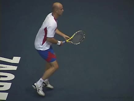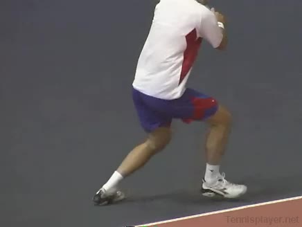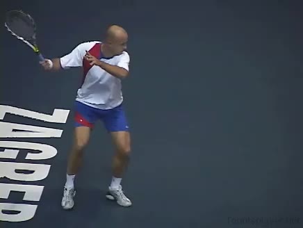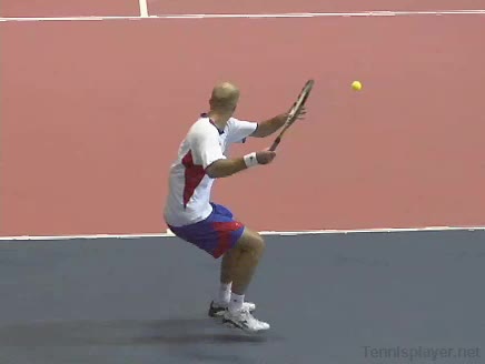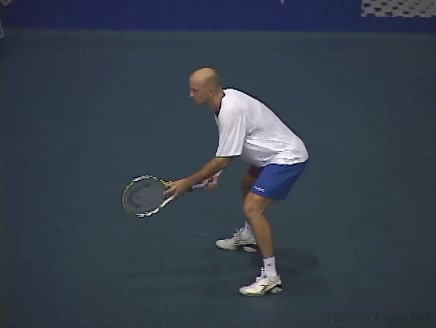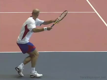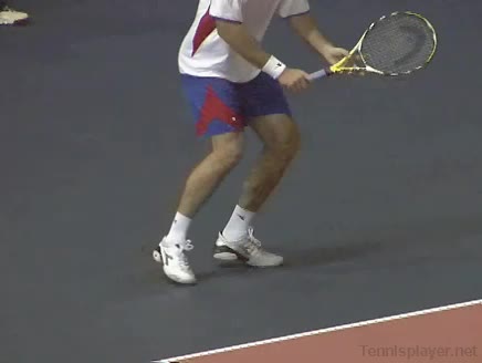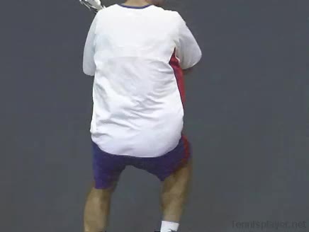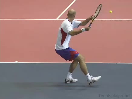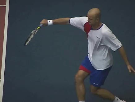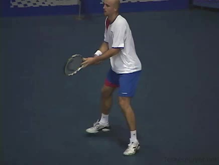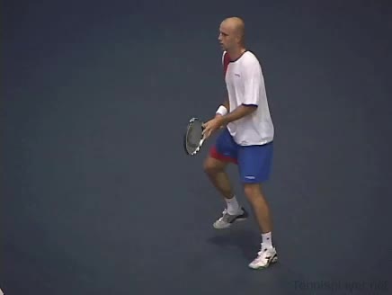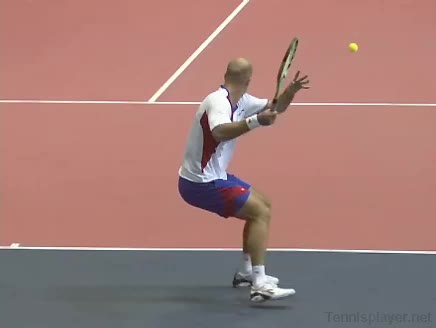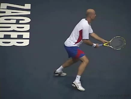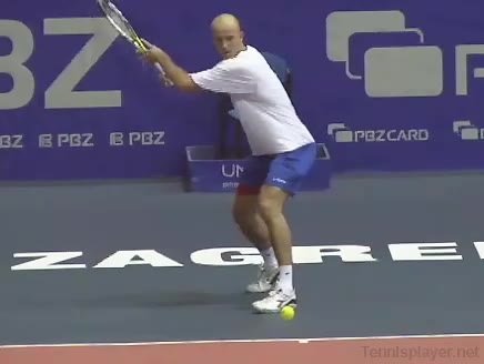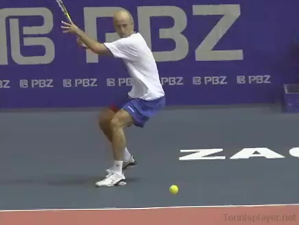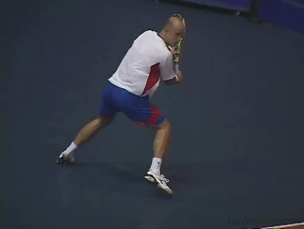 Ivan Ljubicic's backhand while moving back from a neutral court position, filmed from the front. His hips stay relatively closed as he retreats, with a deep knee bend on the outside leg helping him load before driving up and through the one-handed backhand.