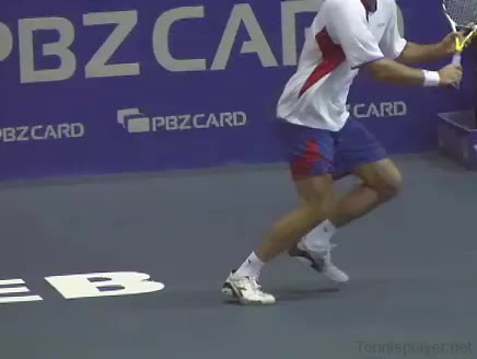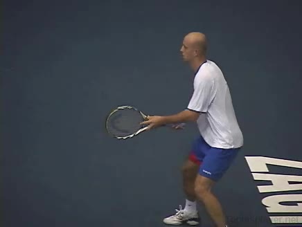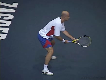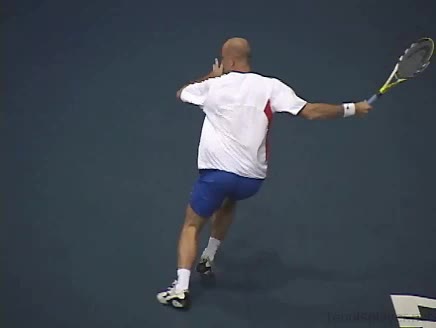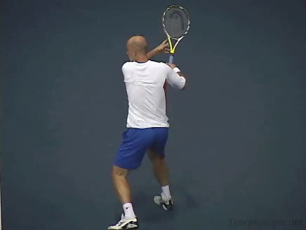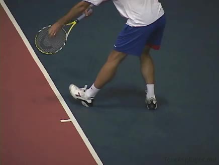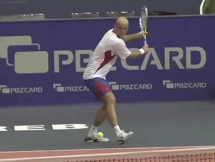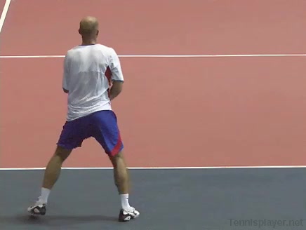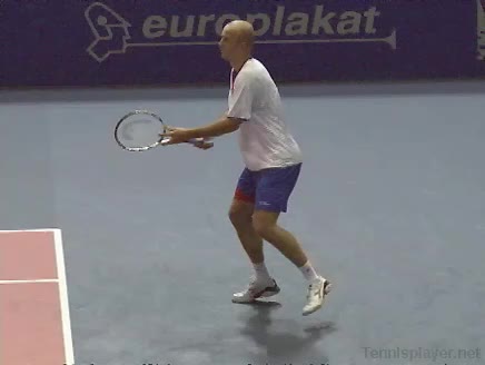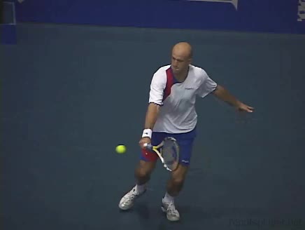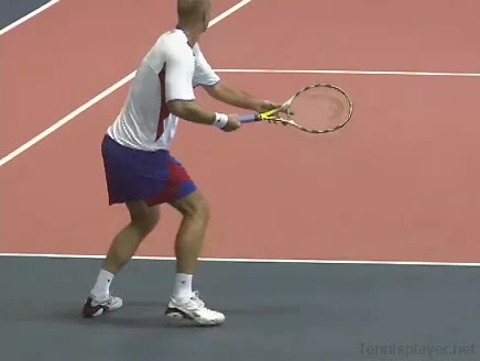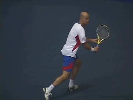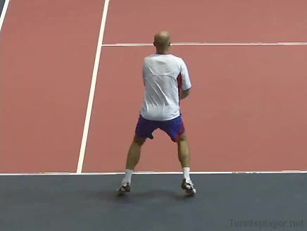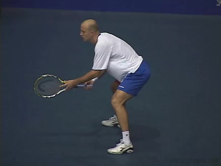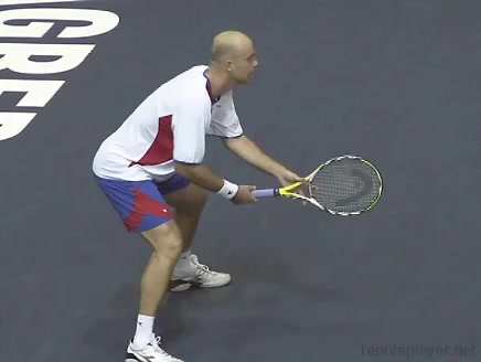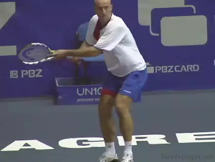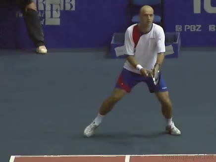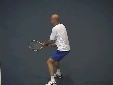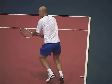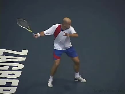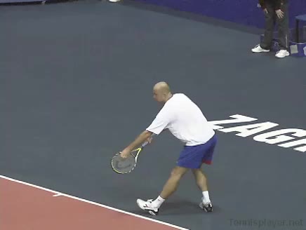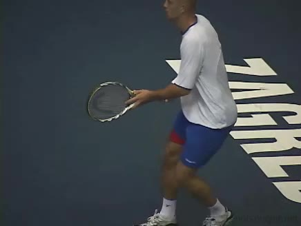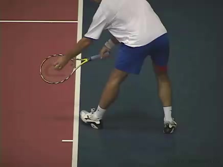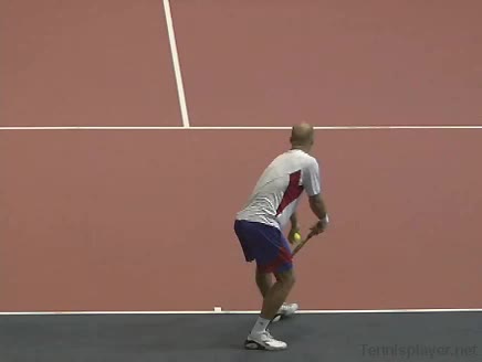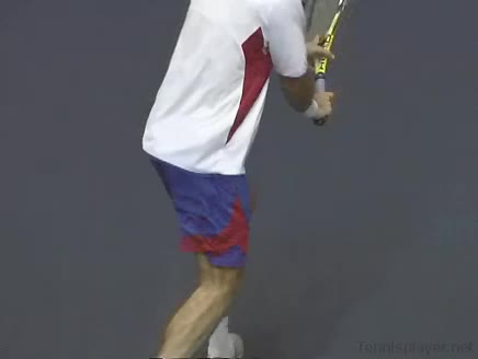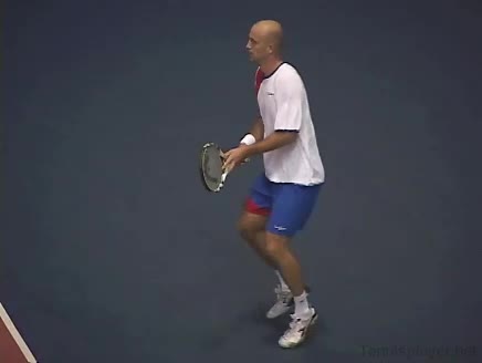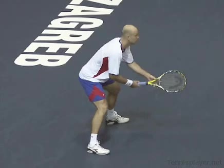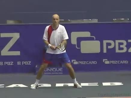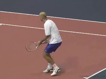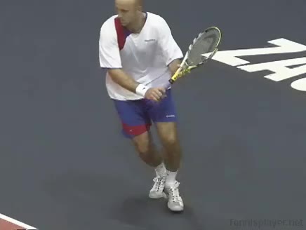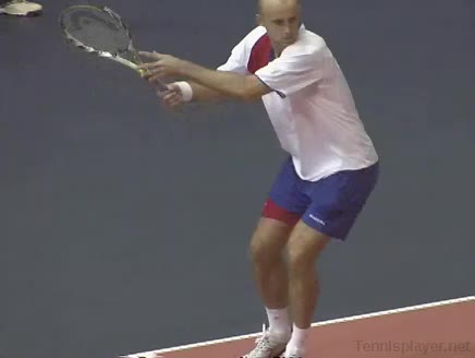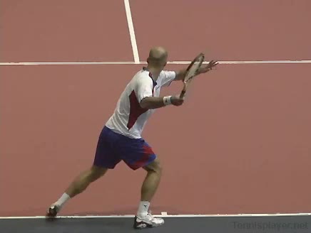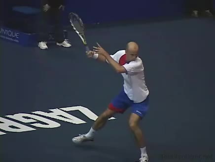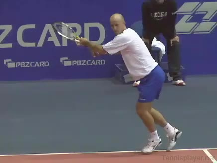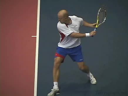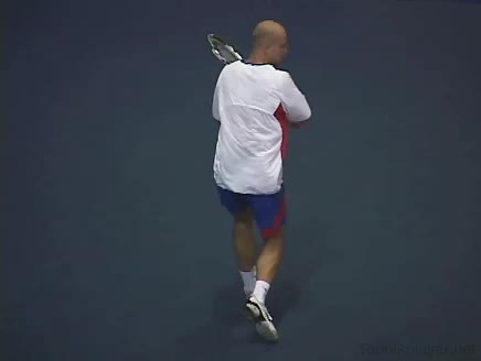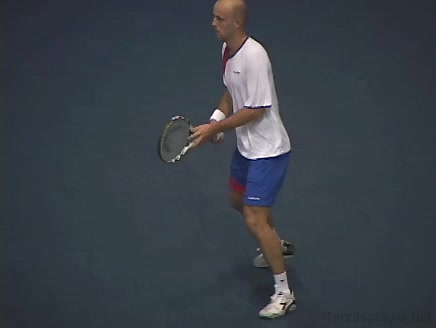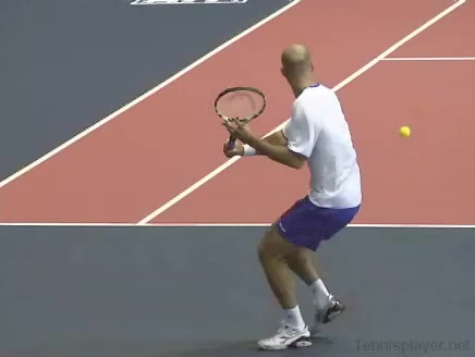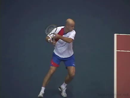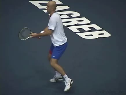 Ivan Ljubicic's backhand while moving back from a neutral court position, filmed from the front. His hips stay relatively closed as he retreats, with a deep knee bend on the outside leg helping him load before driving up and through the one-handed backhand.
