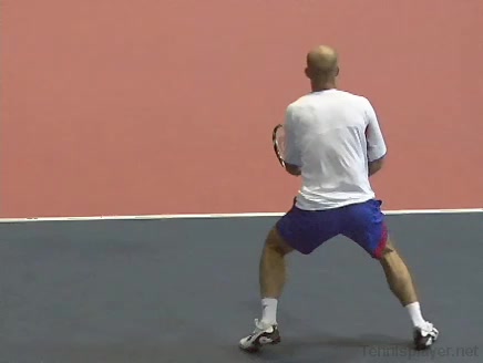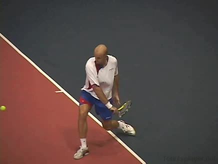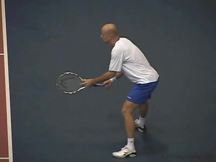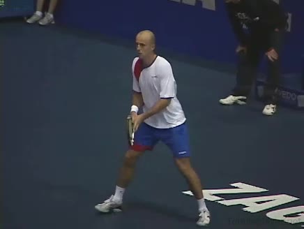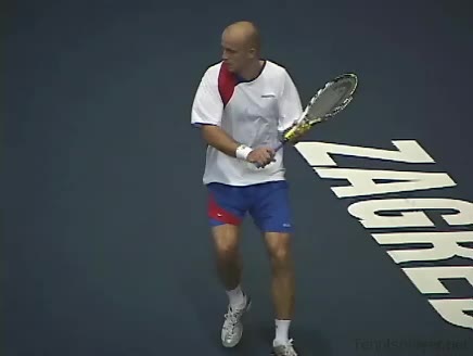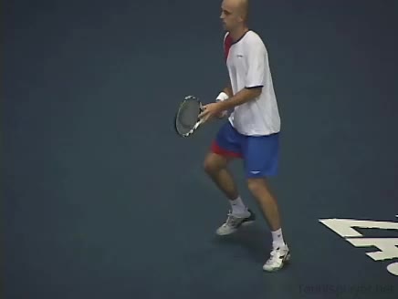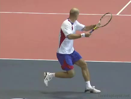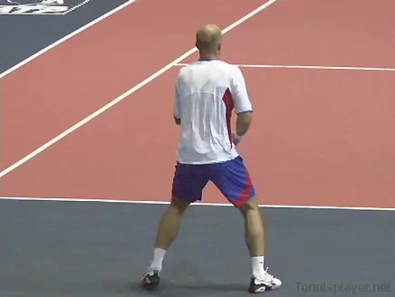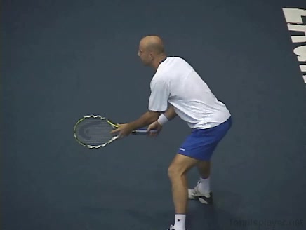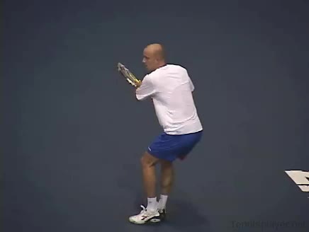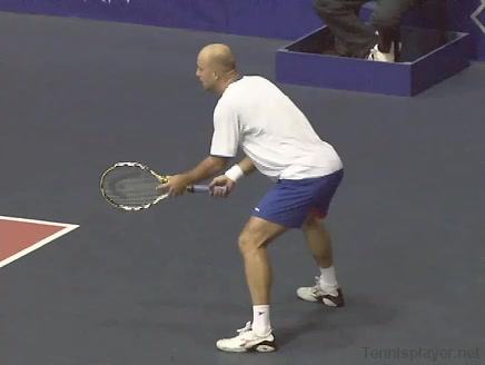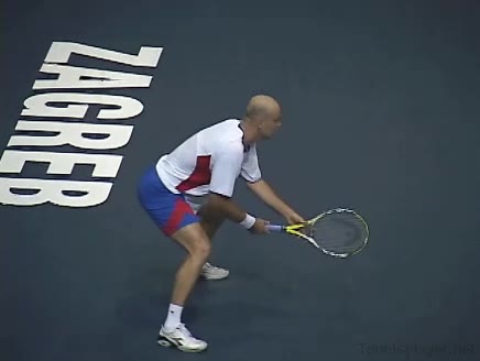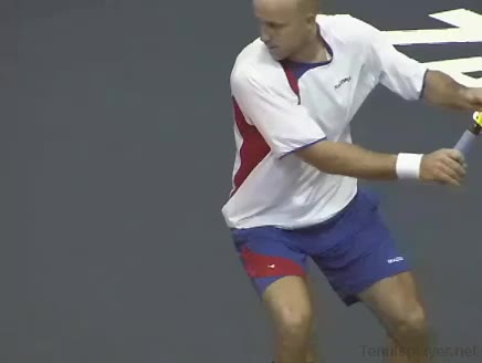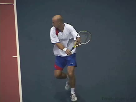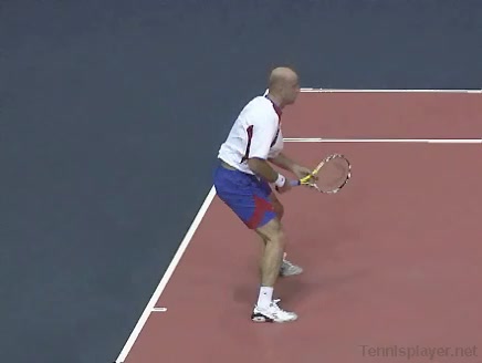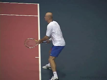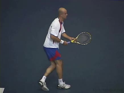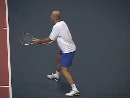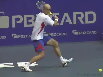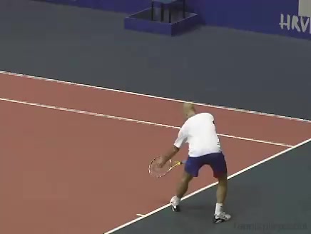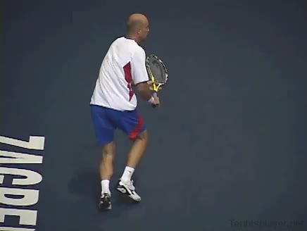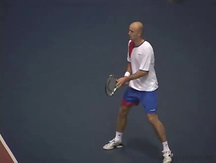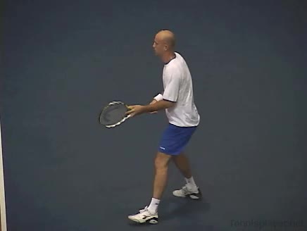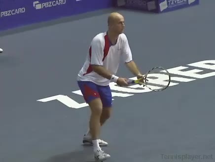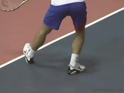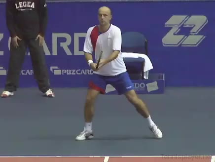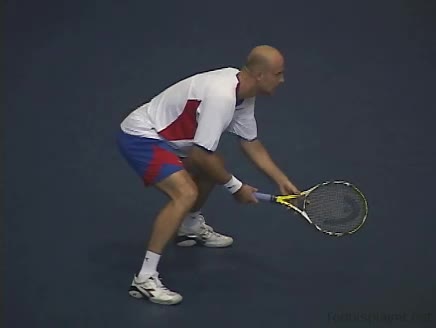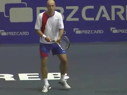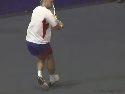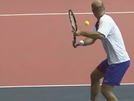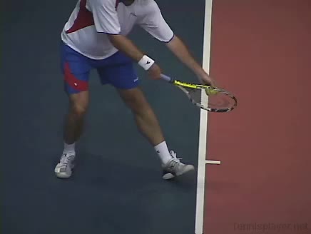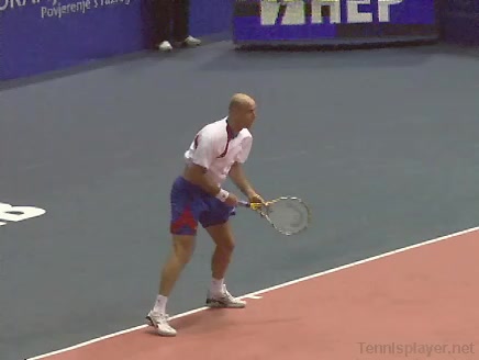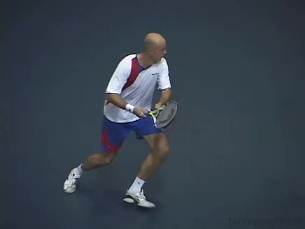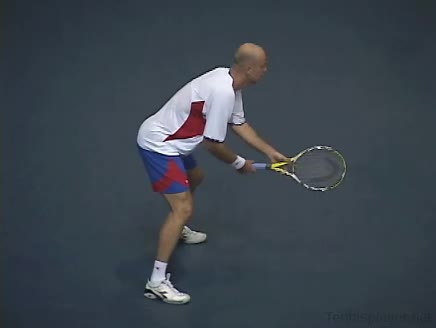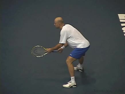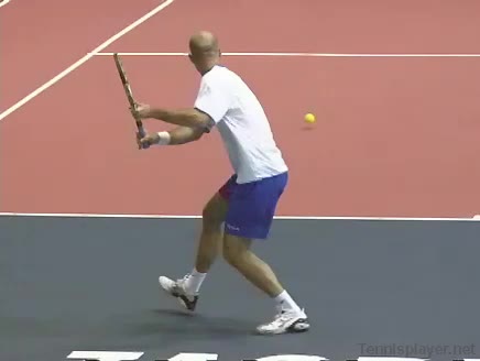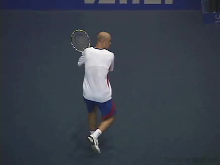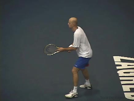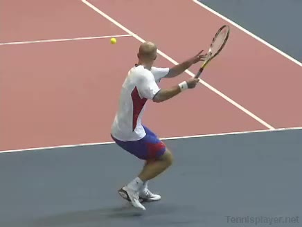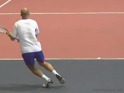 Ivan Ljubicic's backhand while moving back from a neutral court position, filmed from the front. His hips stay relatively closed as he retreats, with a deep knee bend on the outside leg helping him load before driving up and through the one-handed backhand.