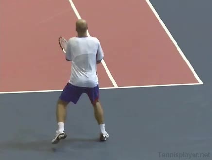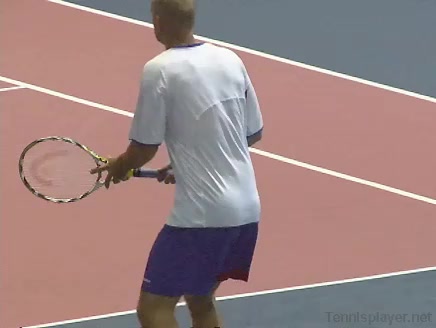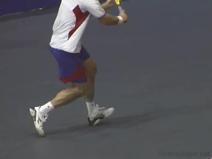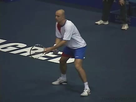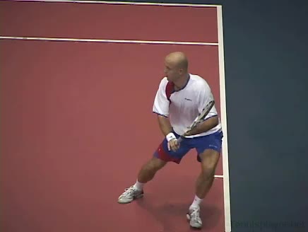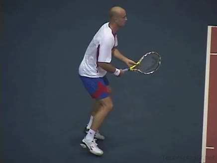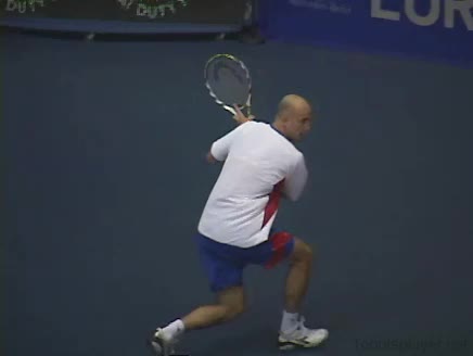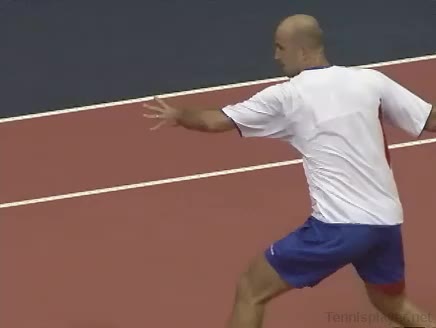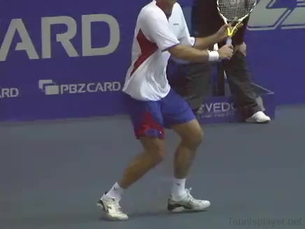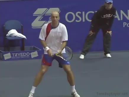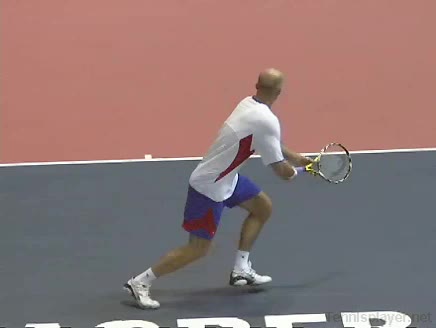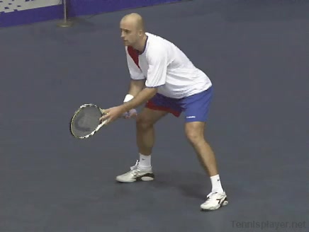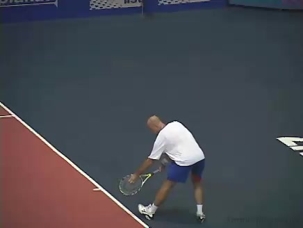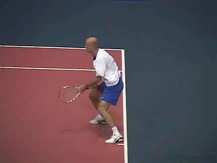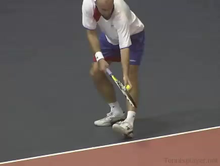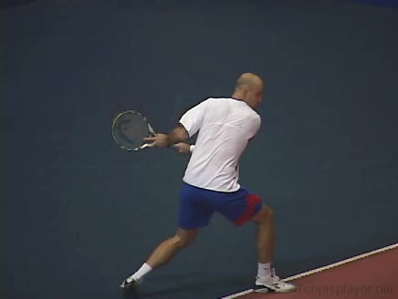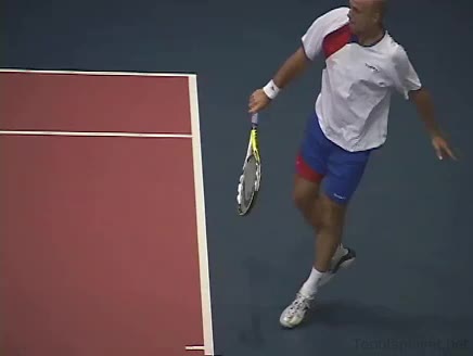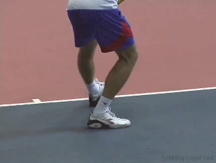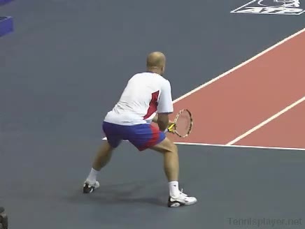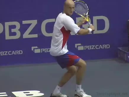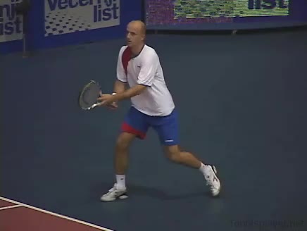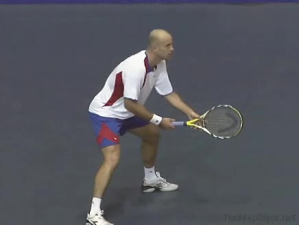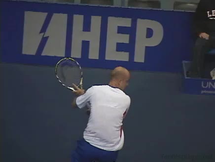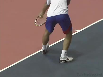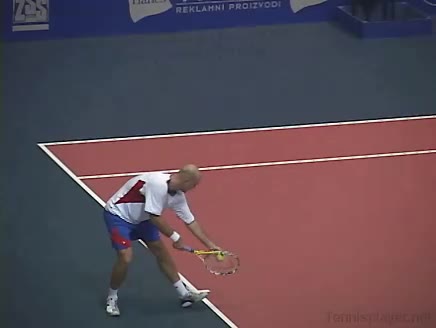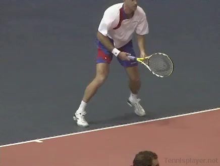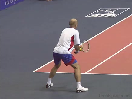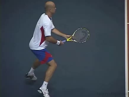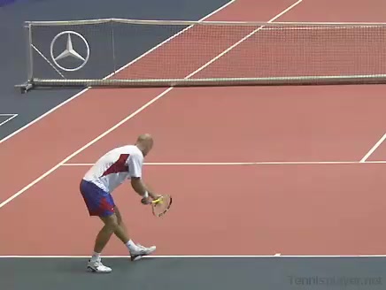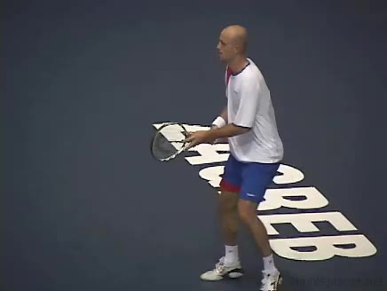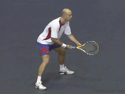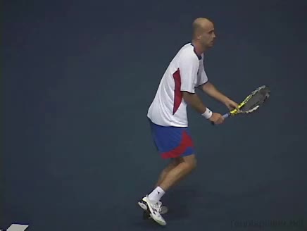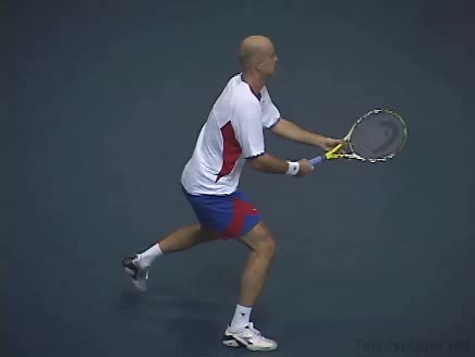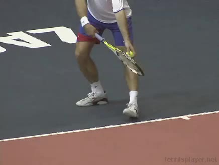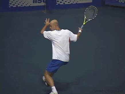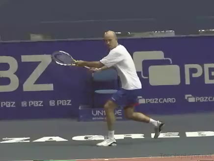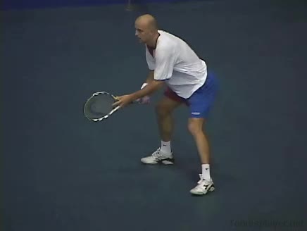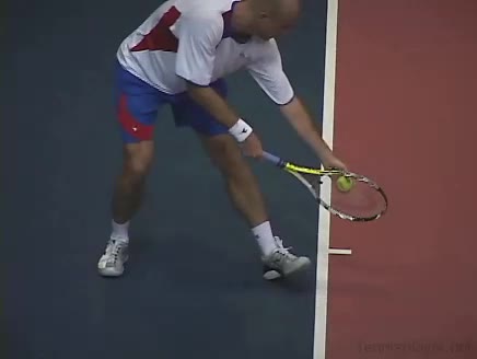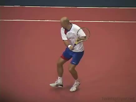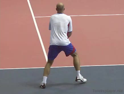Ivan Ljubicic's backhand while moving back from a neutral court position, filmed from the front. His hips stay relatively closed as he retreats, with a deep knee bend on the outside leg helping him load before driving up and through the one-handed backhand.