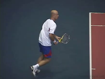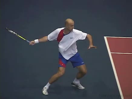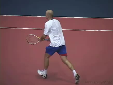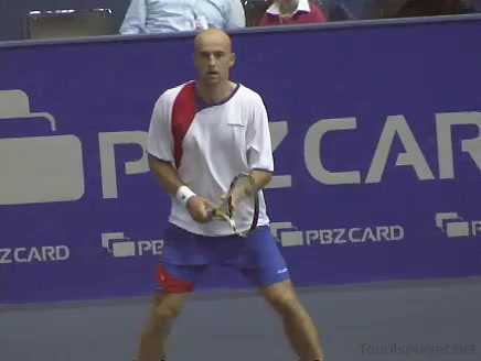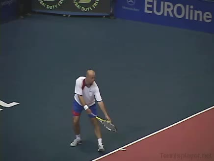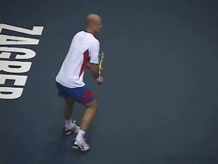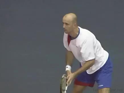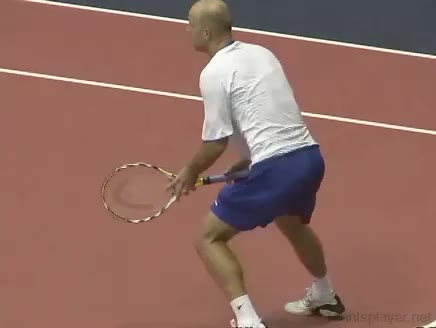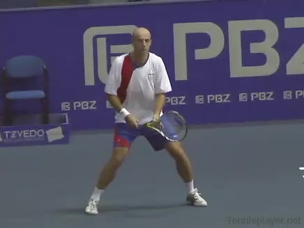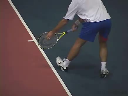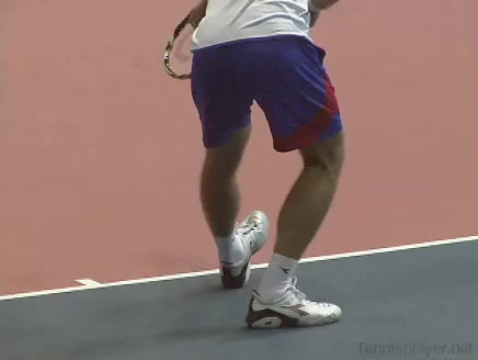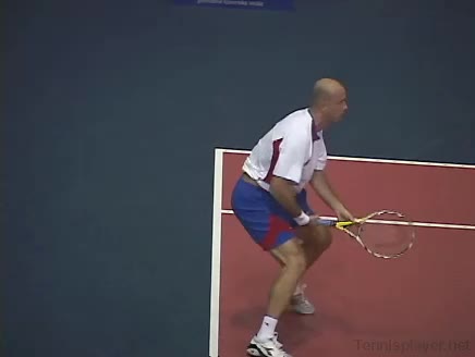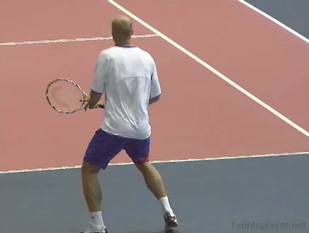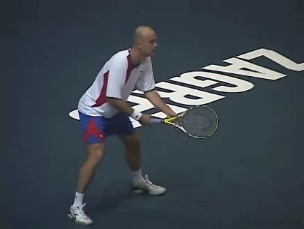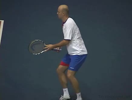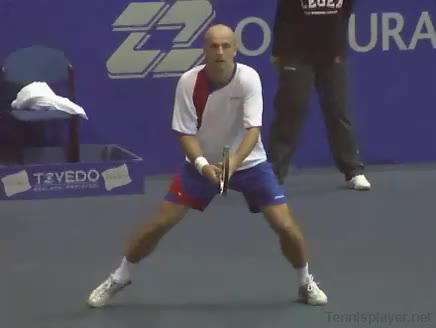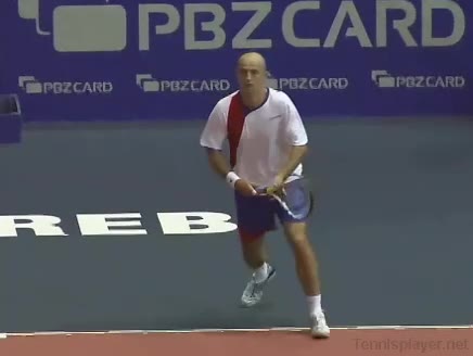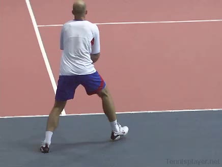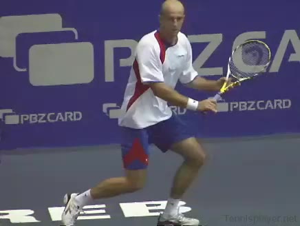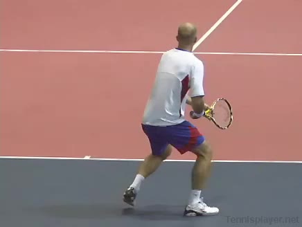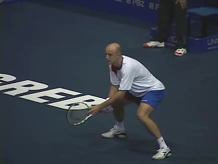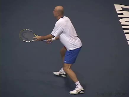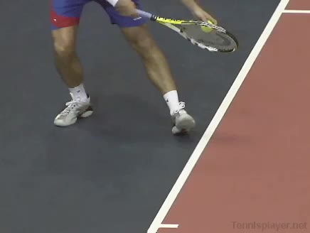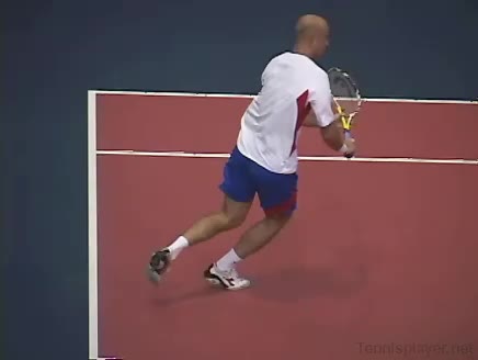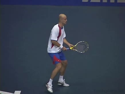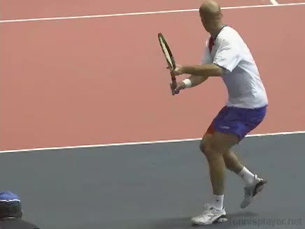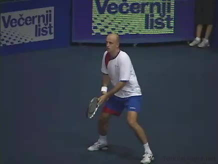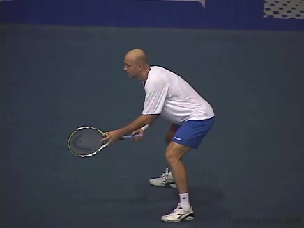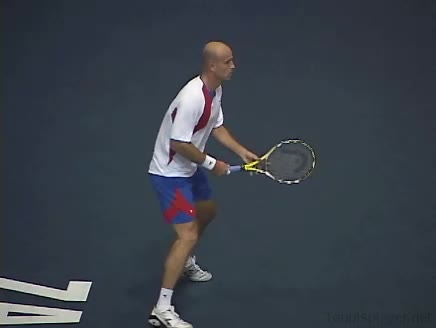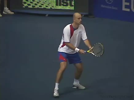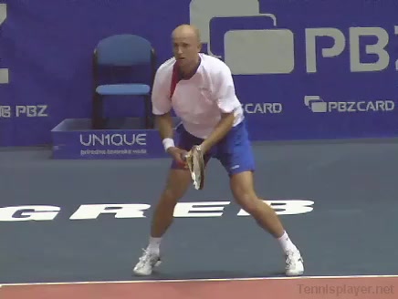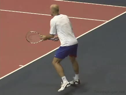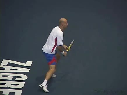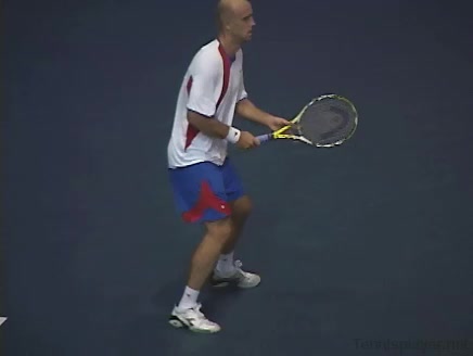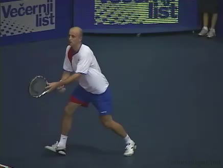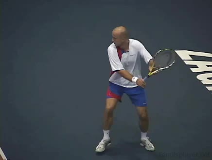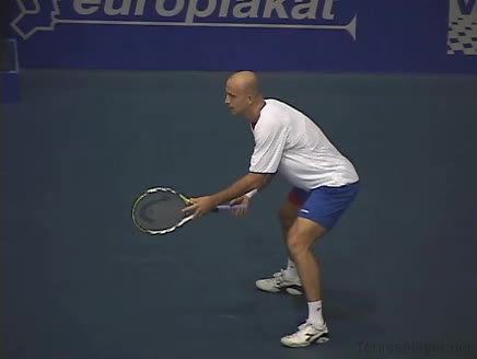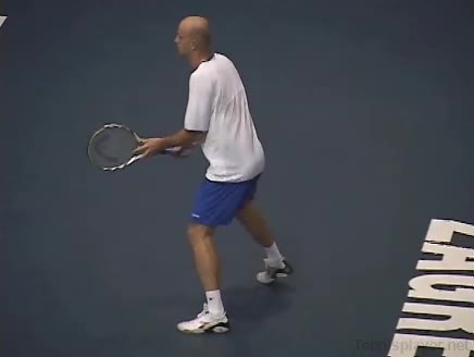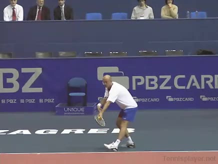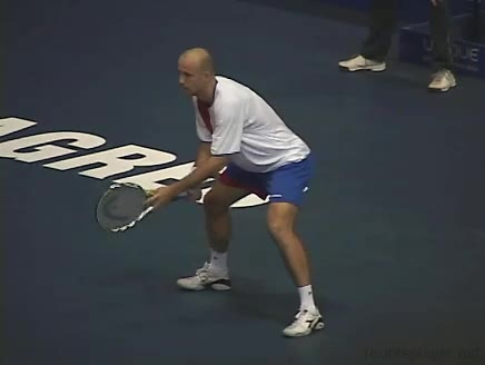 Ivan Ljubicic's backhand while moving back from a neutral court position, filmed from the front. His hips stay relatively closed as he retreats, with a deep knee bend on the outside leg helping him load before driving up and through the one-handed backhand.