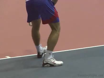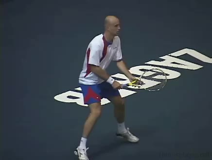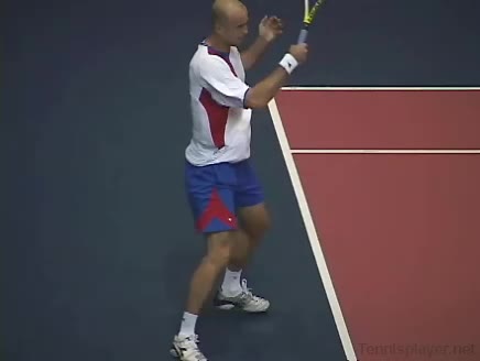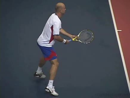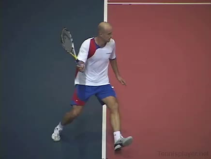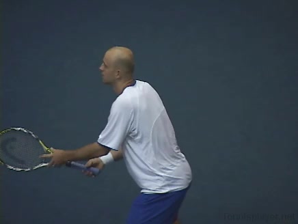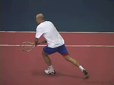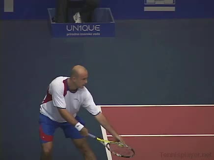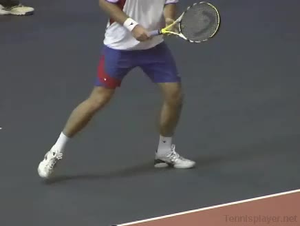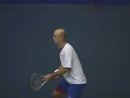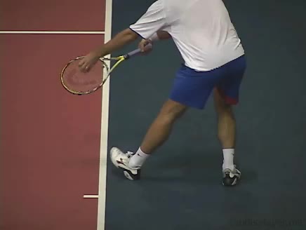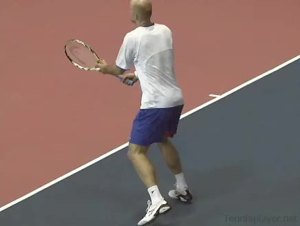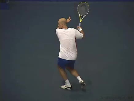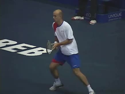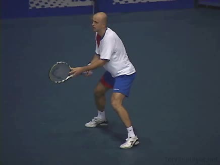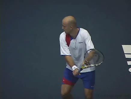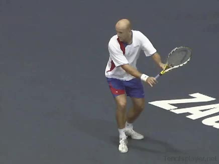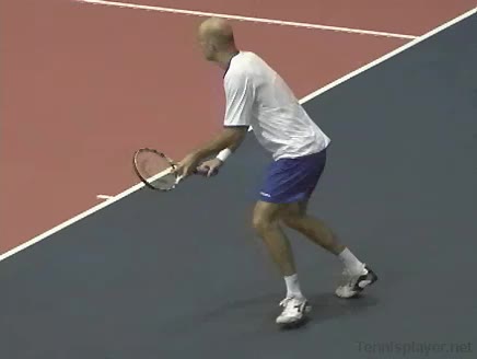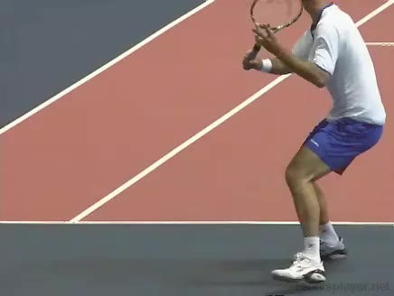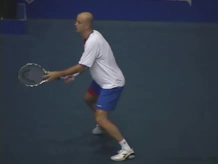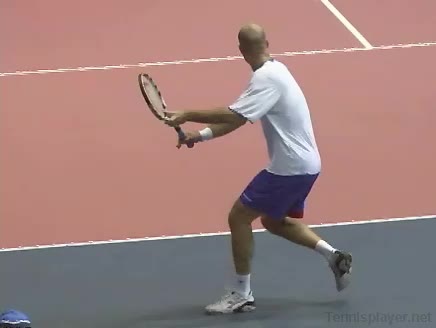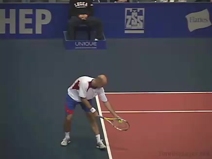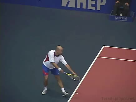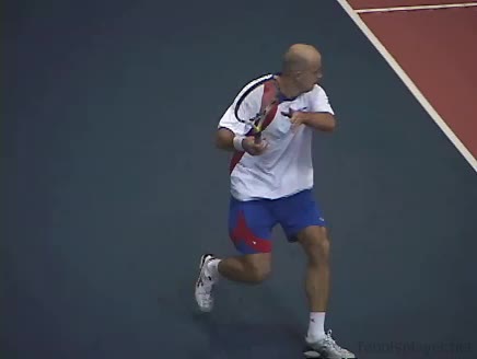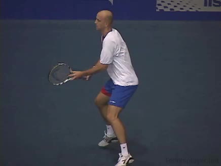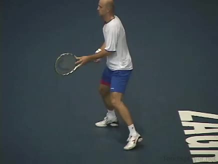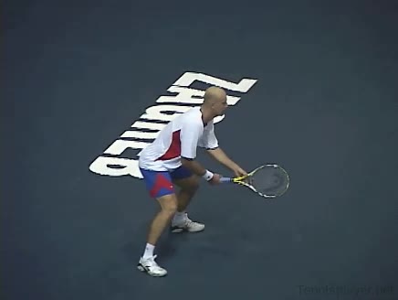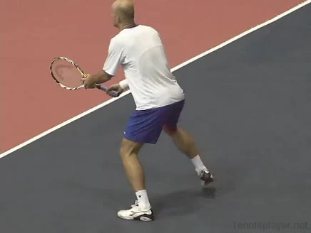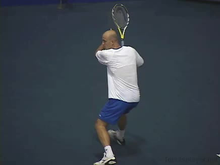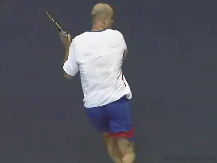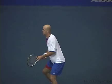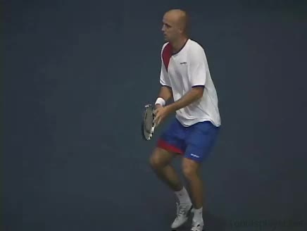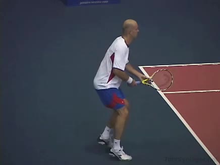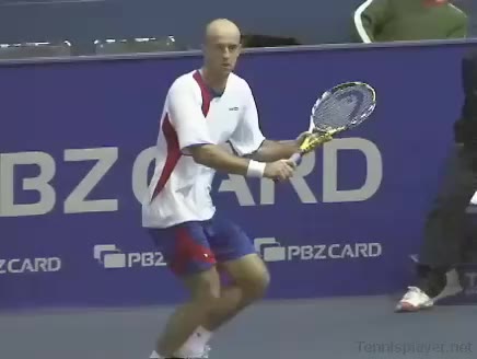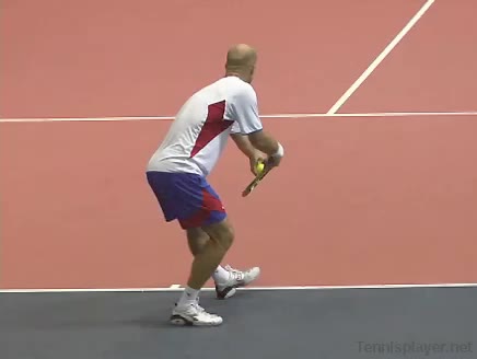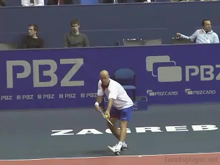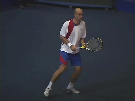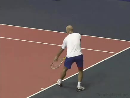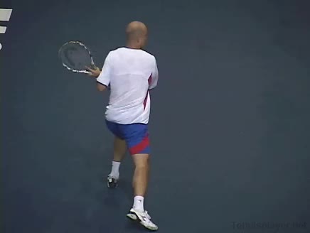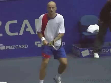 Ivan Ljubicic's backhand while moving back from a neutral court position, filmed from the front. His hips stay relatively closed as he retreats, with a deep knee bend on the outside leg helping him load before driving up and through the one-handed backhand.