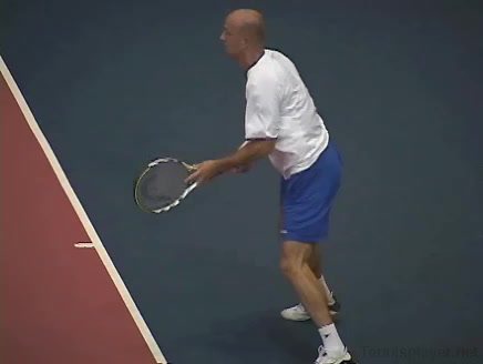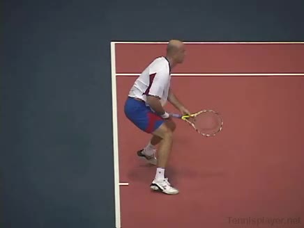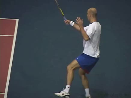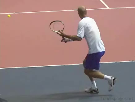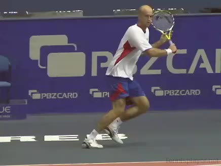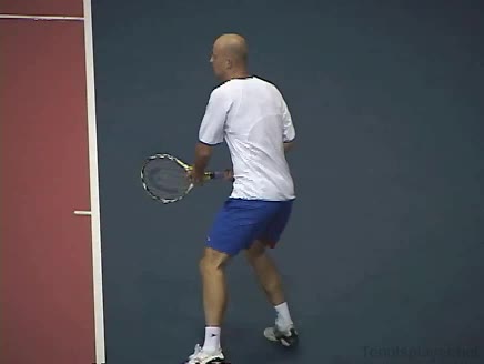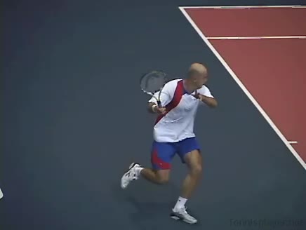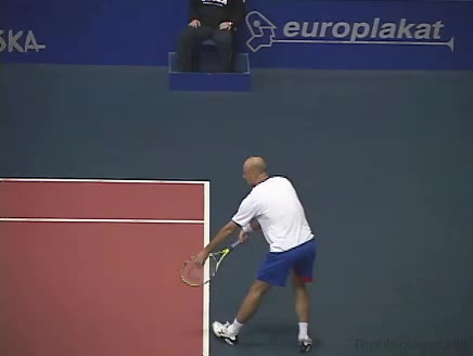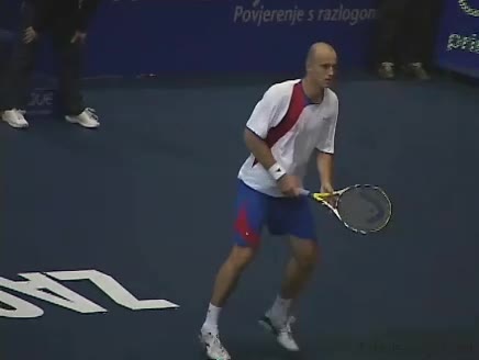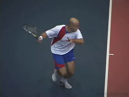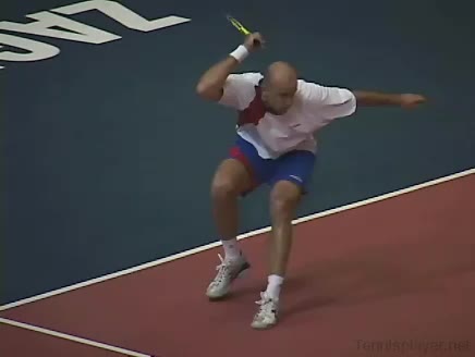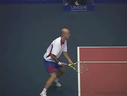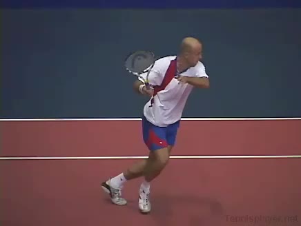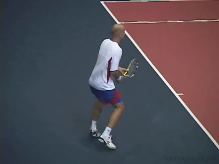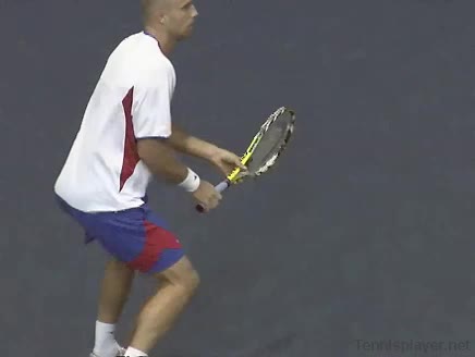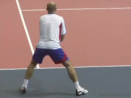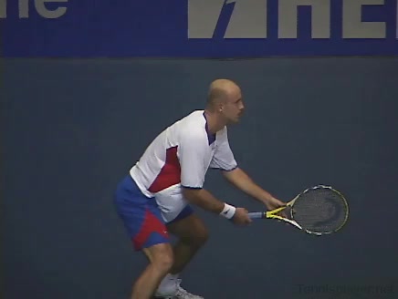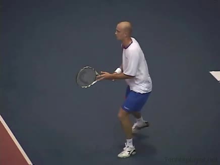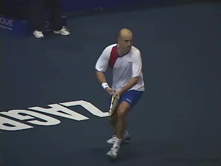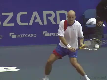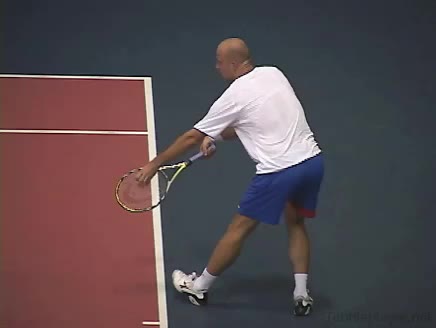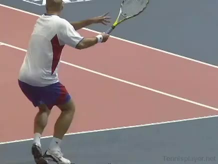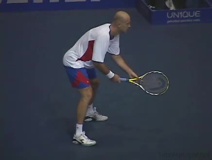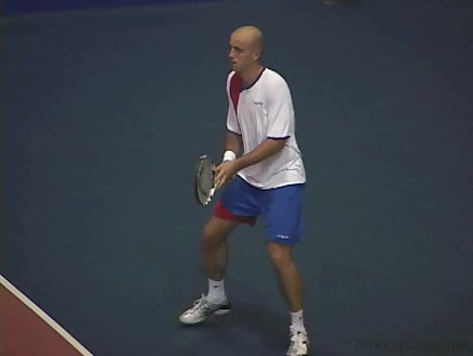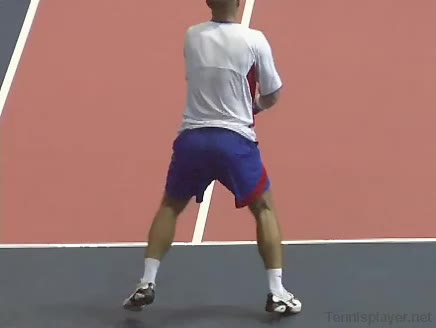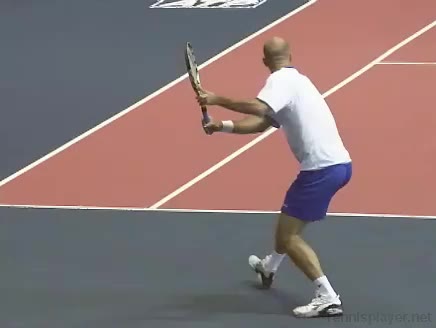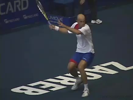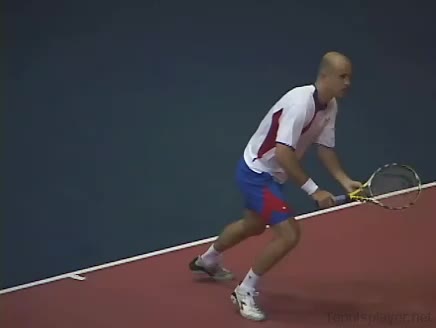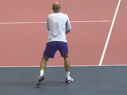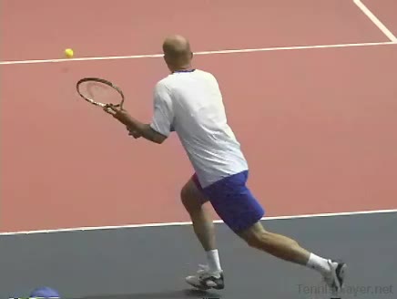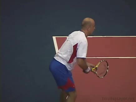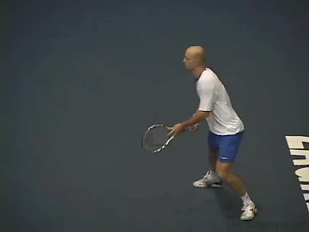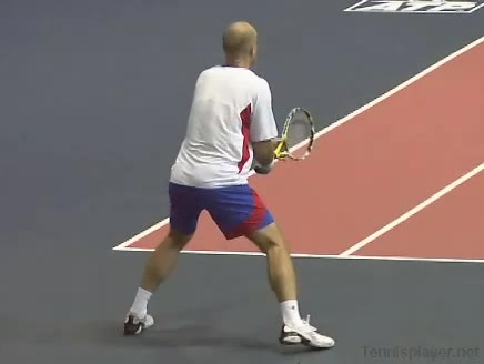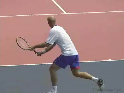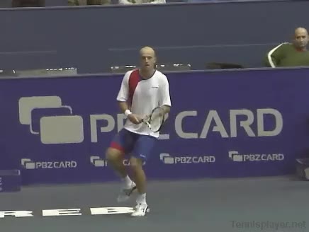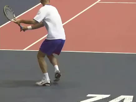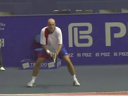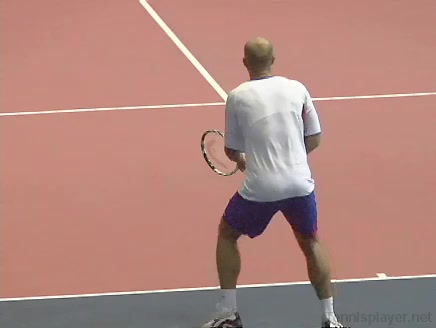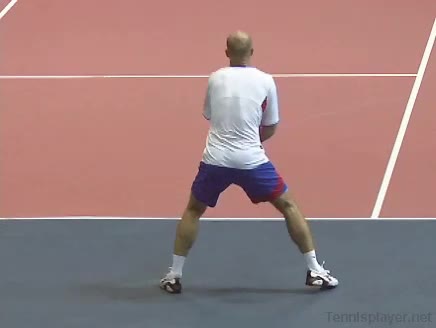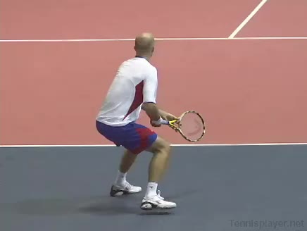 Ivan Ljubicic's backhand while moving back from a neutral court position, filmed from the front. His hips stay relatively closed as he retreats, with a deep knee bend on the outside leg helping him load before driving up and through the one-handed backhand.