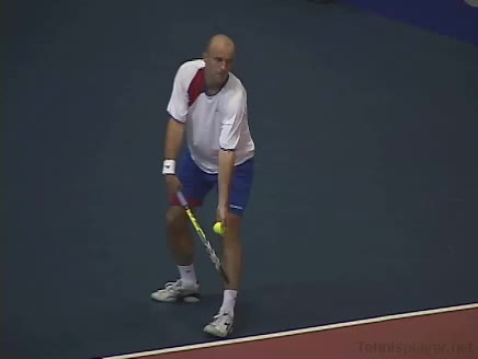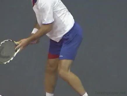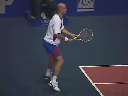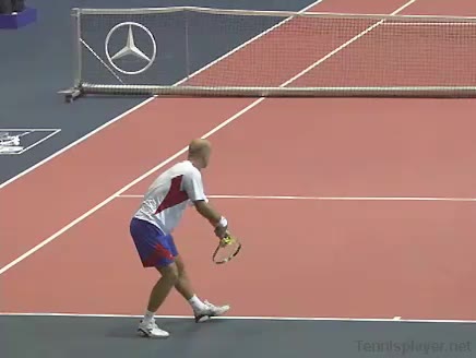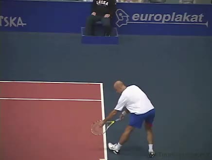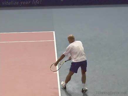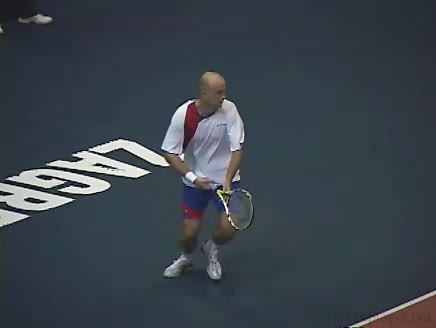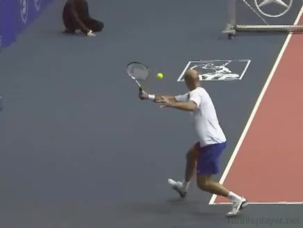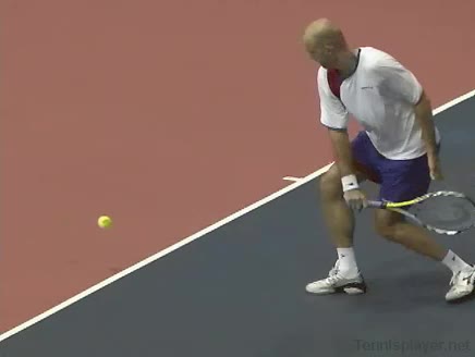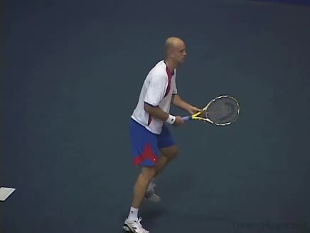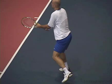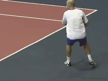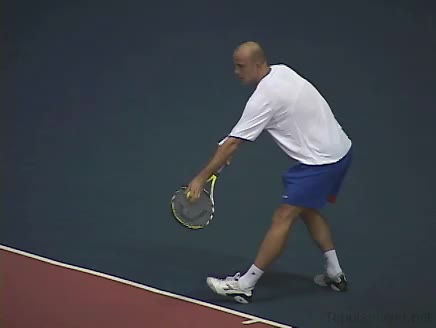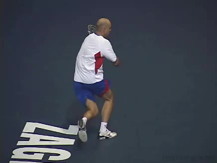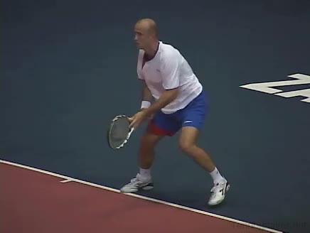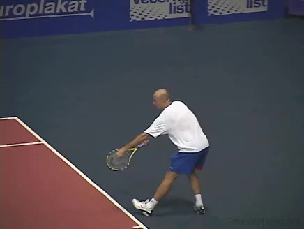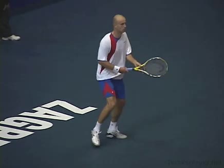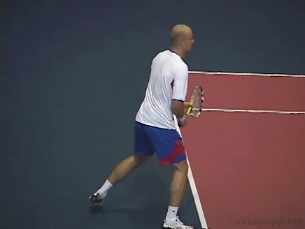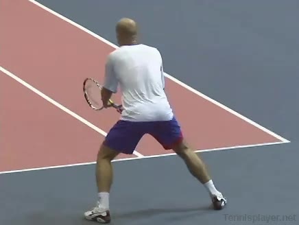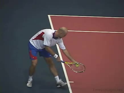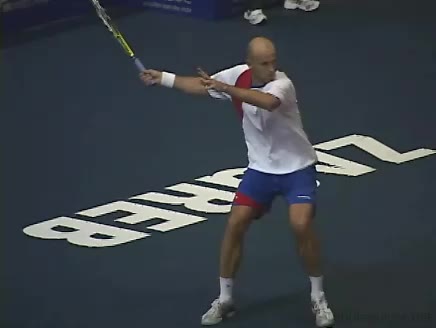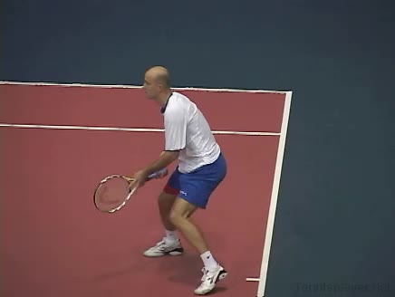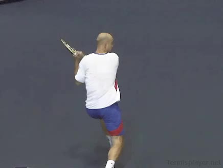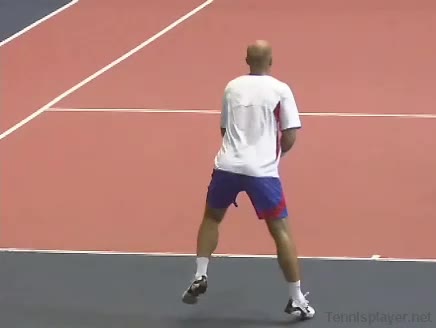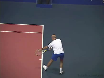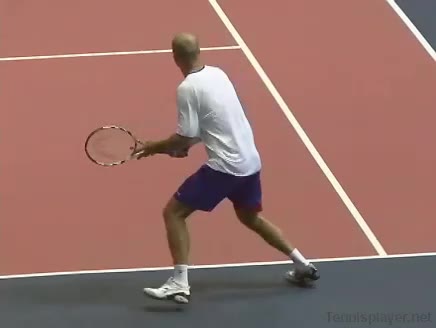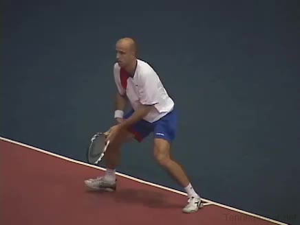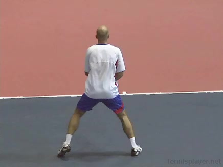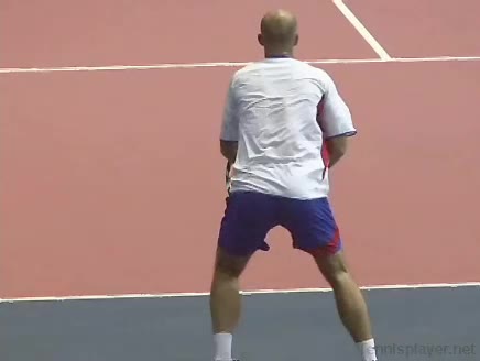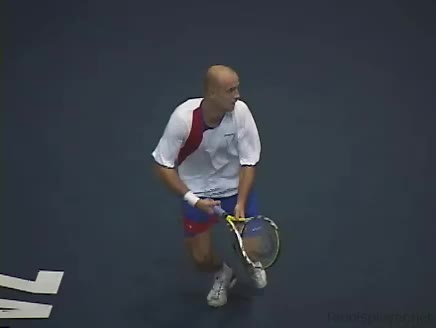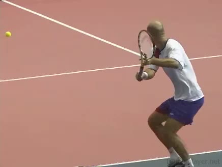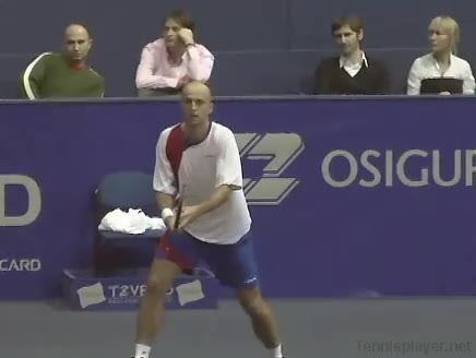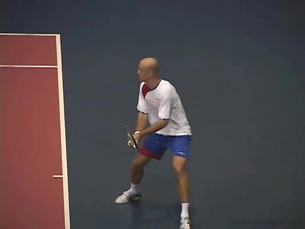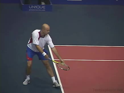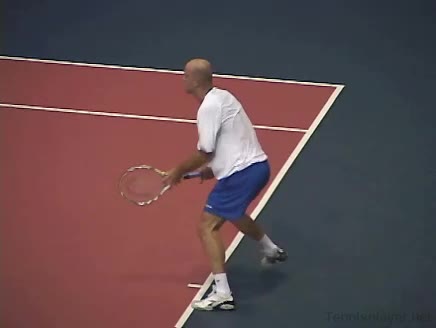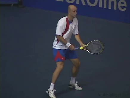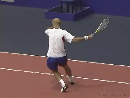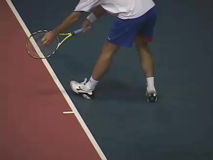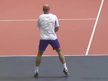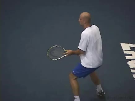 Ivan Ljubicic's backhand while moving back from a neutral court position, filmed from the front. His hips stay relatively closed as he retreats, with a deep knee bend on the outside leg helping him load before driving up and through the one-handed backhand.