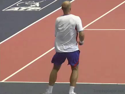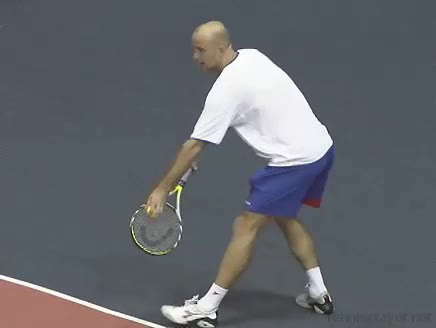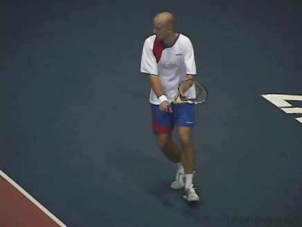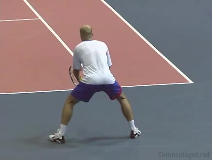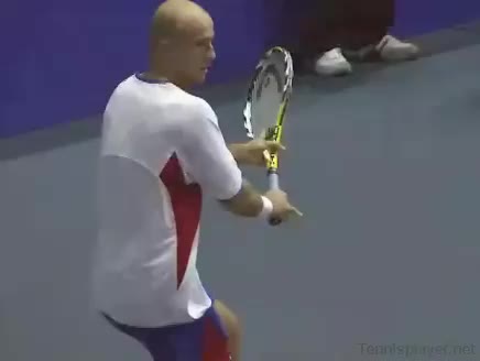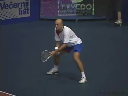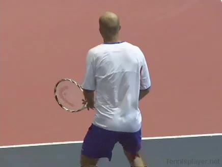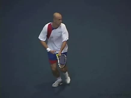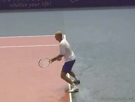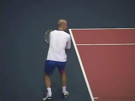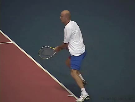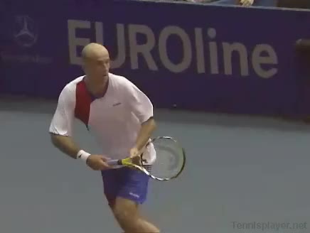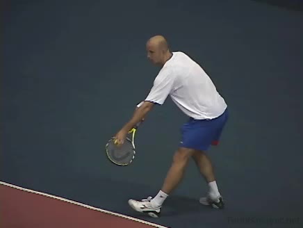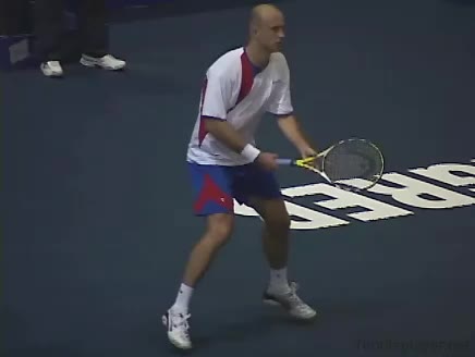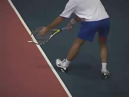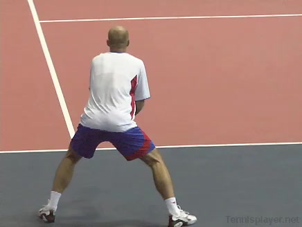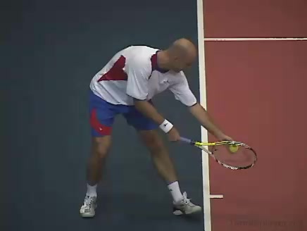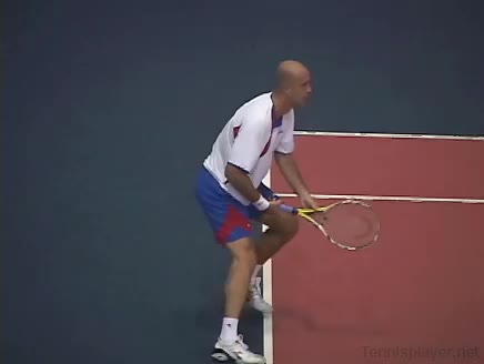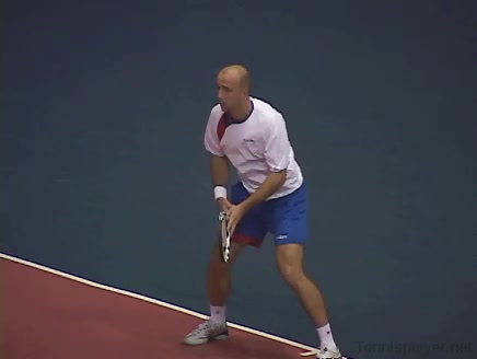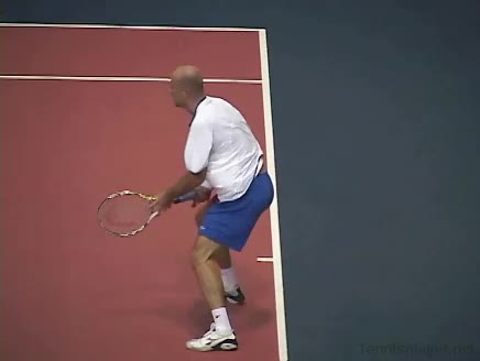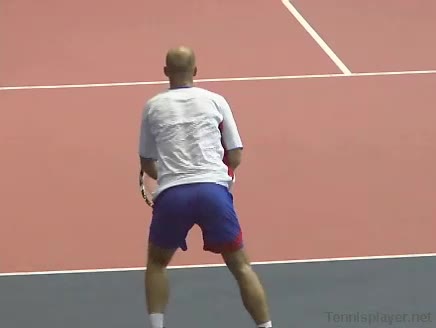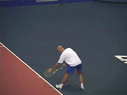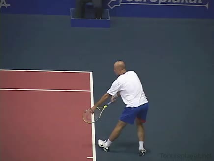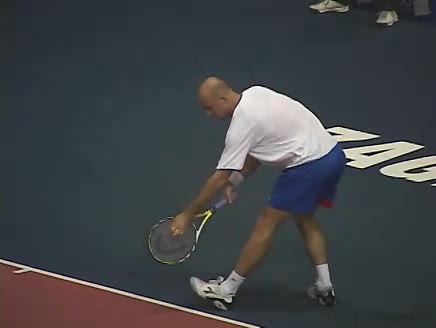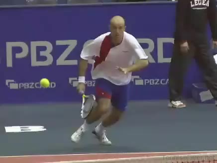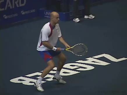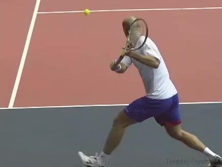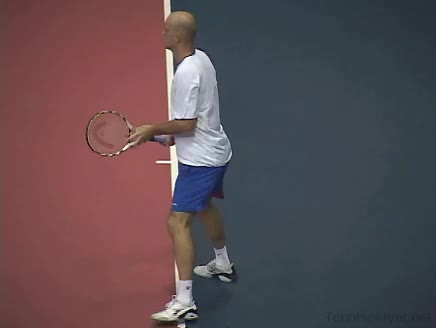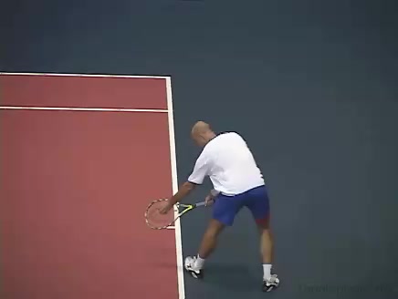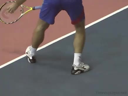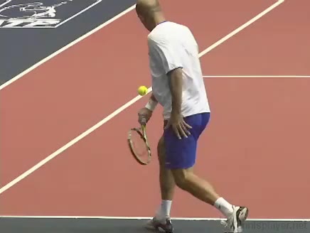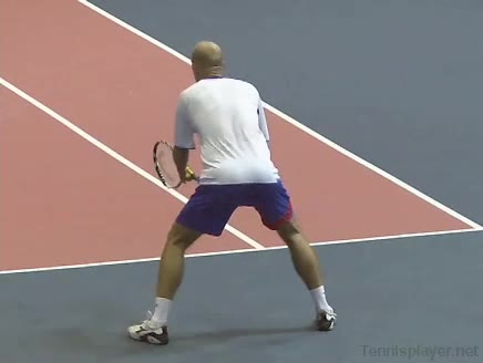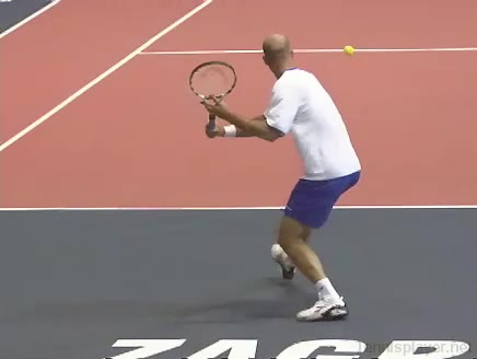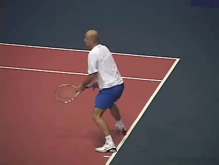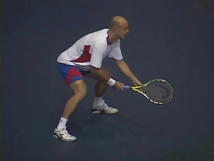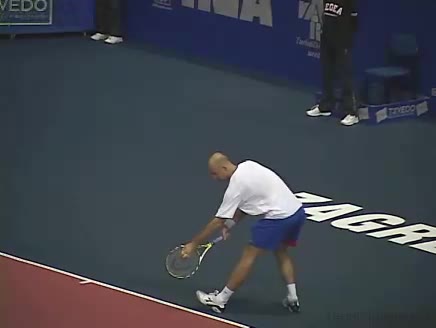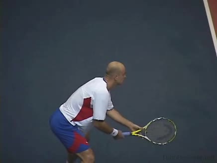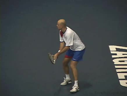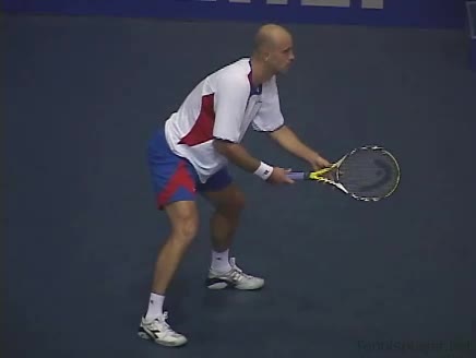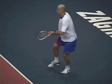 Ivan Ljubicic's backhand while moving back from a neutral court position, filmed from the front. His hips stay relatively closed as he retreats, with a deep knee bend on the outside leg helping him load before driving up and through the one-handed backhand.