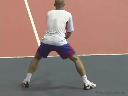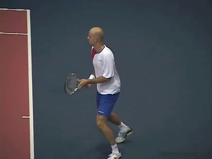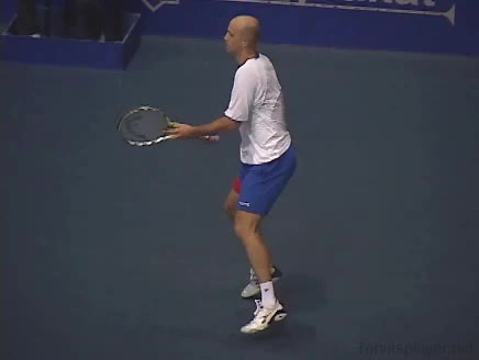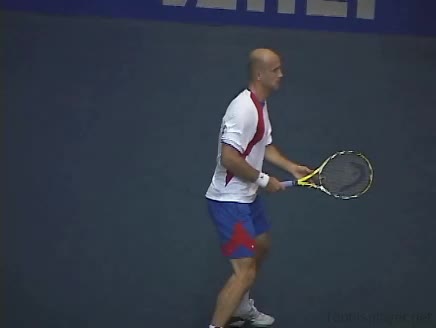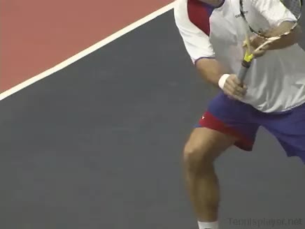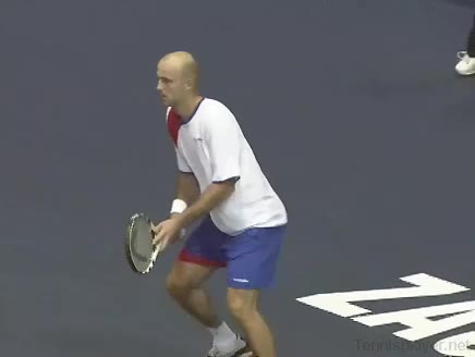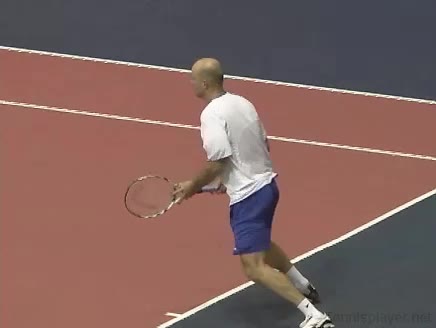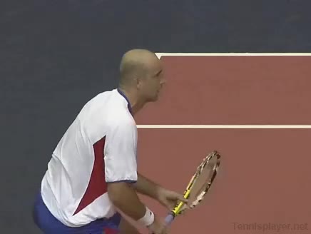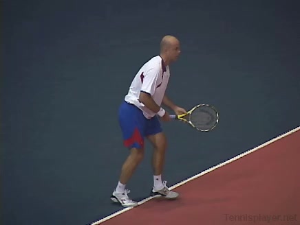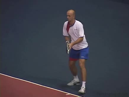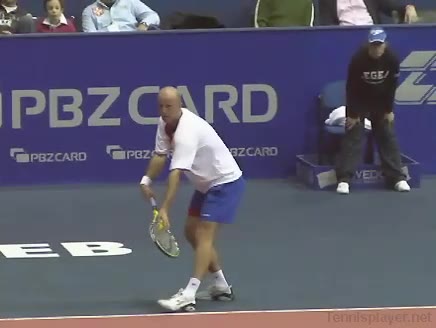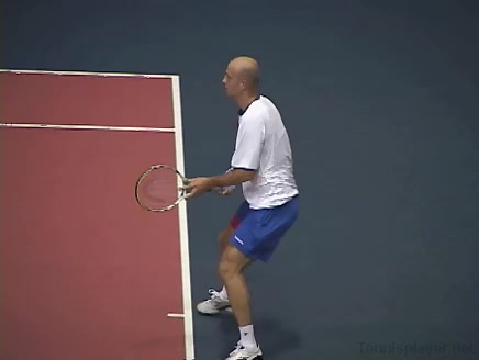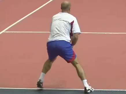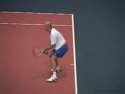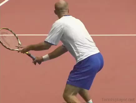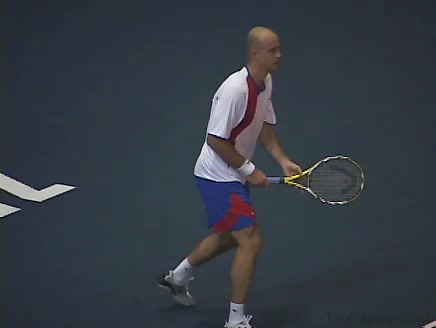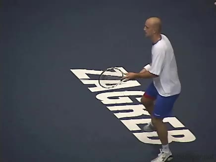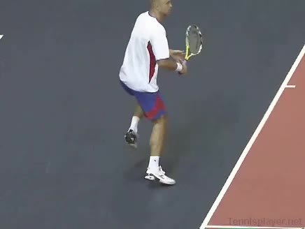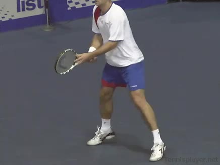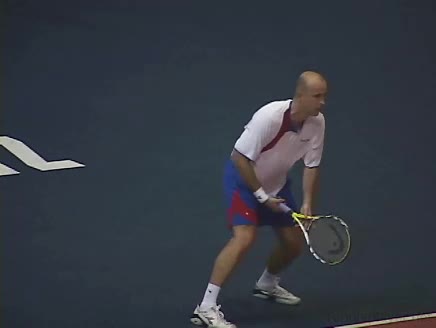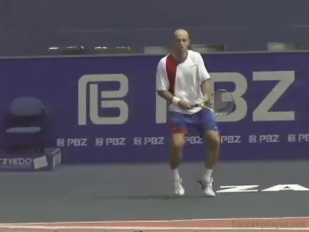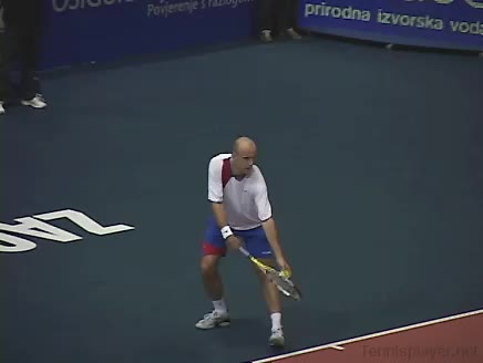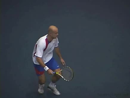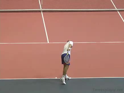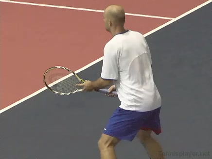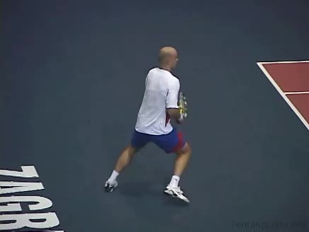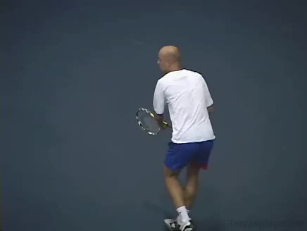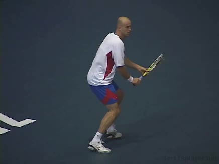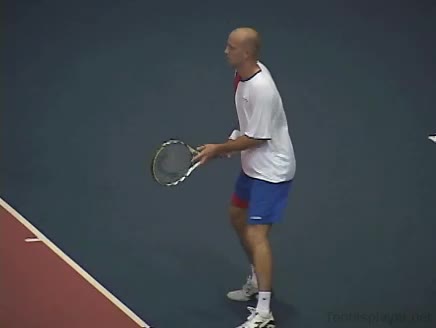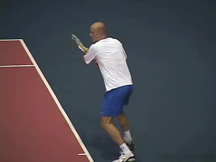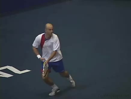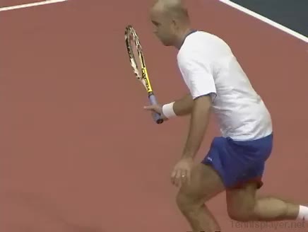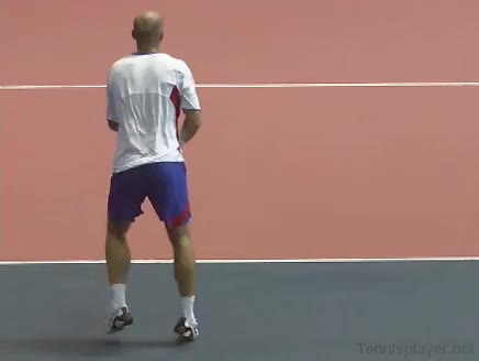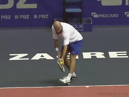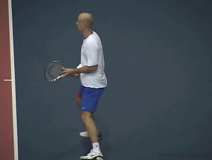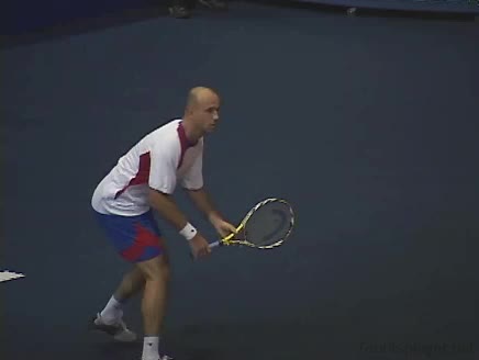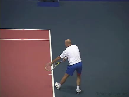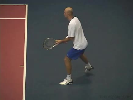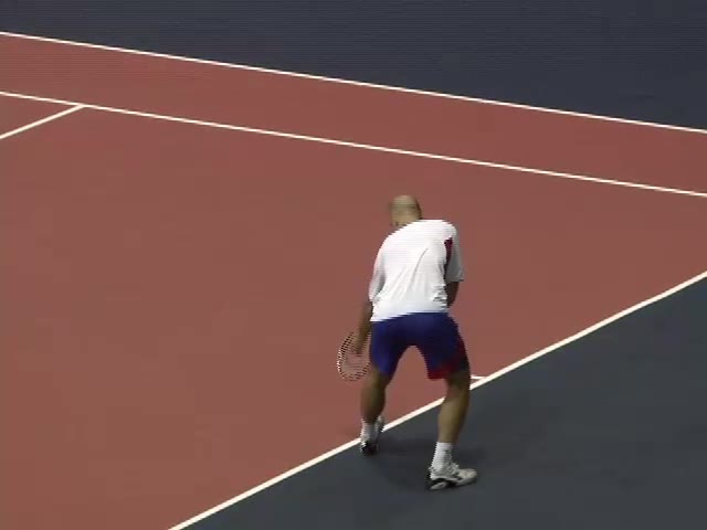 Ivan Ljubicic's backhand while moving back from a neutral court position, filmed from the front. His hips stay relatively closed as he retreats, with a deep knee bend on the outside leg helping him load before driving up and through the one-handed backhand.