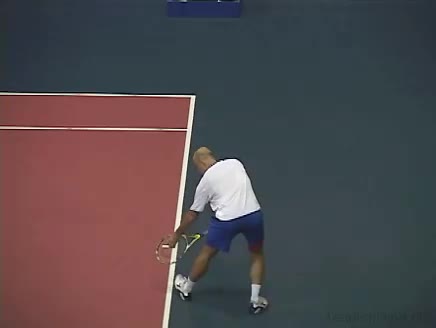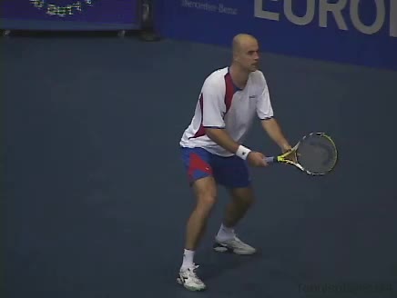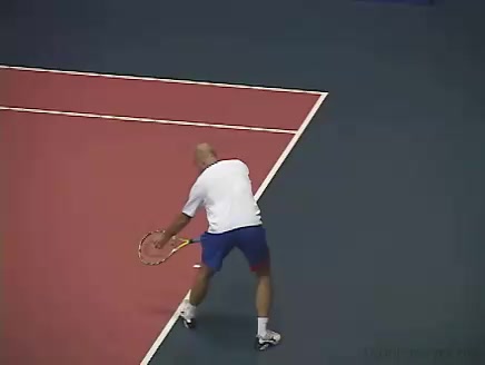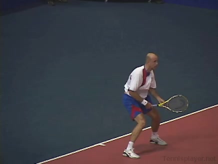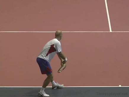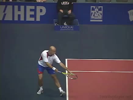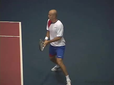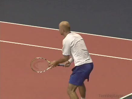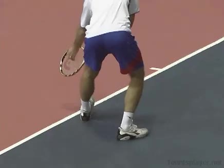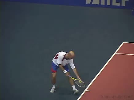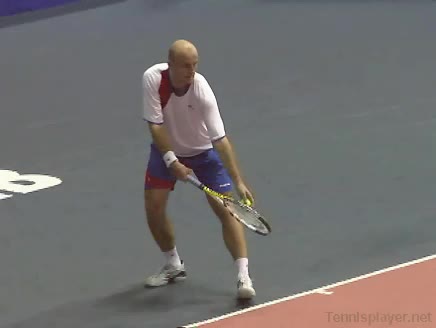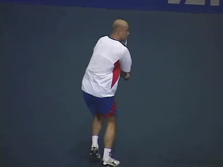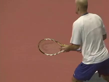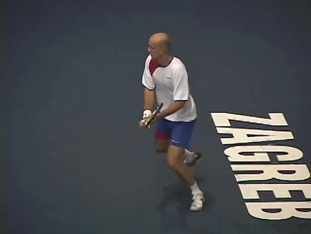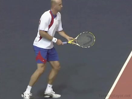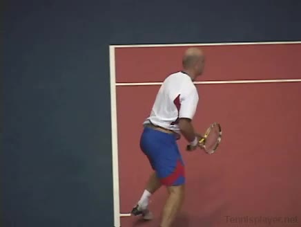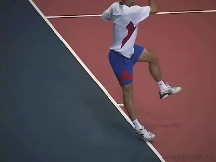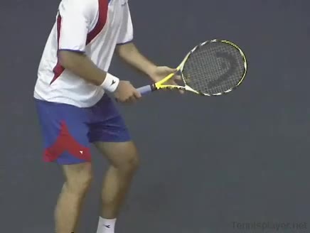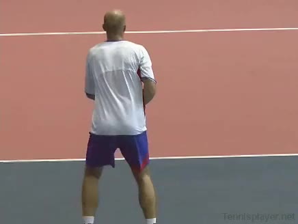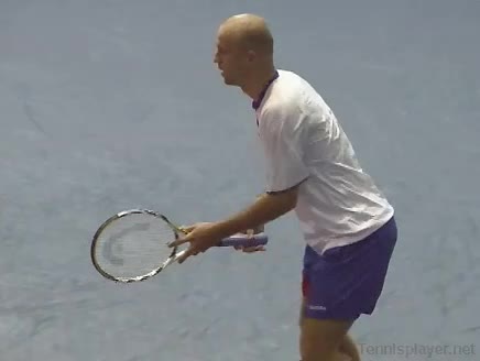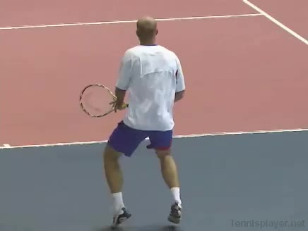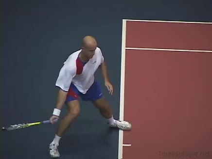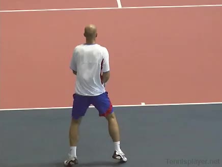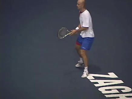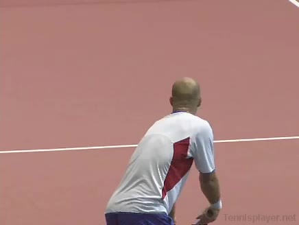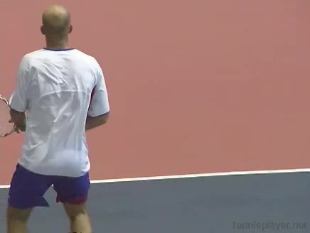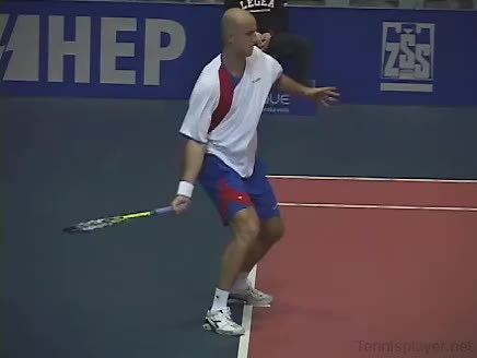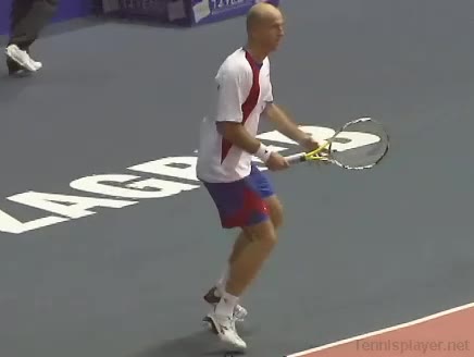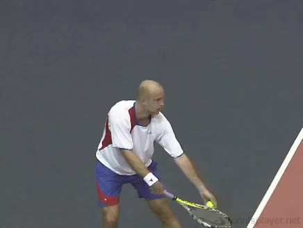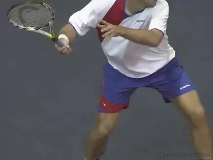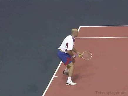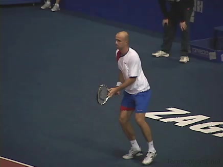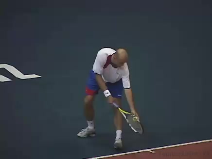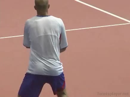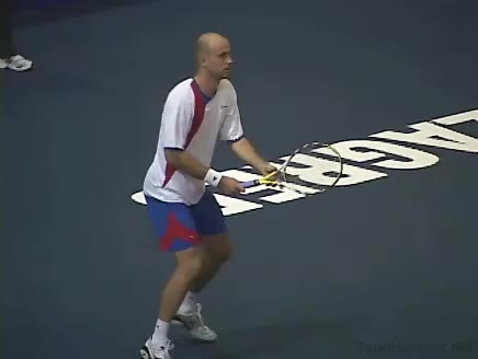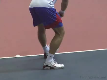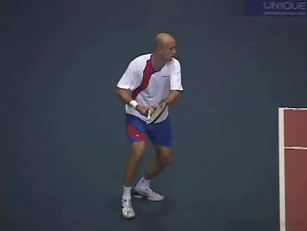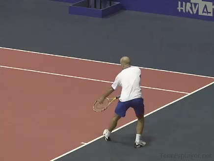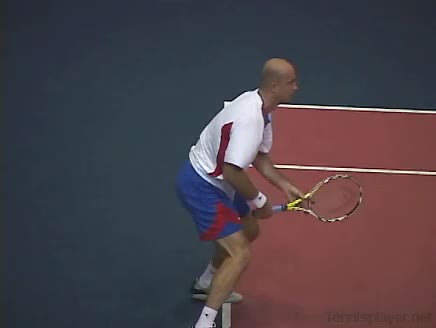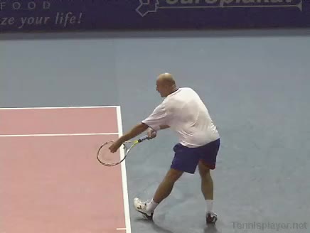 Ivan Ljubicic's backhand while moving back from a neutral court position, filmed from the front. His hips stay relatively closed as he retreats, with a deep knee bend on the outside leg helping him load before driving up and through the one-handed backhand.