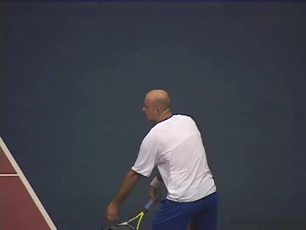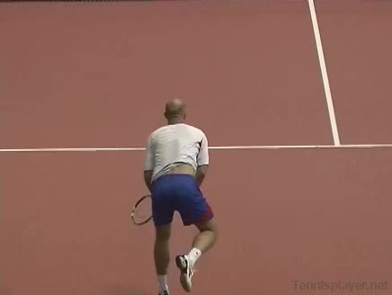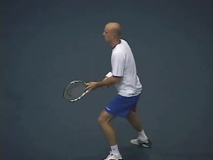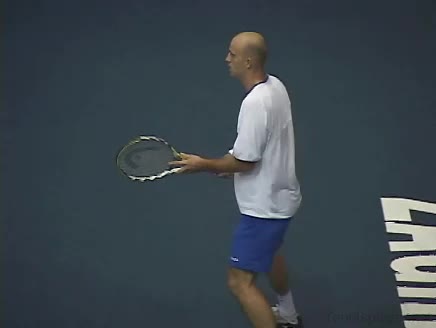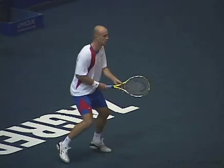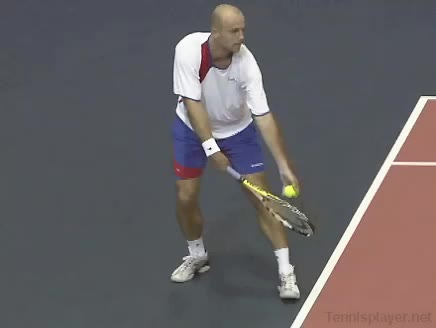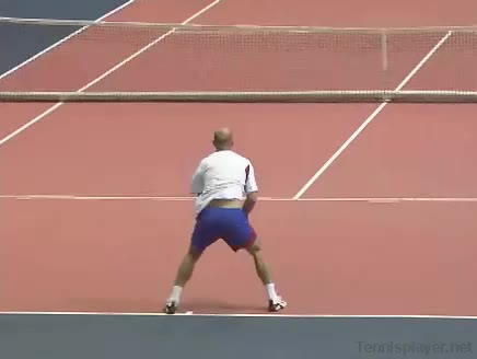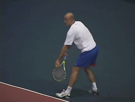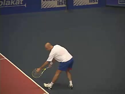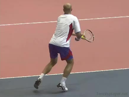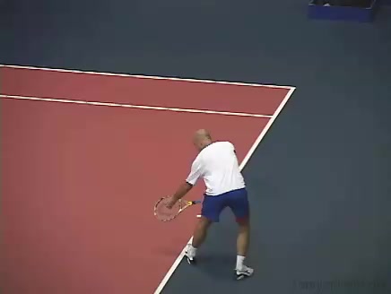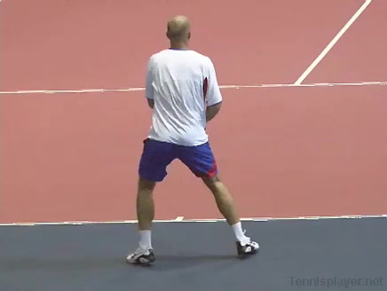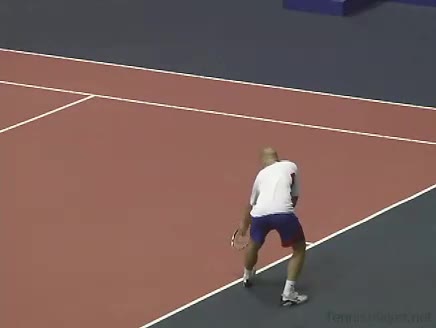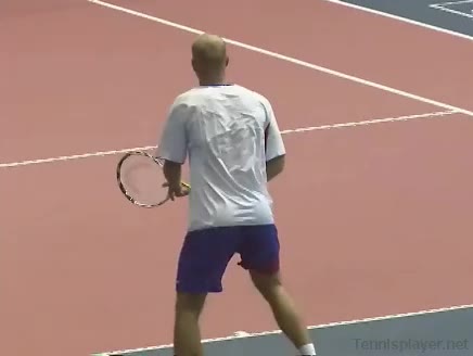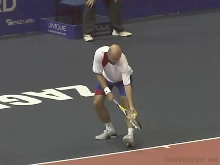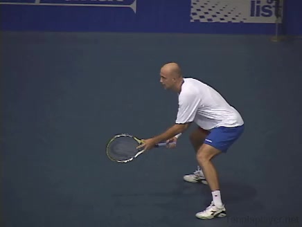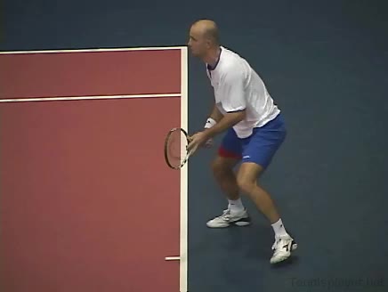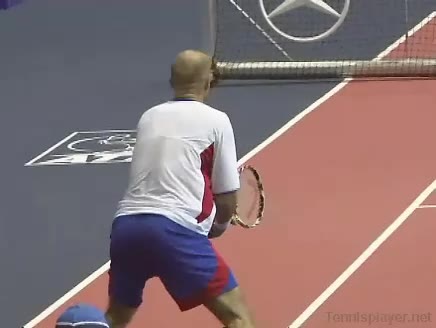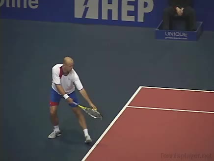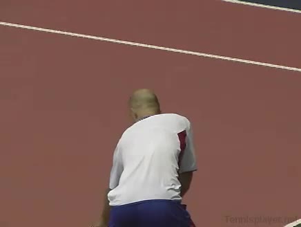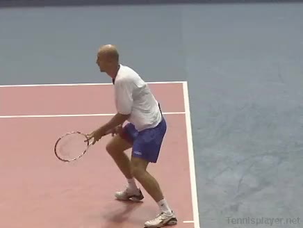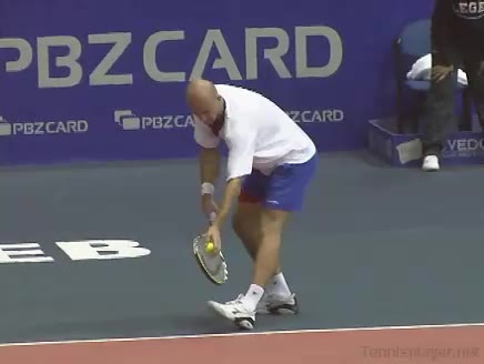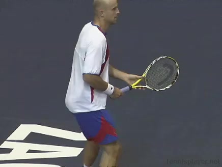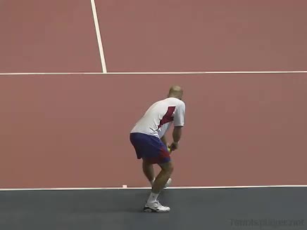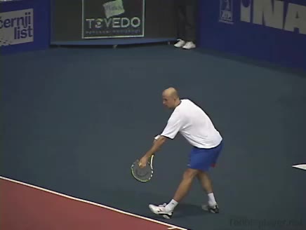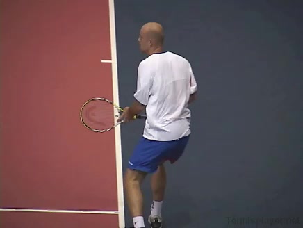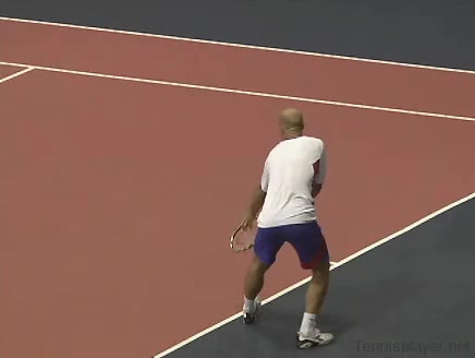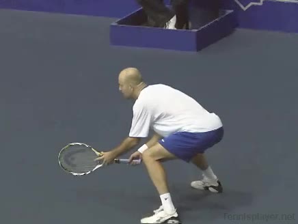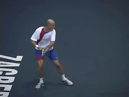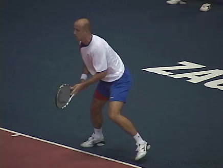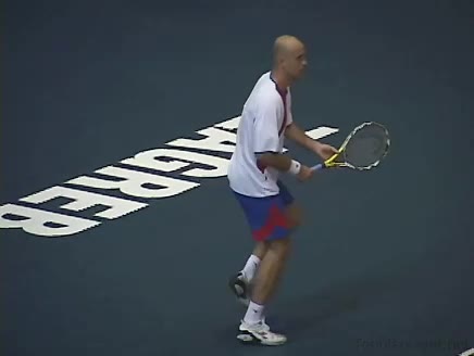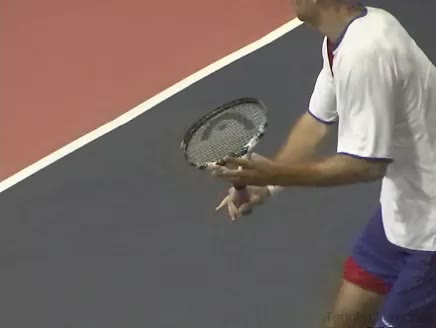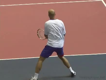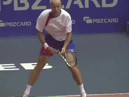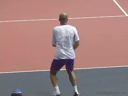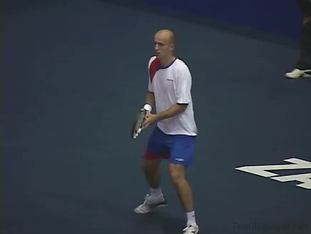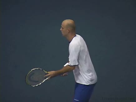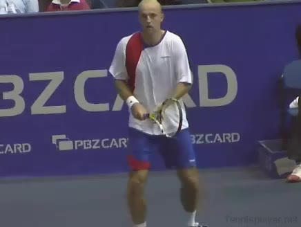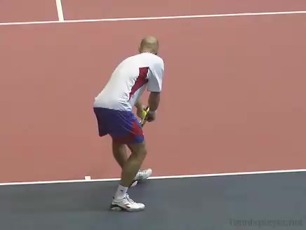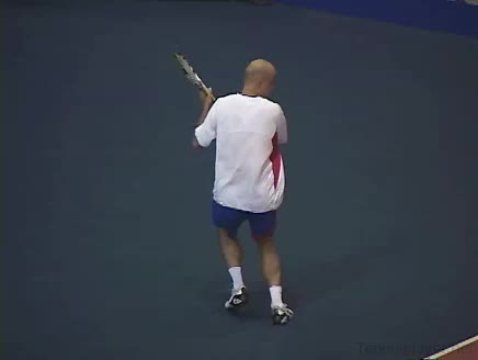 Ivan Ljubicic's backhand while moving back from a neutral court position, filmed from the front. His hips stay relatively closed as he retreats, with a deep knee bend on the outside leg helping him load before driving up and through the one-handed backhand.