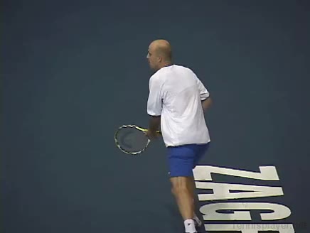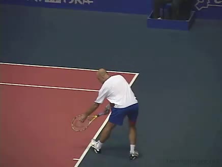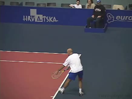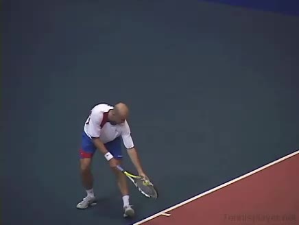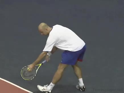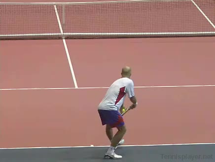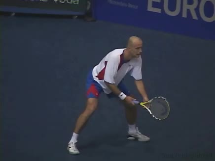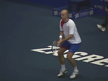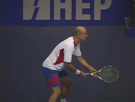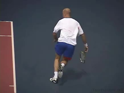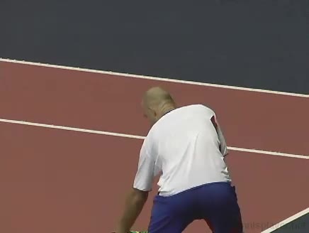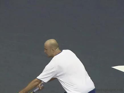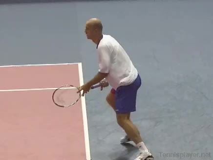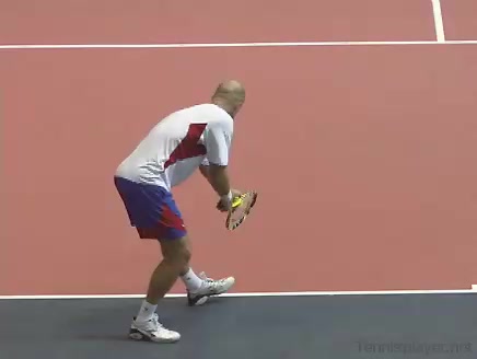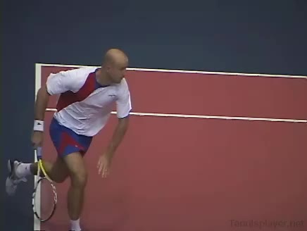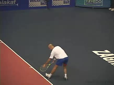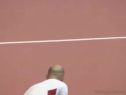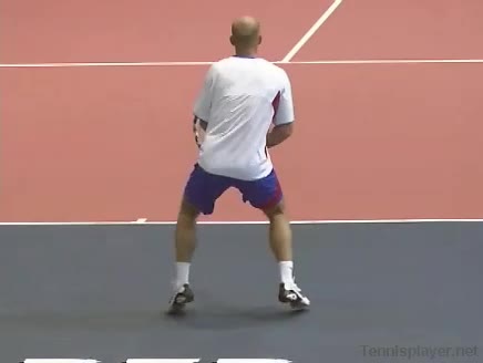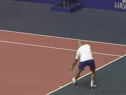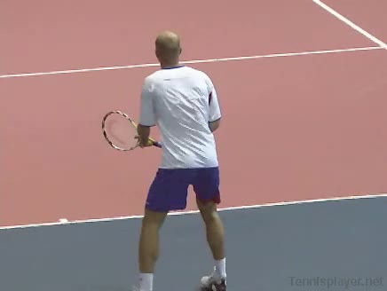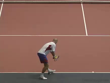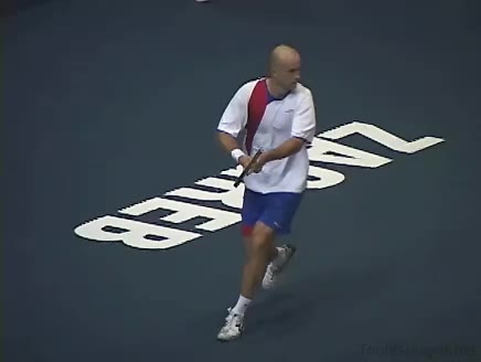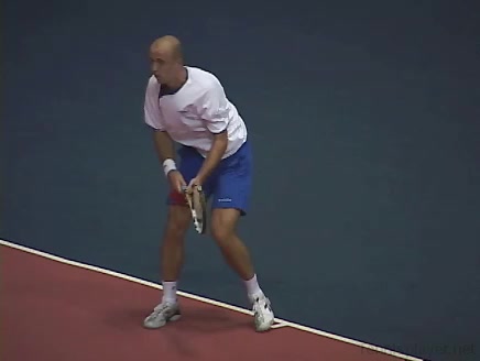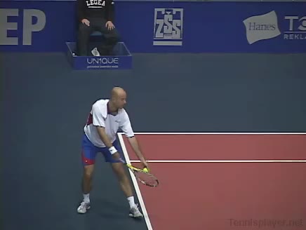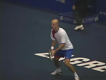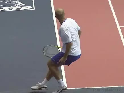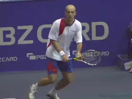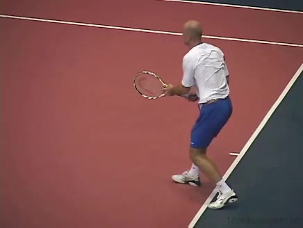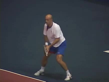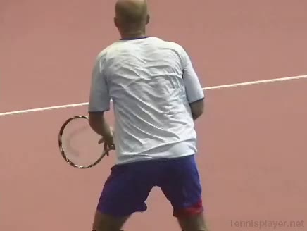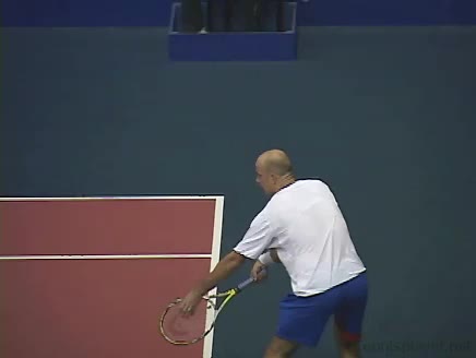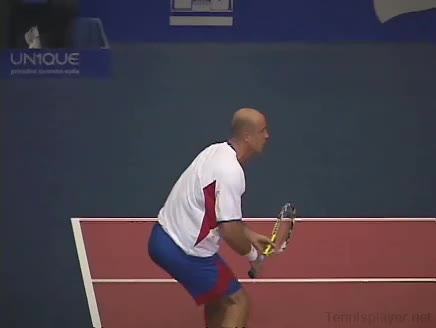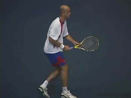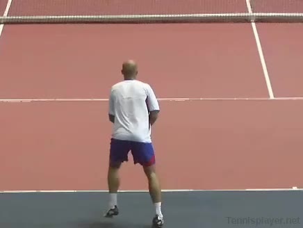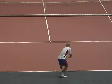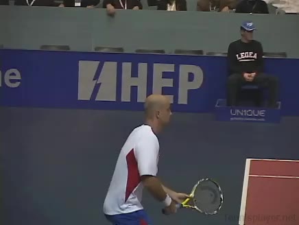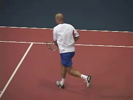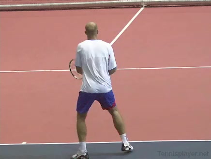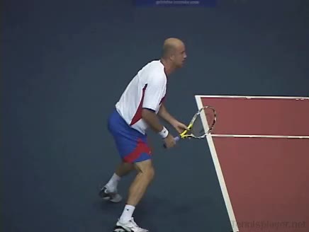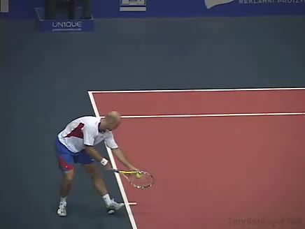 Ivan Ljubicic's backhand while moving back from a neutral court position, filmed from the front. His hips stay relatively closed as he retreats, with a deep knee bend on the outside leg helping him load before driving up and through the one-handed backhand.