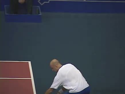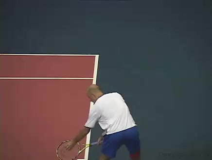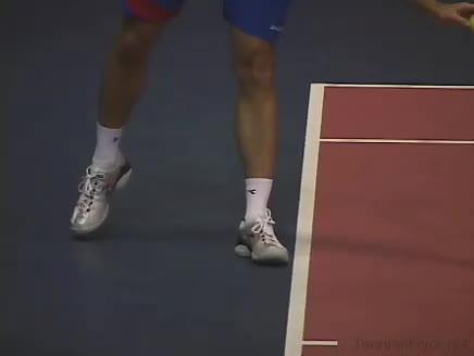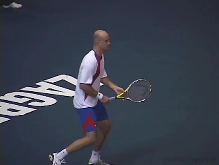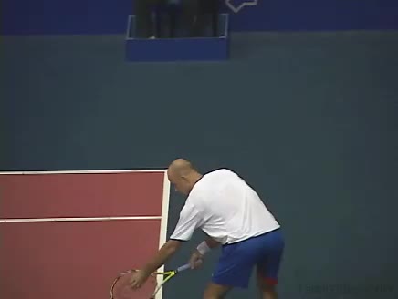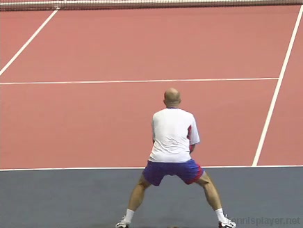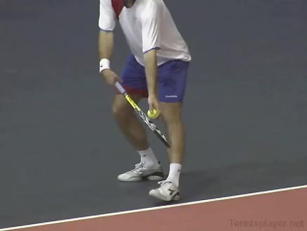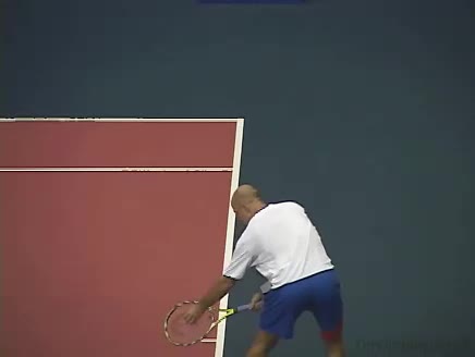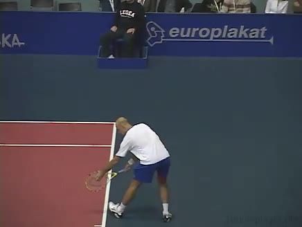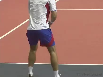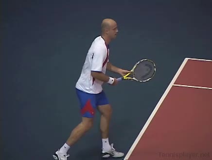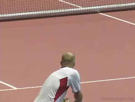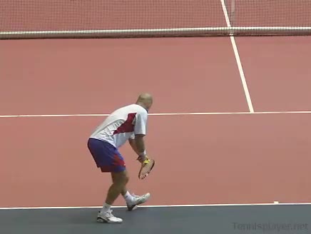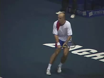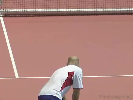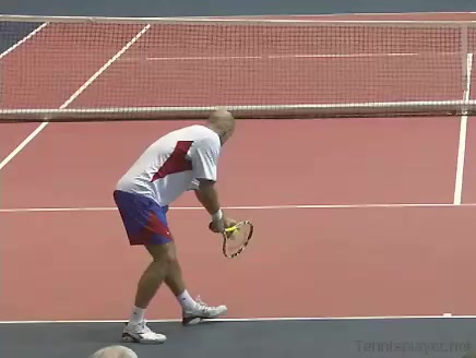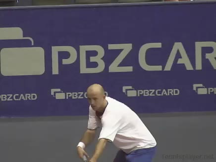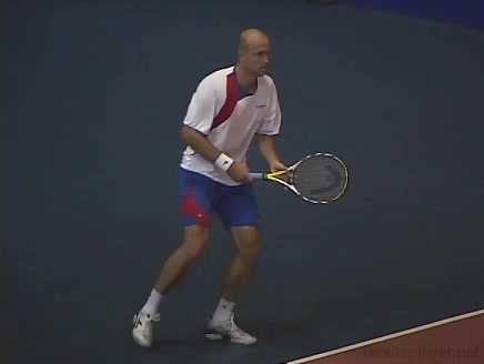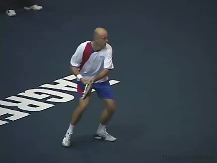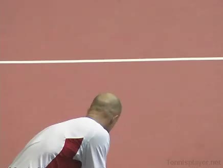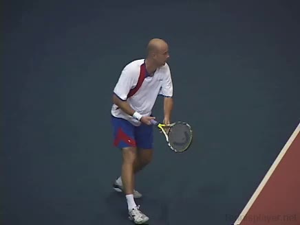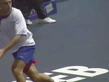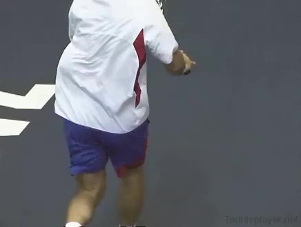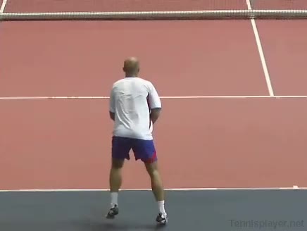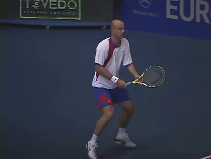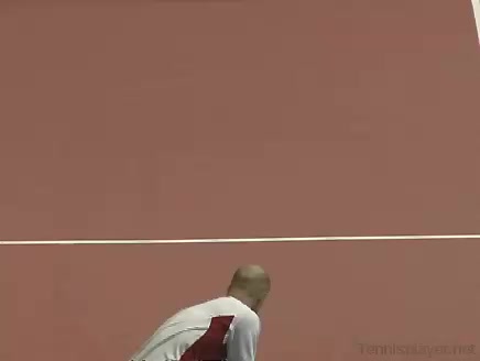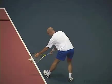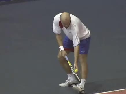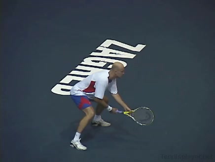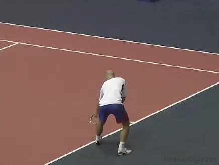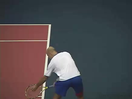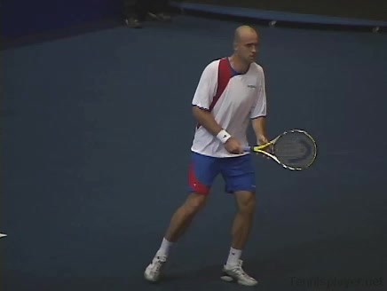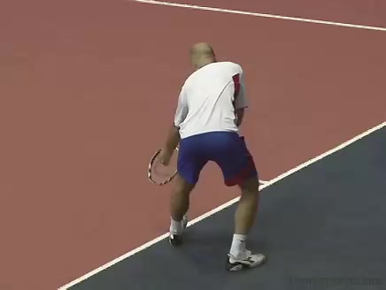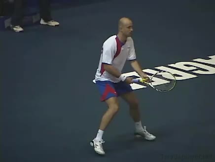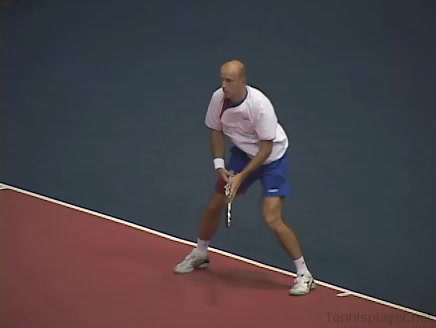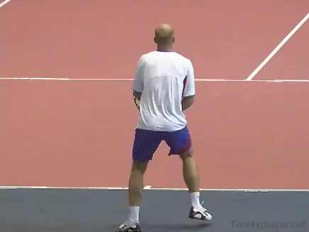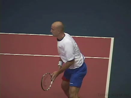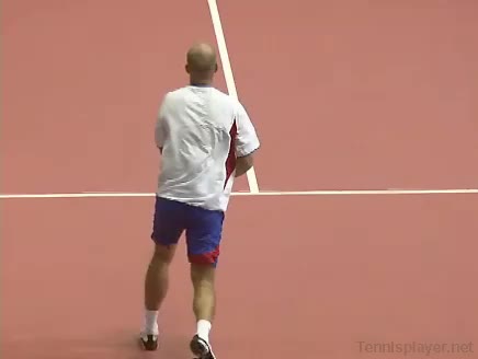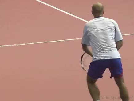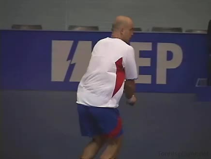 Ivan Ljubicic's backhand while moving back from a neutral court position, filmed from the front. His hips stay relatively closed as he retreats, with a deep knee bend on the outside leg helping him load before driving up and through the one-handed backhand.