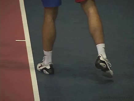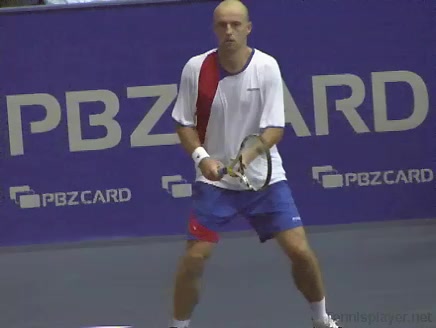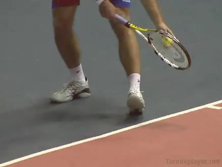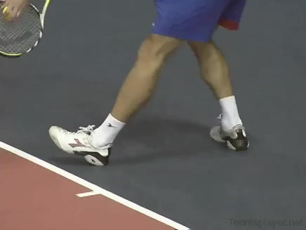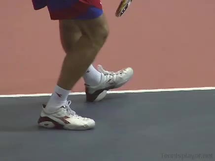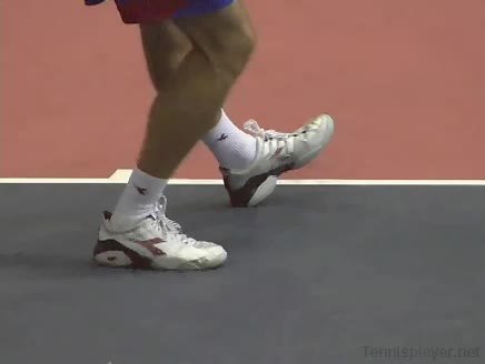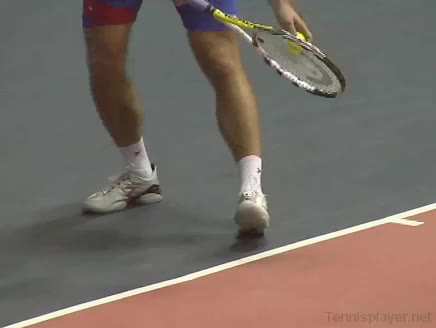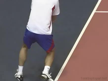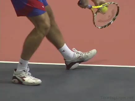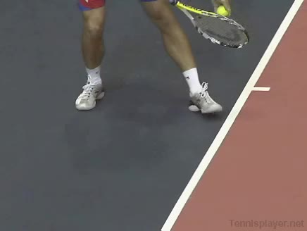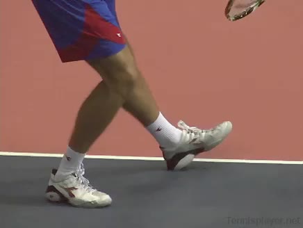Ivan Ljubicic's backhand from the center of the court in a closed stance, filmed from the front. His feet set on a strong closed base with the front foot stepping diagonally into the court before he uses a couple of small recovery steps to get back to a neutral position on the baseline.