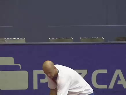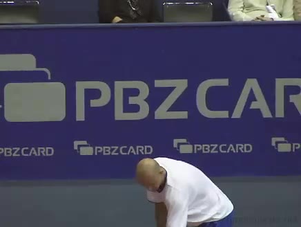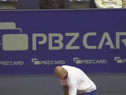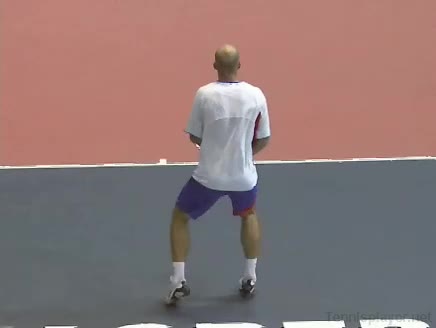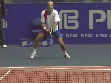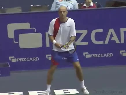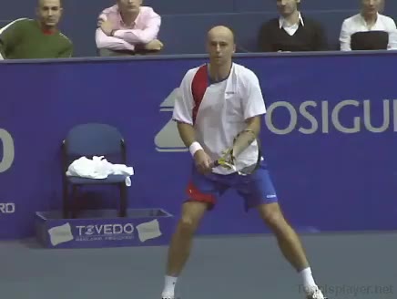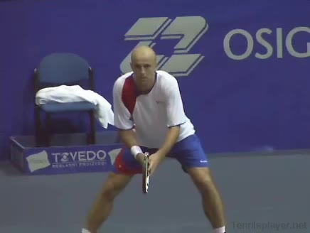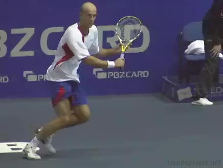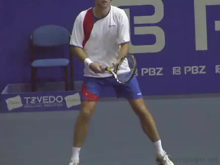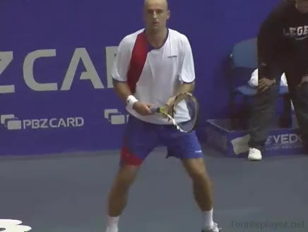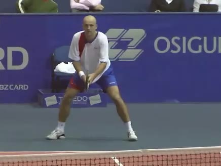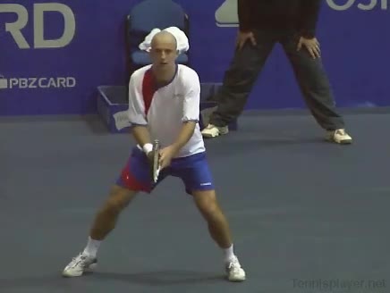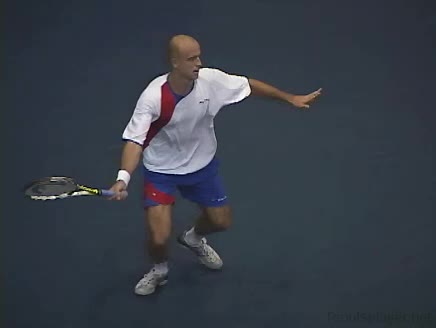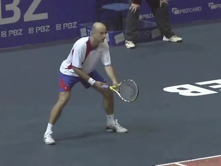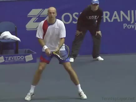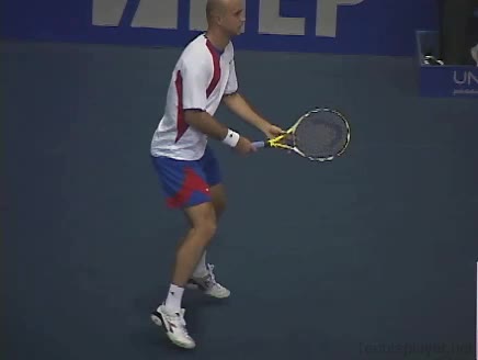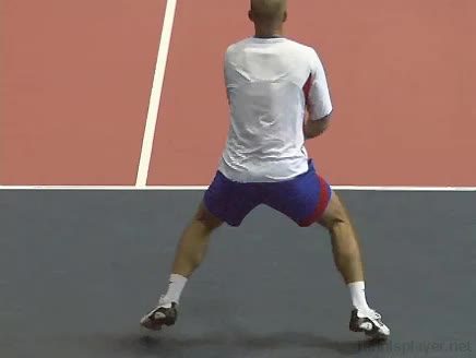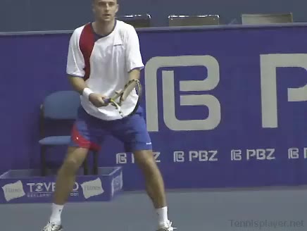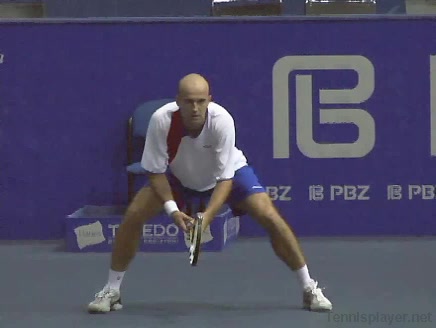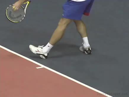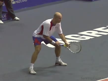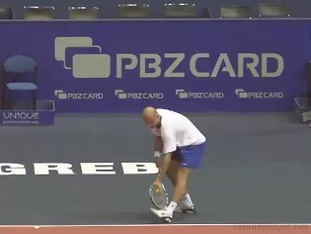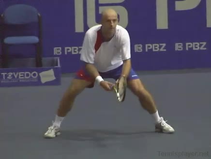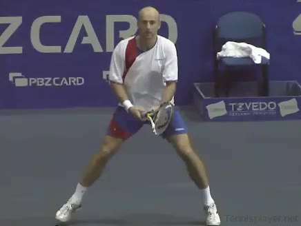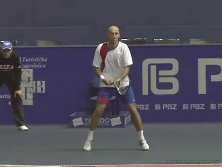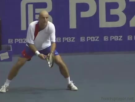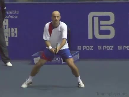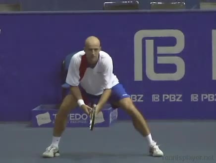 Ivan Ljubicic's wide backhand from the front, filmed from a front angle. His hips stay relatively closed as he plants the outside leg, with a noticeable knee bend and push off that drives his body laterally into the wide ball.