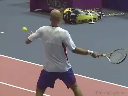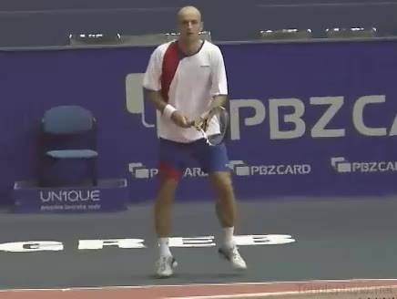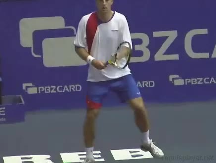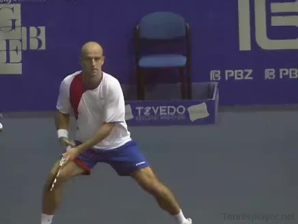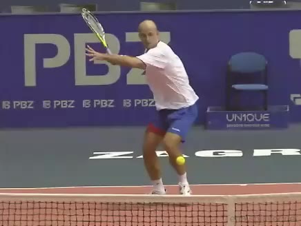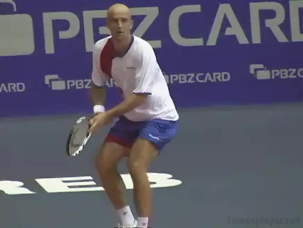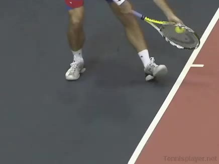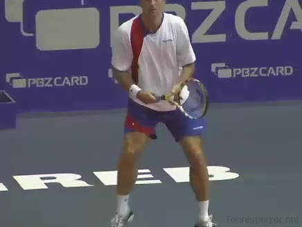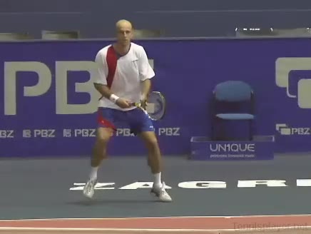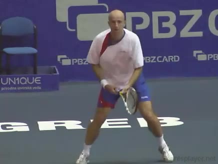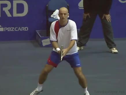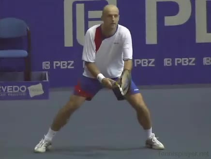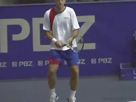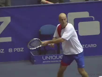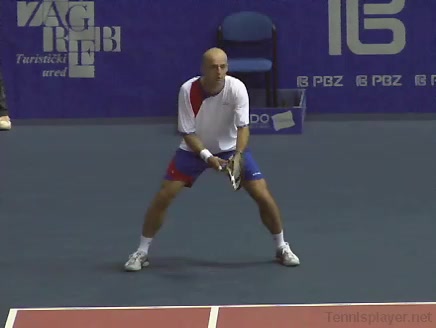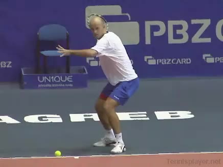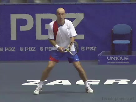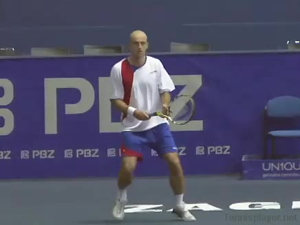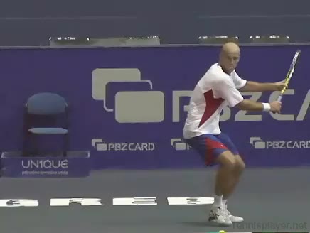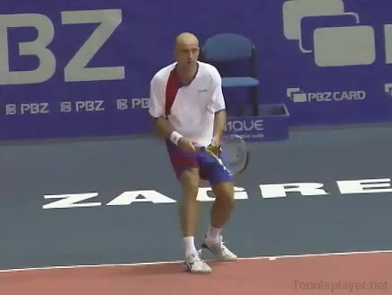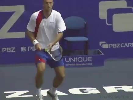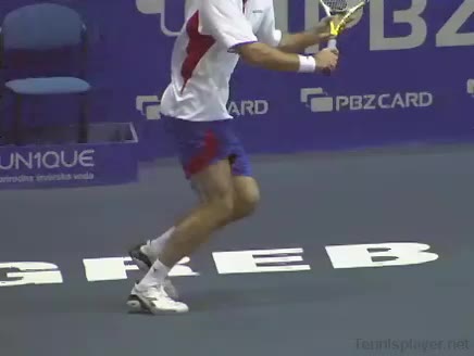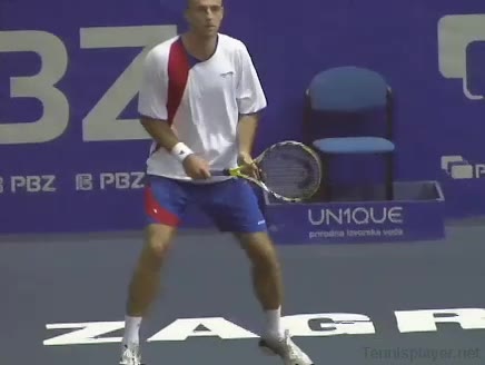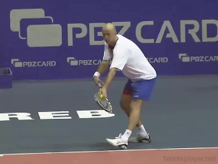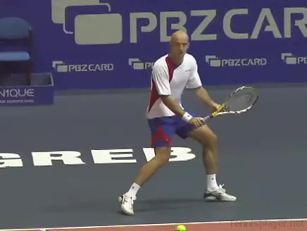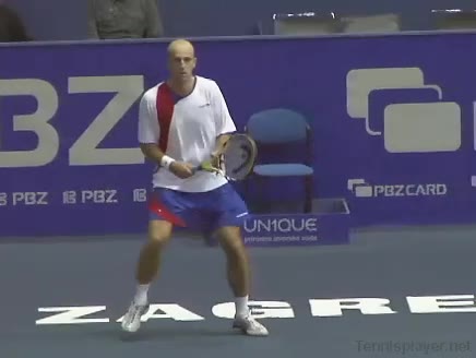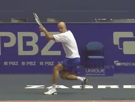 Ivan Ljubicic's backhand from the center of the court in a closed stance, filmed from the front. His closed hips and deep knee bend load the rear leg, then drive forward as the front hip clears through contact.