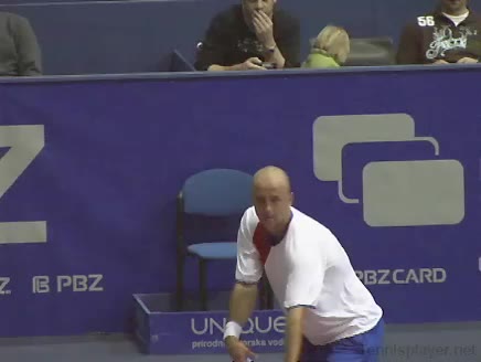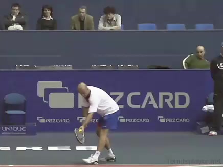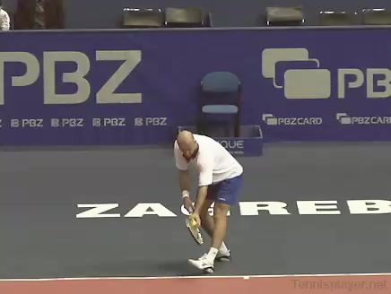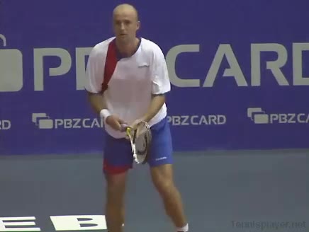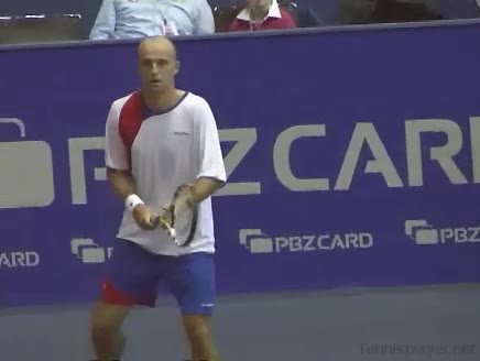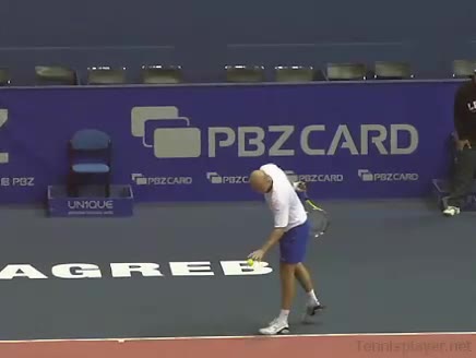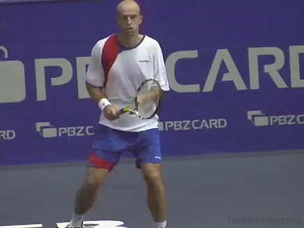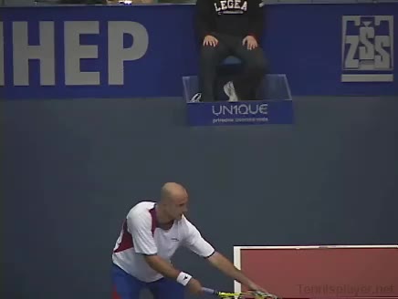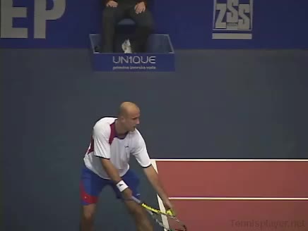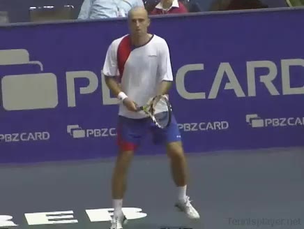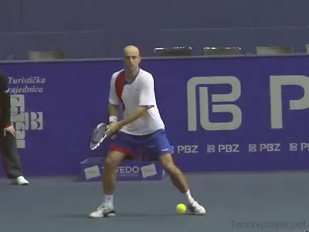 Ivan Ljubicic's backhand slice from a central court position, filmed from the side. His shoulders rotate early to set the racquet path, then his trunk uncoils in a compact motion with limited upper-body extension through contact.