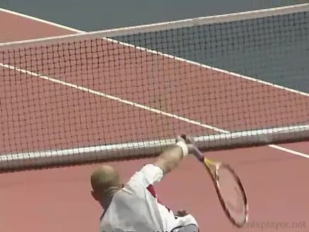Ivan Ljubicic's backhand slice from center court, filmed from the side. His follow-through finishes with the racquet hand extended forward while his weight transfers onto the front foot, bringing him quickly back into a compact ready position.