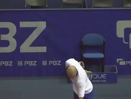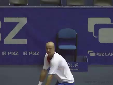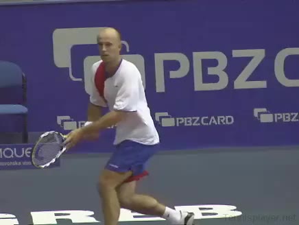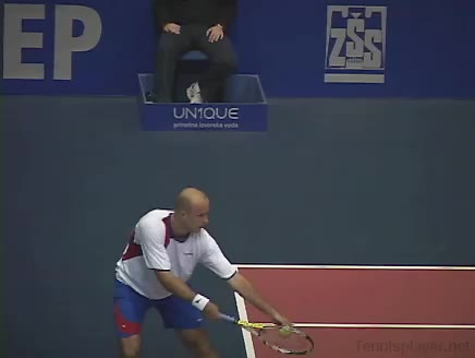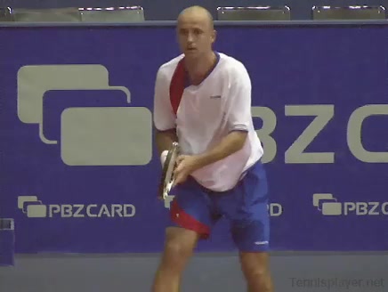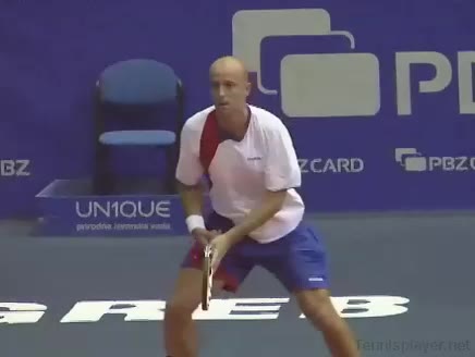 Ivan Ljubicic's backhand slice from the ad side, filmed from the side. After contact his racquet finishes out in front with the non-hitting arm extended back for counterbalance as he transfers weight forward and quickly recovers toward a neutral ready position.