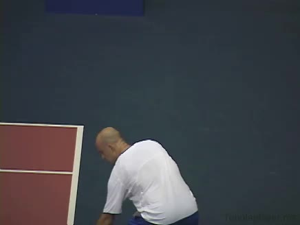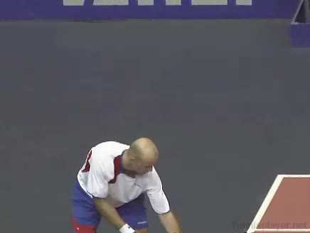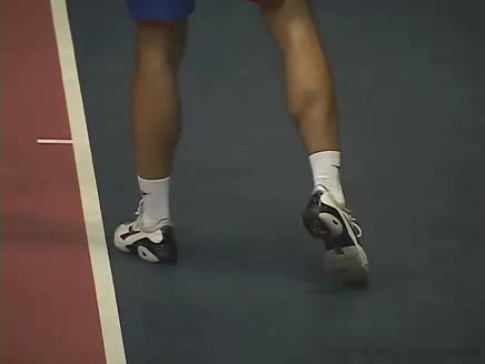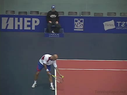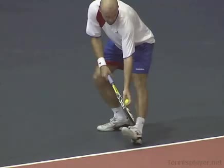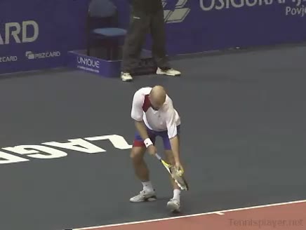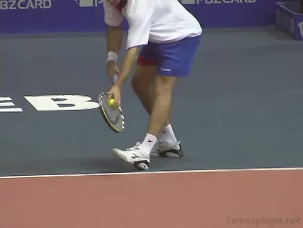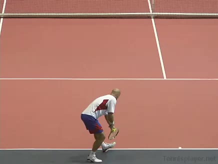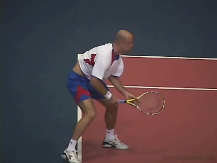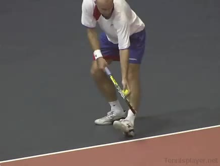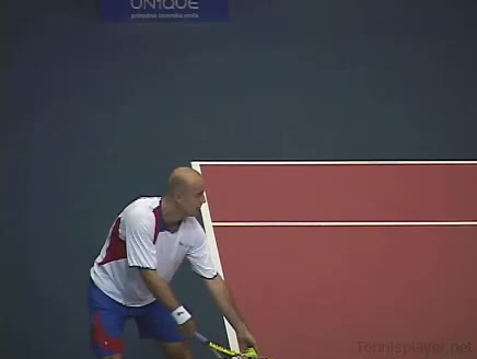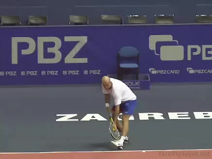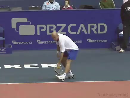 Ivan Ljubicic's backhand slice from the center of the court, filmed from the side. His hips stay relatively closed as he steps forward, with a pronounced front-knee bend helping him stay low through contact.