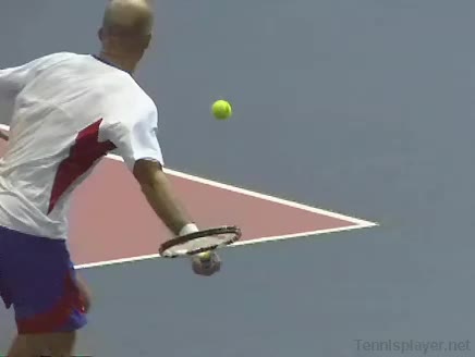 Ivan Ljubicic's wide backhand from a closed stance on the baseline, filmed from the front. His one-handed backhand contact is made slightly in front of his body with the racket face relatively square to the incoming ball, and the racket head accelerates upward along a steep low-to-high path.