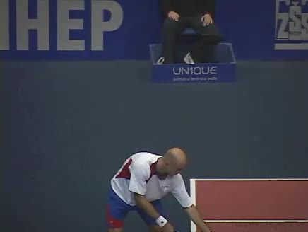 Ivan Ljubicic's backhand slice half-volley from the center of the court, filmed from the side. At contact, his racket face is slightly open with the ball struck just in front of his lead hip, and the racket traveling on a compact, downward-through-forward path with a firm wrist.