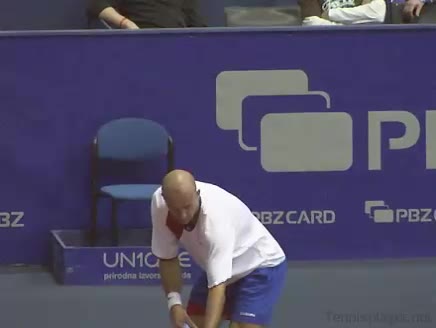 Ivan Ljubičić's backhand while moving back from a neutral position, filmed from the front. His shoulders and trunk show a pronounced coiling on the unit turn, then uncoil in a clearly sequenced motion where the torso leads the arm through contact.