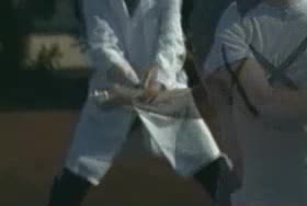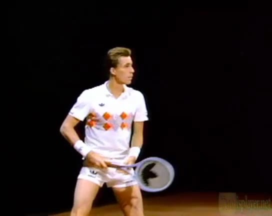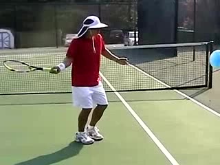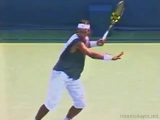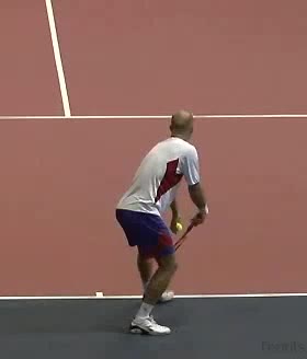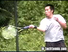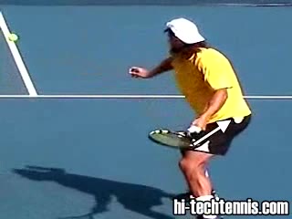 The Forehand: A Spring Event (3 of 4) Jeff Counts's FH from the middle of the baseline, filmed from CourtLevel. His semi-western grip and pronounced wrist lag are clearly visible as the racquet head stays relaxed and laid back well behind the hand before uncoiling into contact.