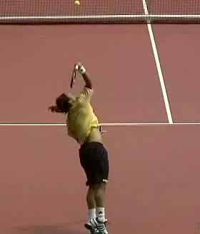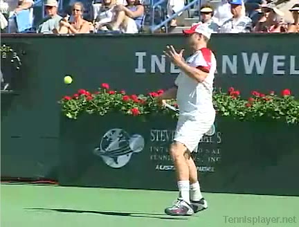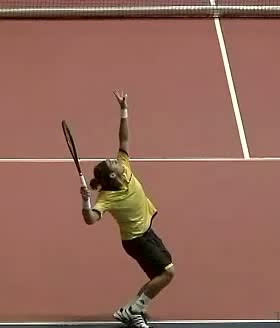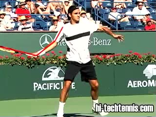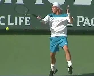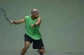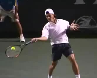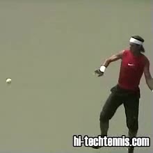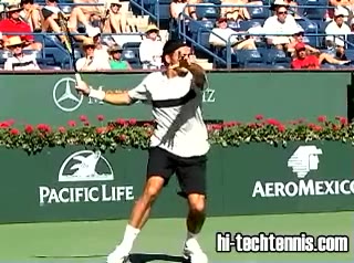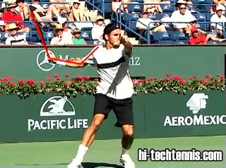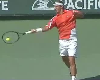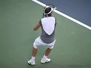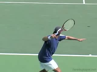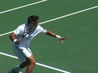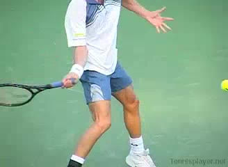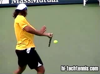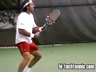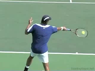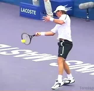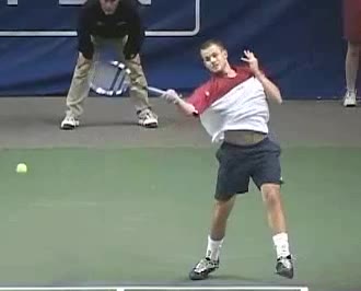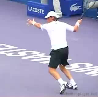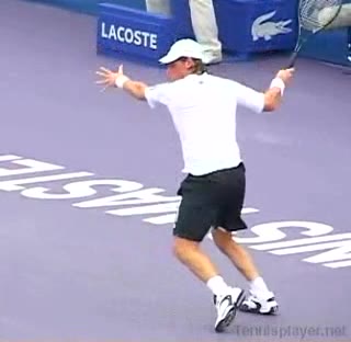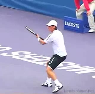 Your Strokes: Ron Milenko One-Handed Backhand Acasuso's forehand from the middle of the court, filmed from a rear angle. His deep knee bend and strong push off the right leg are clearly visible as his hips uncoil into the shot.