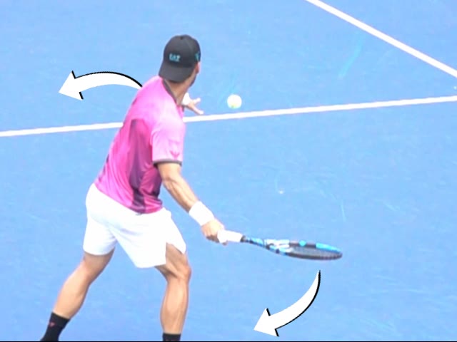 Your Strokes: Ching Lee Serve Ching's forehand from the middle of the court, filmed from a rear angle. His hips stay closed during the racquet drop while his knees remain deeply flexed, then the legs drive upward as the hips rotate into contact.