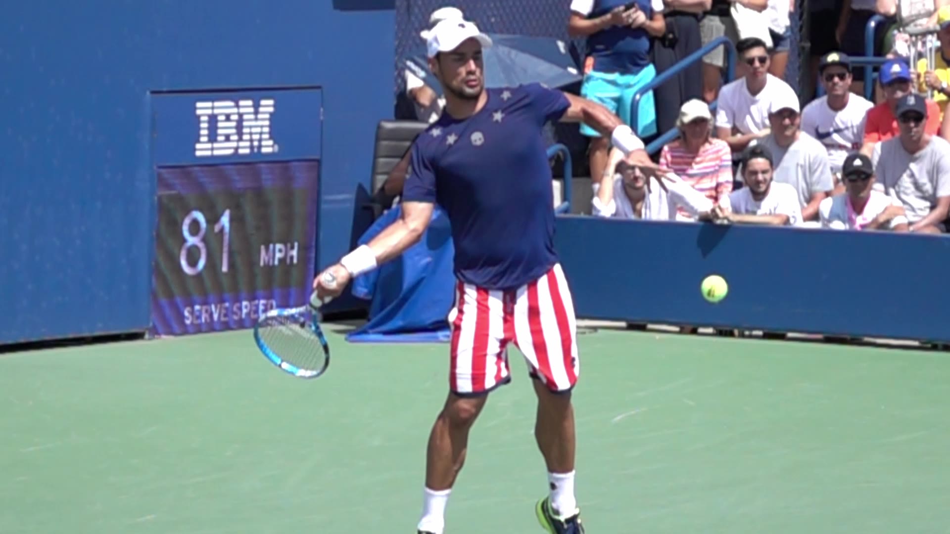 The Fognini Forehand (3 of 5) Jeff Counts’s forehand from the middle of the court, filmed from a side angle. His footwork pattern emphasizes a loaded open stance with a strong coil and uncoil through the hips, using a firm outside leg plant before rotating into contact.
