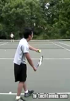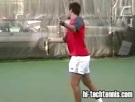 The Forehand: A Spring Event (2 of 4) Jeff Counts's FH from the Deuce side, filmed from a CourtLevel angle. His follow-through wraps high over the shoulder with the non-hitting hand staying in front of his body, helping him recover quickly back into a neutral ready position.