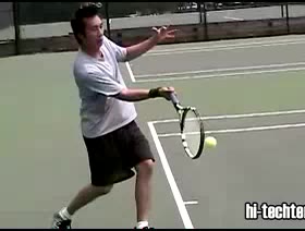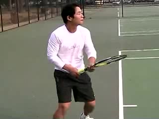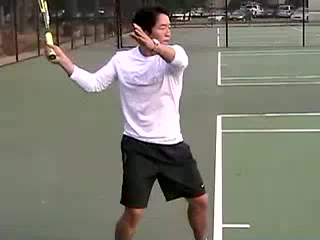 Your Strokes: Jon Chen Forehand (7 of 7) Jon Chen's forehand from the center of the baseline, filmed from a rear court-level angle. After contact he lets the racquet wrap fully around his shoulder while his non-hitting hand retracts toward his body and he quickly re-centers his stance into a ready position.