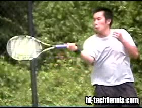 Your Strokes: Jon Chen Forehand (2 of 7) John's forehand preparation from the center of the baseline, filmed from a rear court-level angle. His semi-western grip is clearly set early with a relaxed wrist that stays laid back throughout the unit turn before accelerating forward.