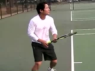 Your Strokes: Ching Lee Forehand (1 of 4) Ching Lee's forehand from a central court position, filmed from the front. His wiper-style follow-through finishes high across his body while his non-hitting hand stays out for balance before he recovers to a neutral ready position.