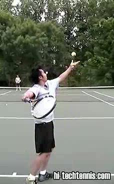 Your Strokes: Ching Lee Serve Player's serve toss motion from the center of the baseline, filmed from a front CourtLevel angle. After releasing the ball, the tossing arm stays extended upward briefly before dropping as the body weight begins to shift forward into the court.