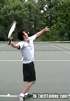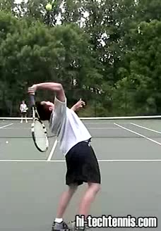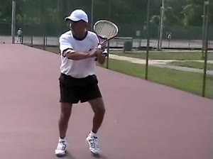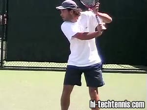 The Forehand: A Spring Event (1 of 4) Jeff Counts's forehand from the center of the court, filmed from a rear court-level angle. His follow-through finishes high with the racquet wrapping over his shoulder as his weight transfers onto his front foot and he quickly recovers toward a neutral ready position.