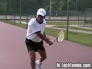 Your Strokes: Ron Milenko One-Handed Backhand Ron's forehand from the middle of the court, filmed from a side angle. At contact, his racket head lags slightly behind the hand with a closed racket face and the ball meeting the strings just in front of his lead hip.