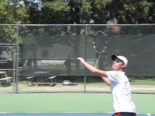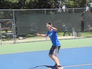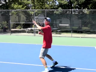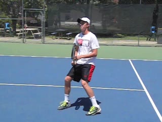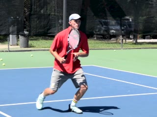 Jeremiah Walsh's defensive forehand from a neutral court position, filmed from a side angle. His follow-through finishes high in front of his head while his weight transfers slightly backward into a recovery split step.
