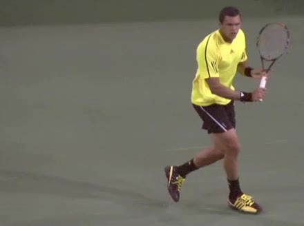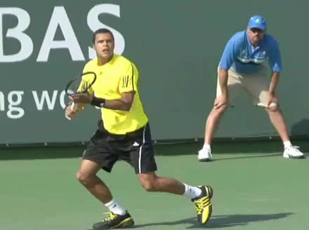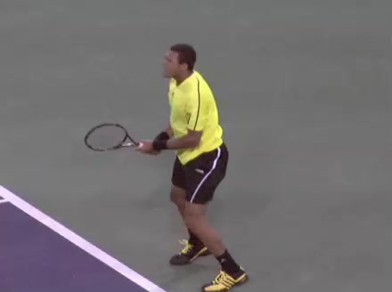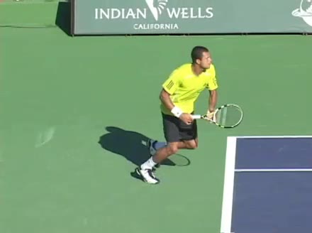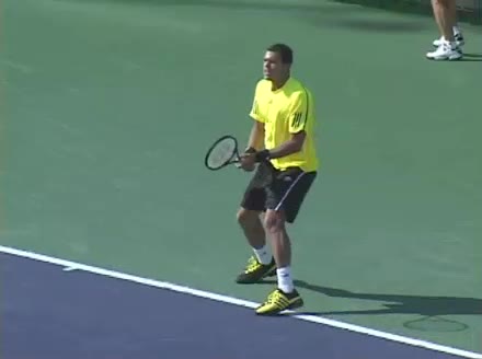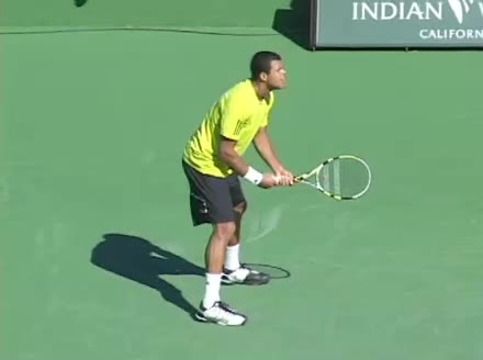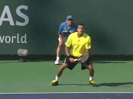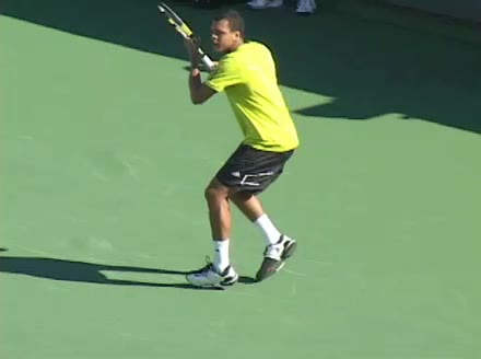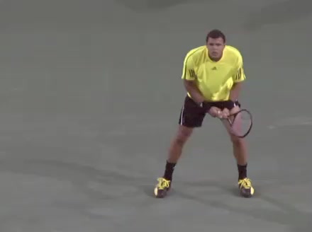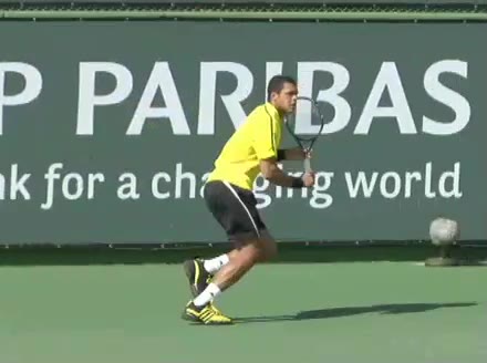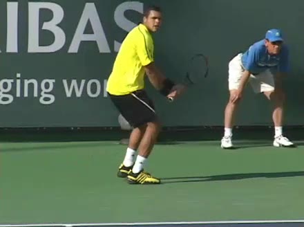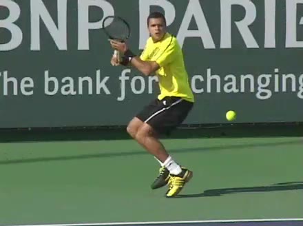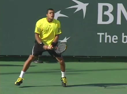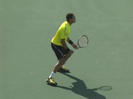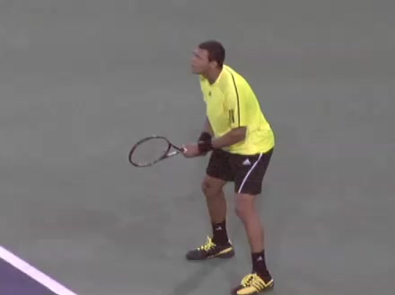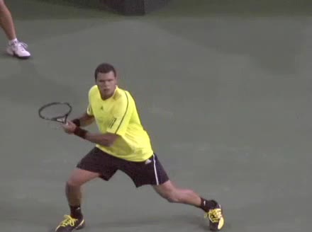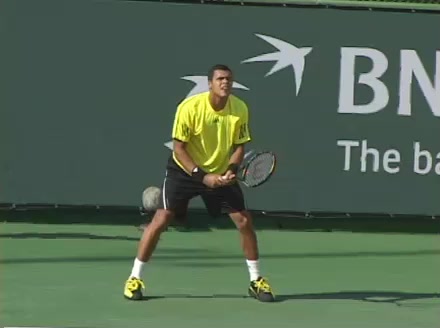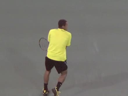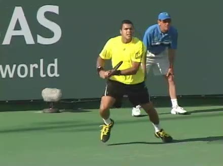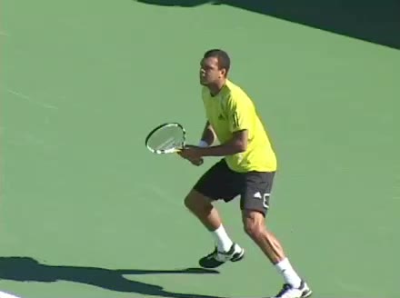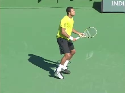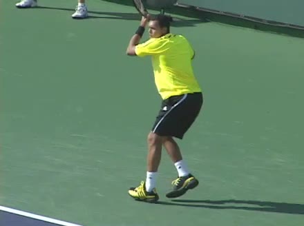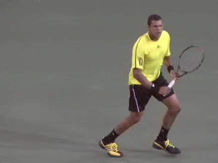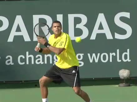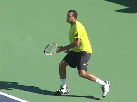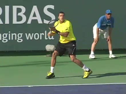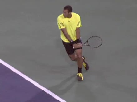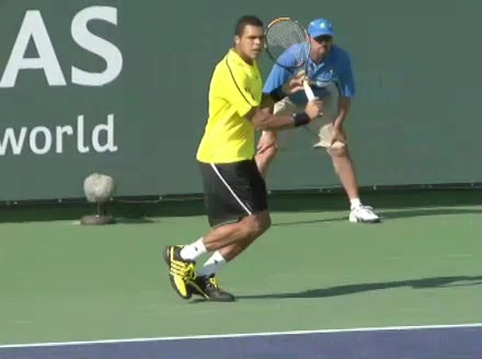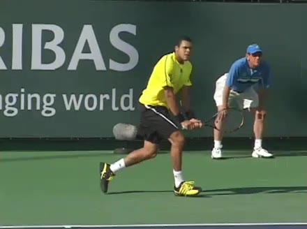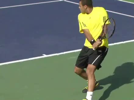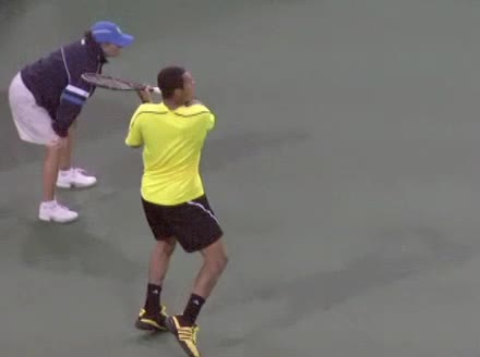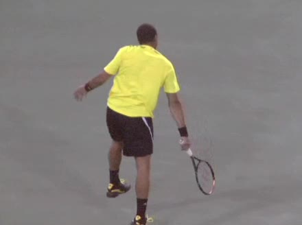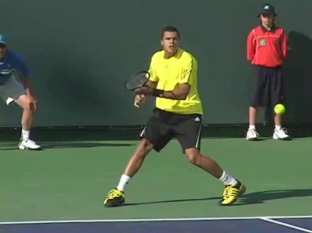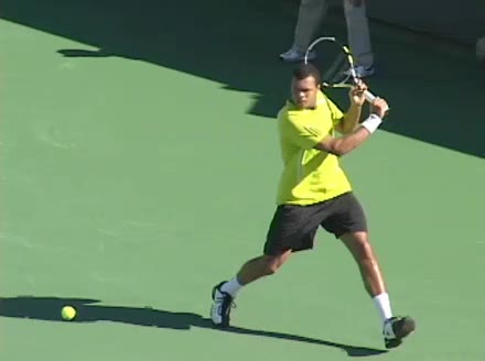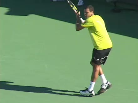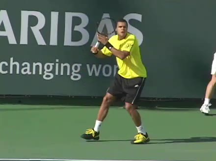 Jo-Wilfried Tsonga's backhand while moving back from a neutral position, filmed from a court_level front angle. His shoulders rotate as a unit with the trunk on the unit turn, then uncoil together through contact with limited independent shoulder rotation relative to the torso.
