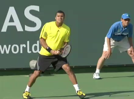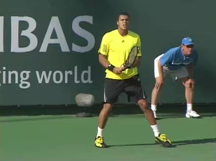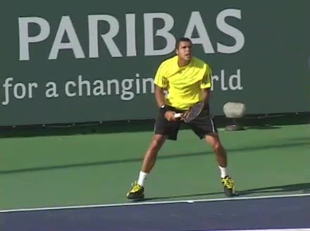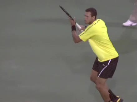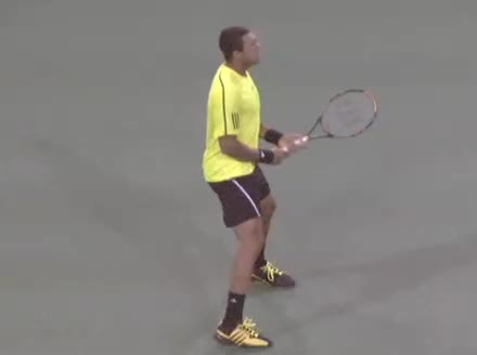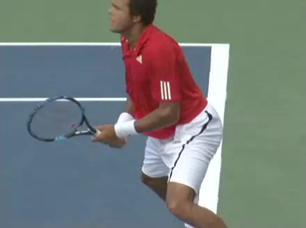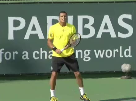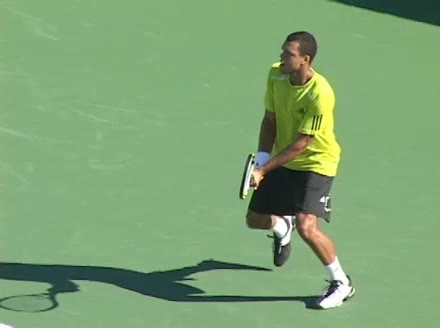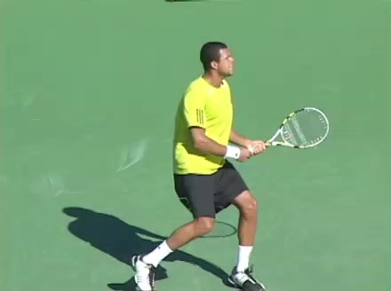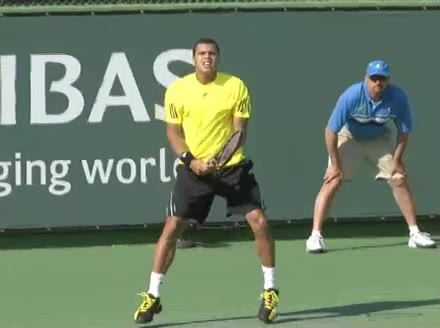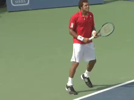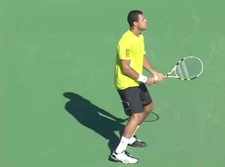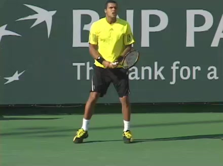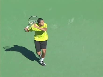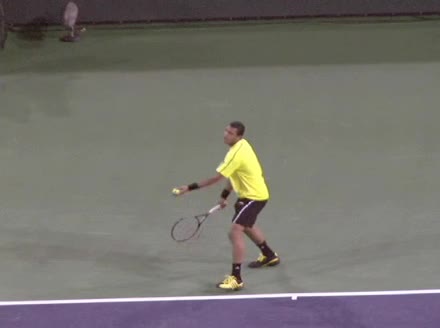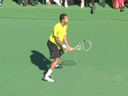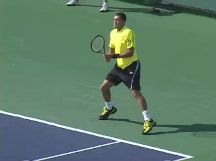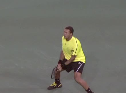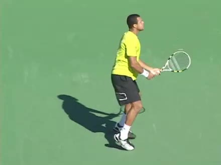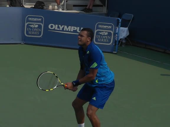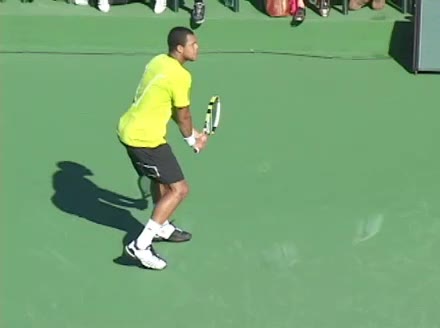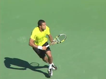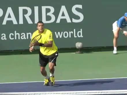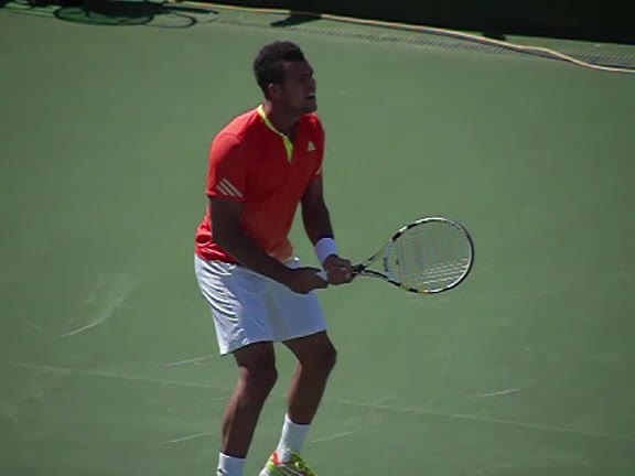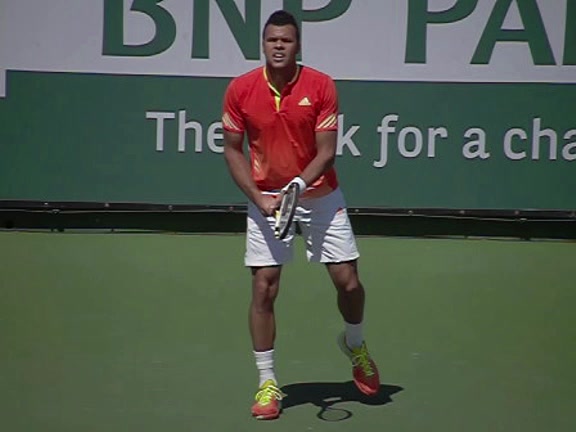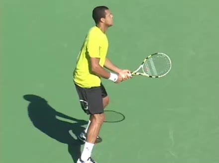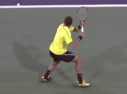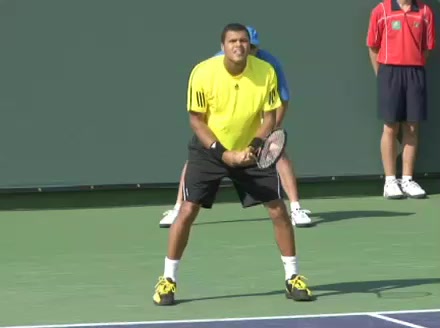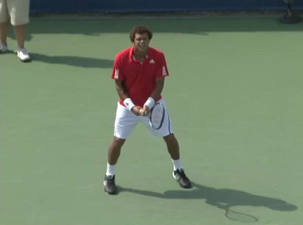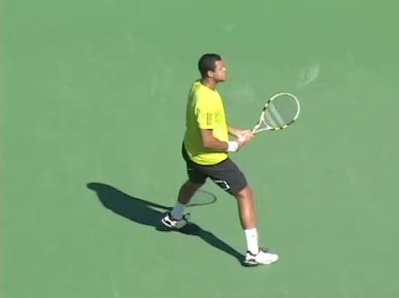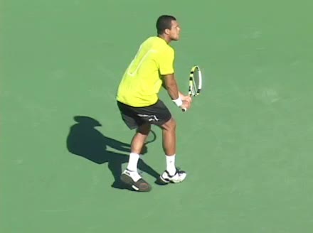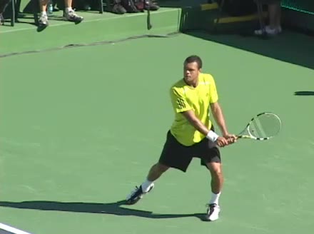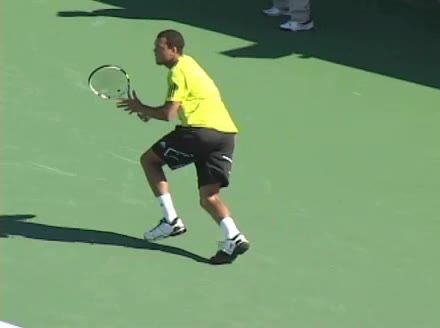 Jo-Wilfried Tsonga's backhand while moving back from a neutral position, filmed from a court_level front angle. His shoulders rotate as a unit with the trunk on the unit turn, then uncoil together through contact with limited independent shoulder rotation relative to the torso.