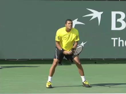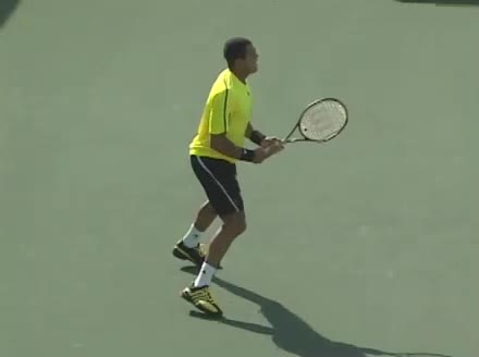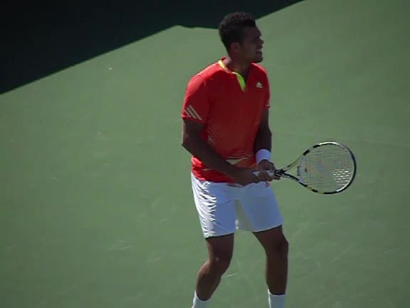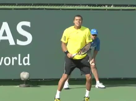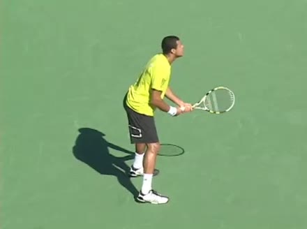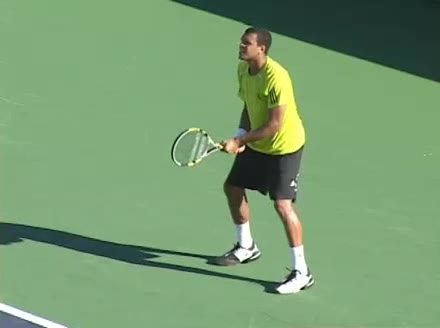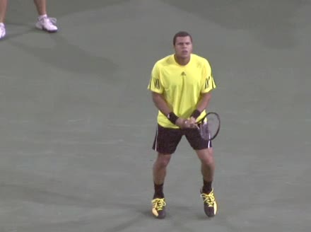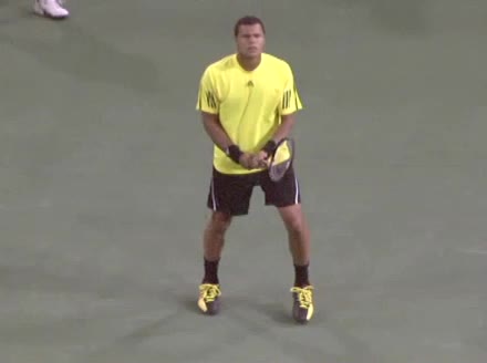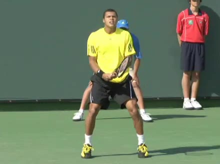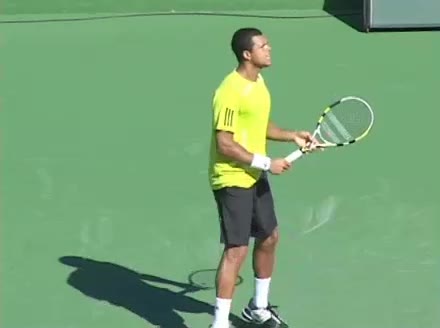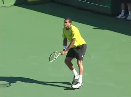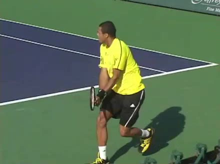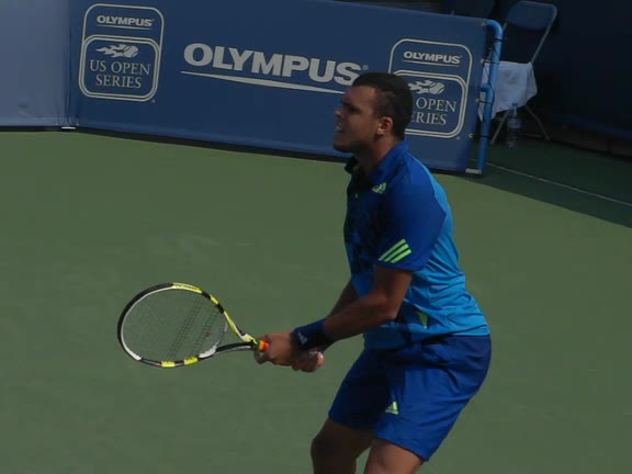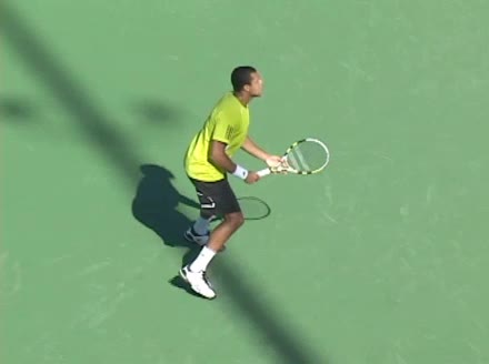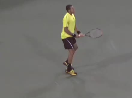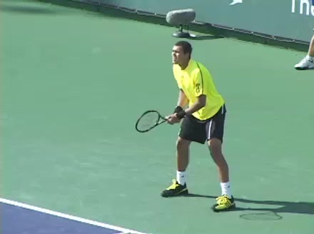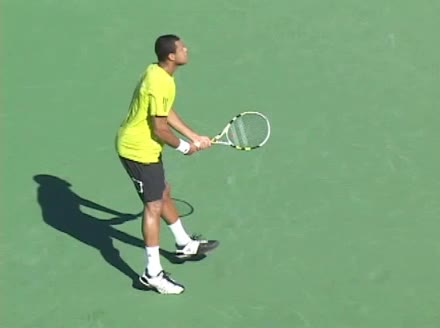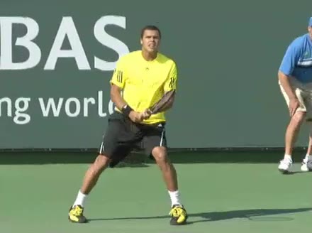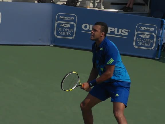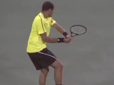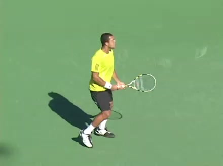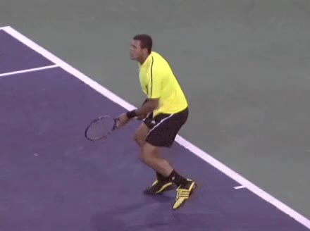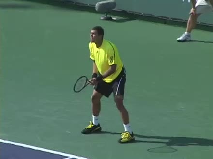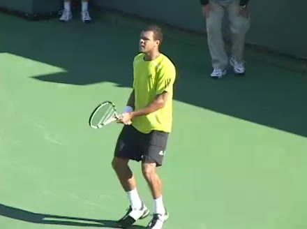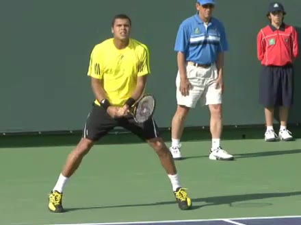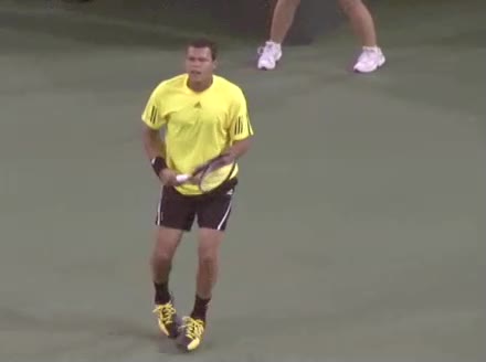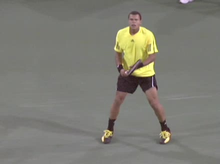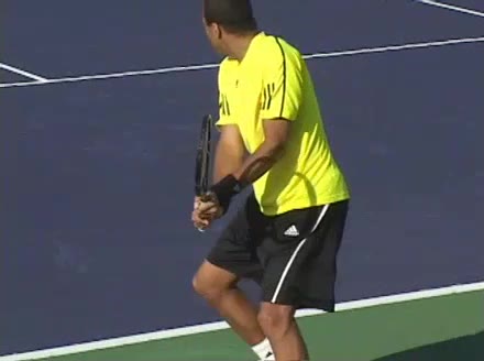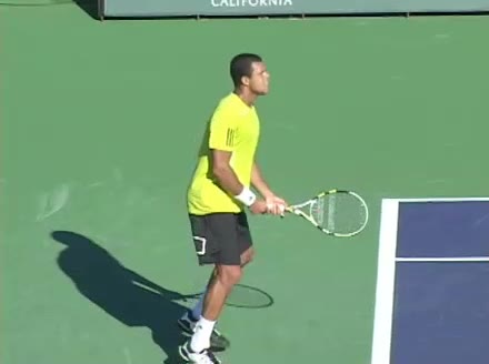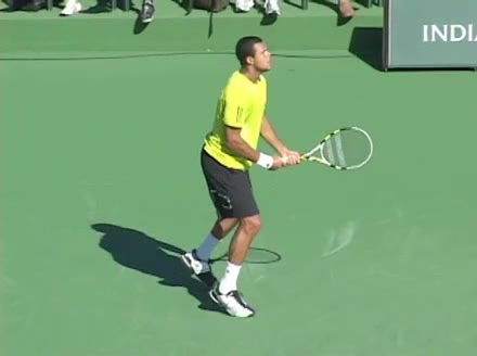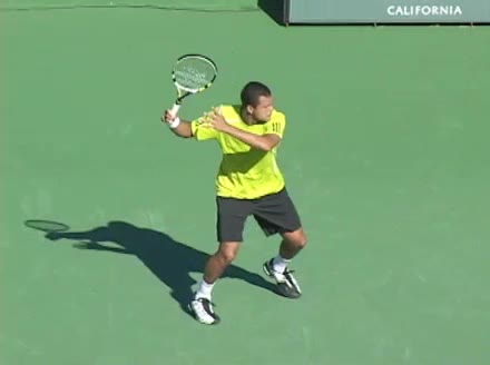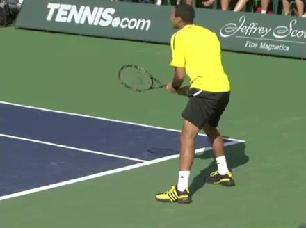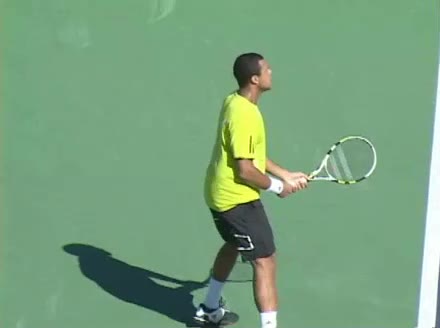 Jo-Wilfried Tsonga's backhand while moving back from a neutral position, filmed from a court_level front angle. His shoulders rotate as a unit with the trunk on the unit turn, then uncoil together through contact with limited independent shoulder rotation relative to the torso.