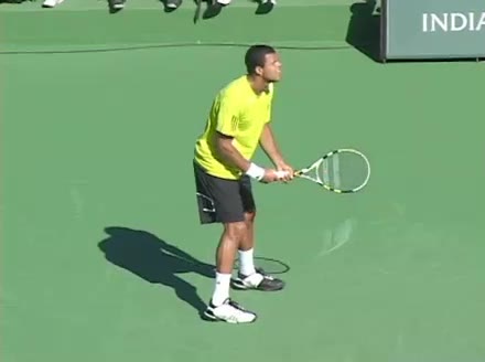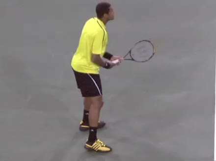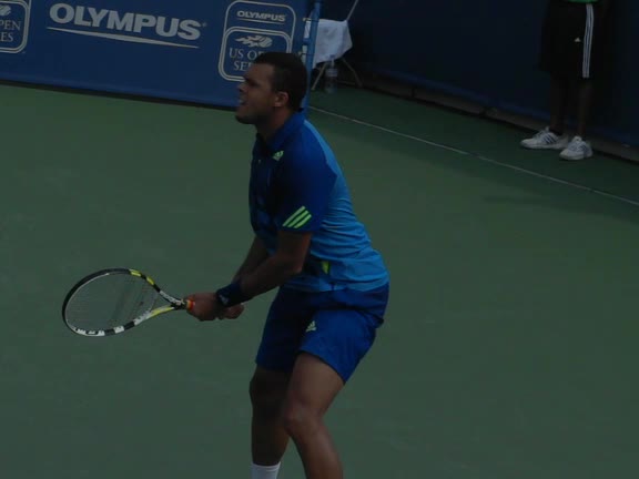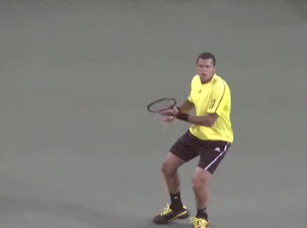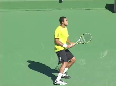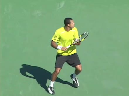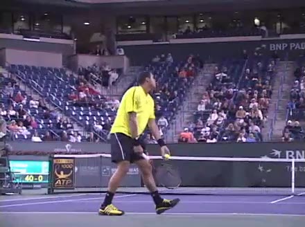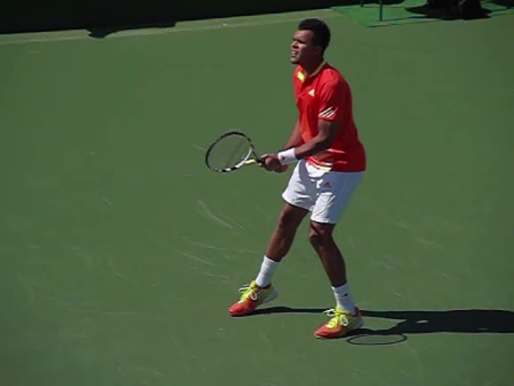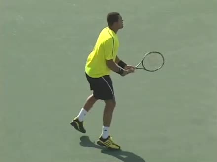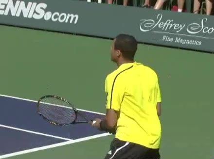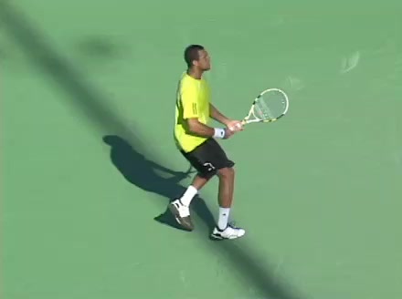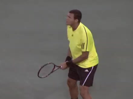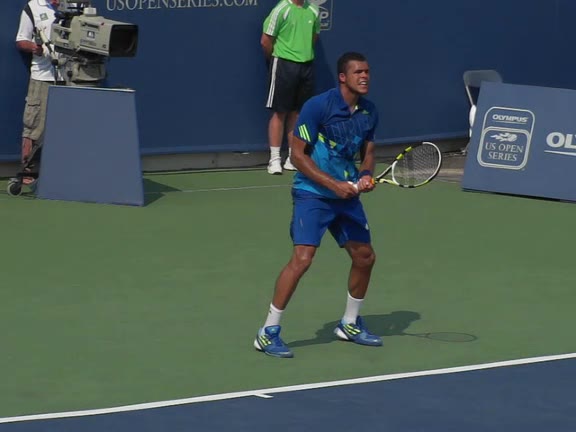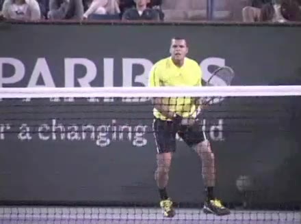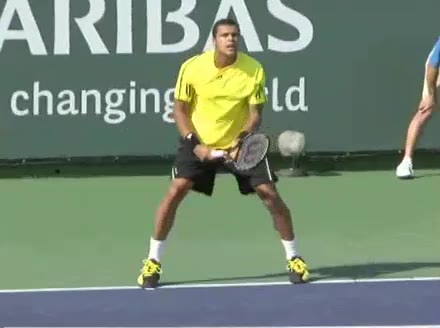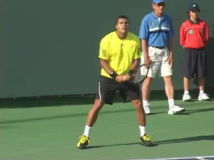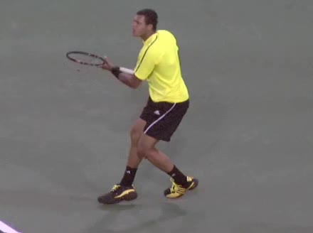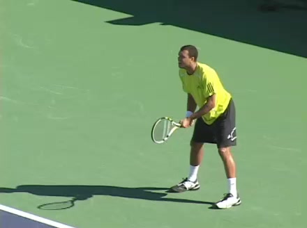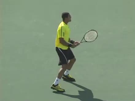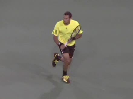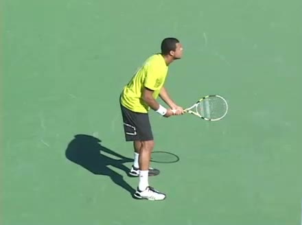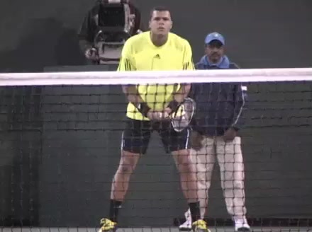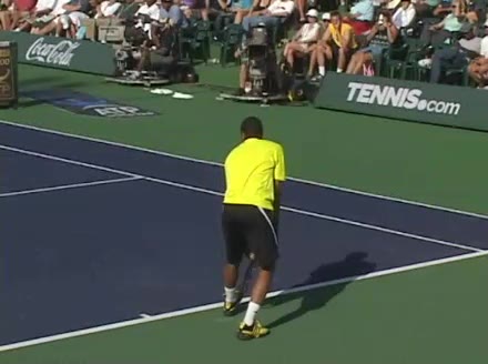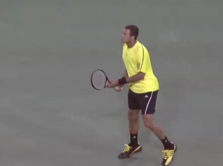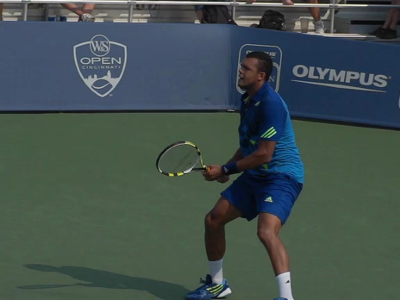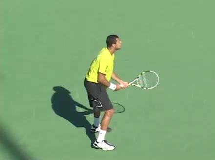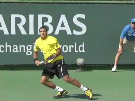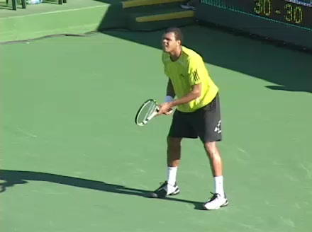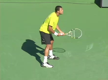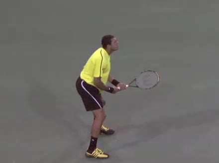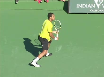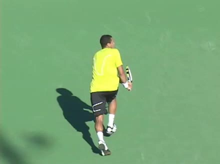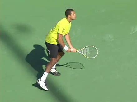 Jo-Wilfried Tsonga's backhand while moving back from a neutral position, filmed from a court_level front angle. His shoulders rotate as a unit with the trunk on the unit turn, then uncoil together through contact with limited independent shoulder rotation relative to the torso.