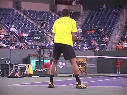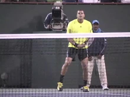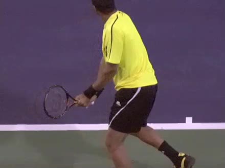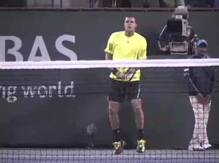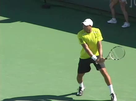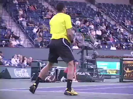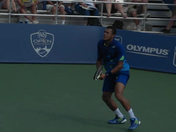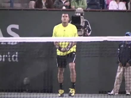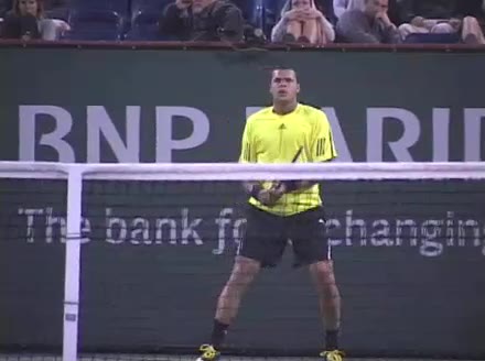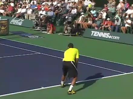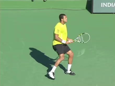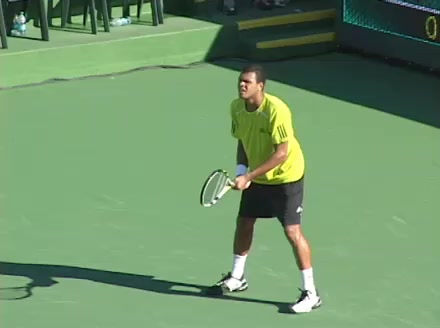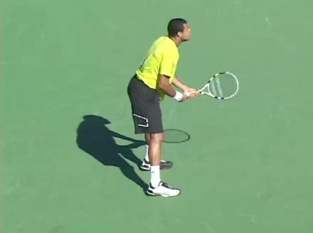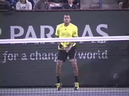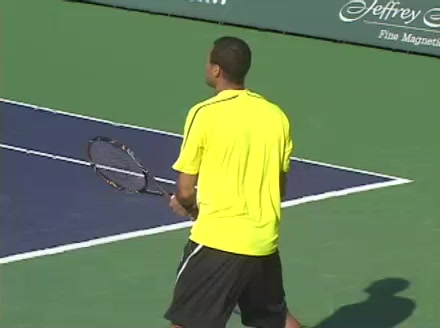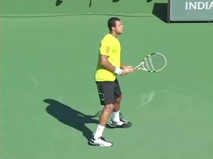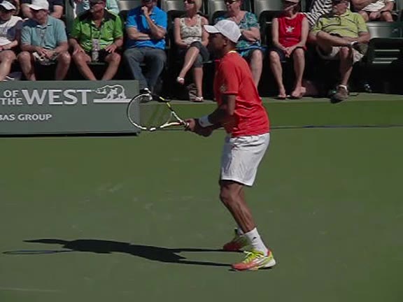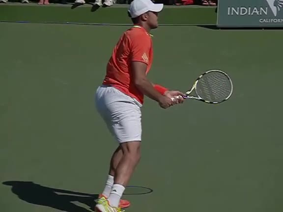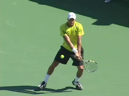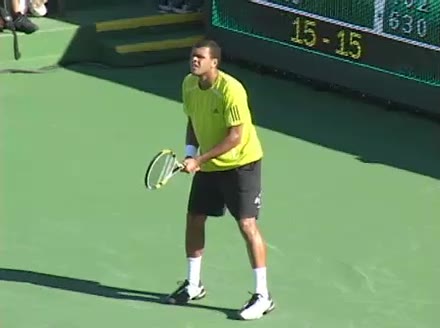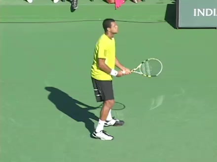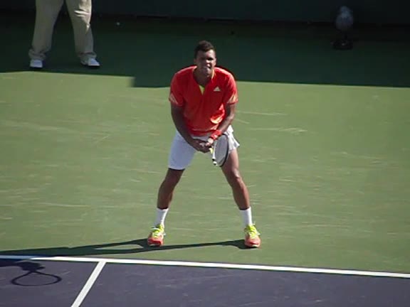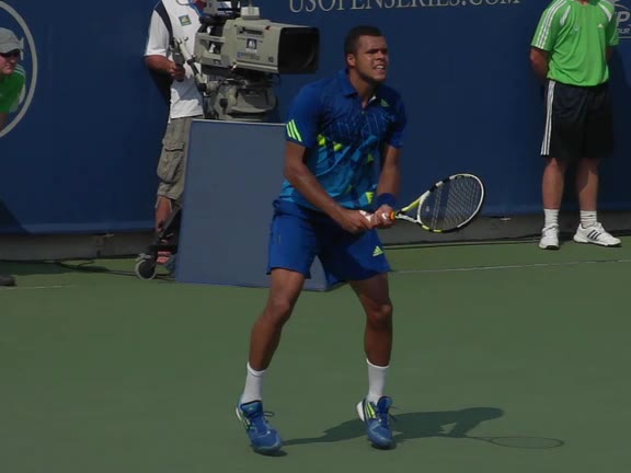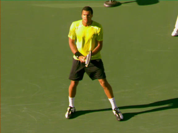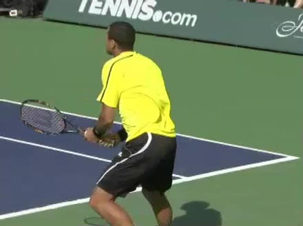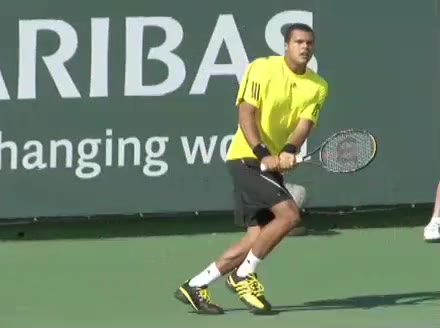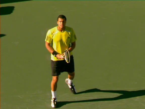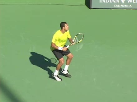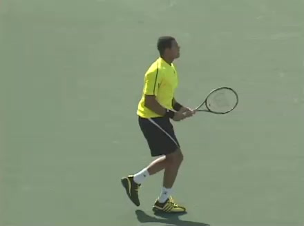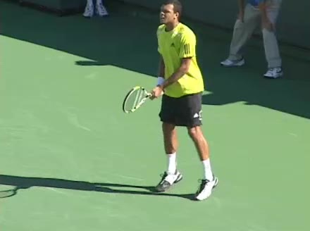 Jo-Wilfried Tsonga's backhand while moving back from a neutral position, filmed from a court_level front angle. His shoulders rotate as a unit with the trunk on the unit turn, then uncoil together through contact with limited independent shoulder rotation relative to the torso.