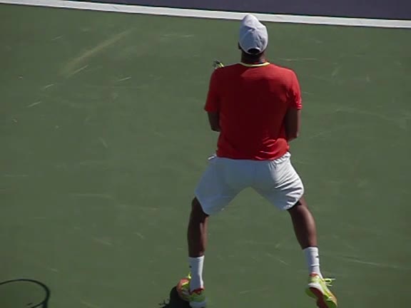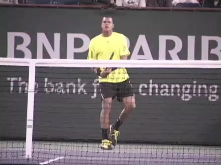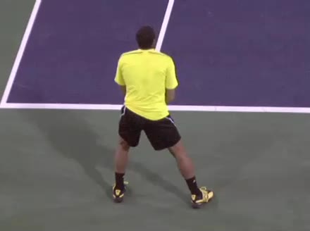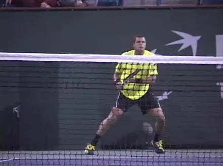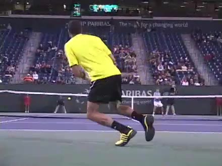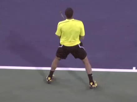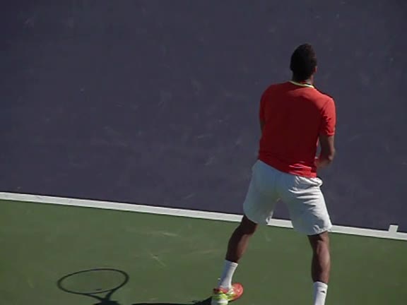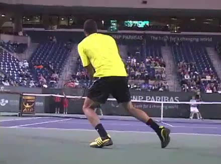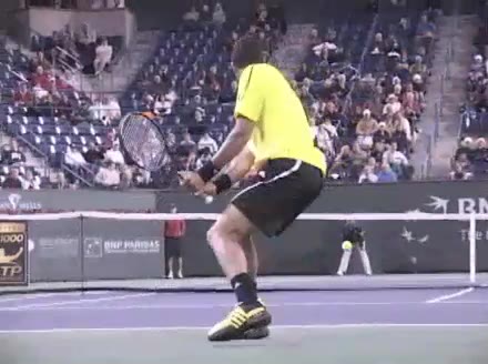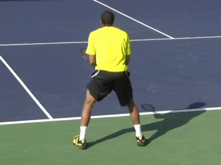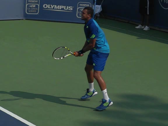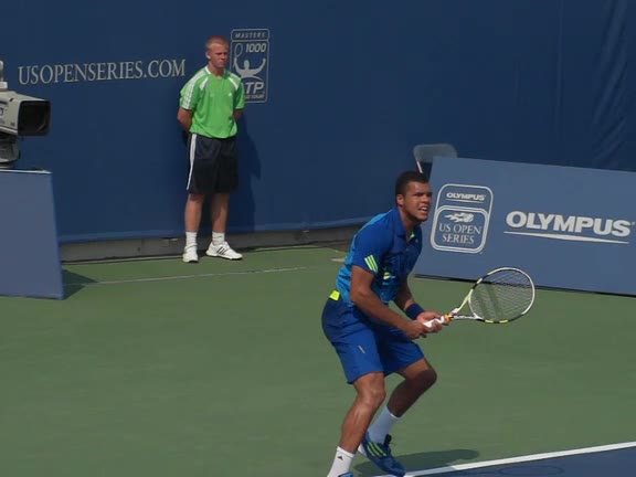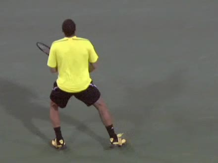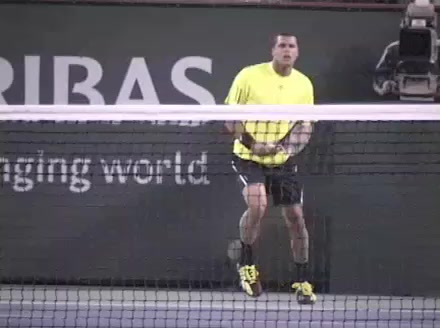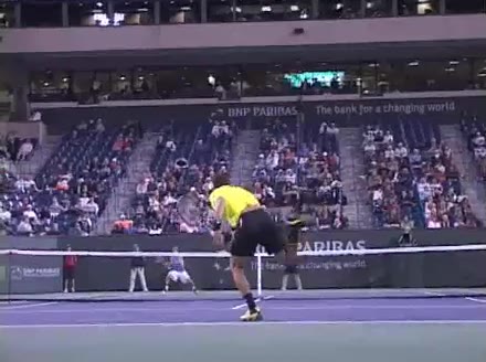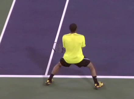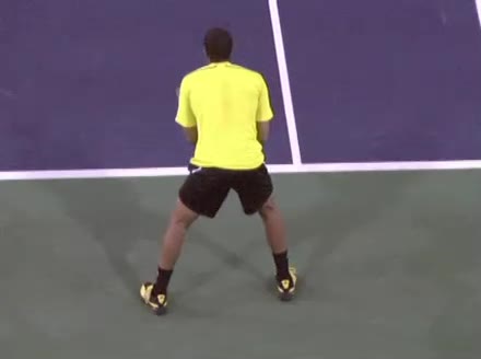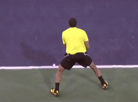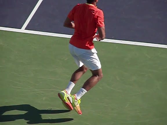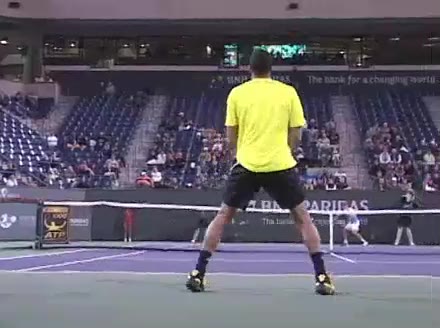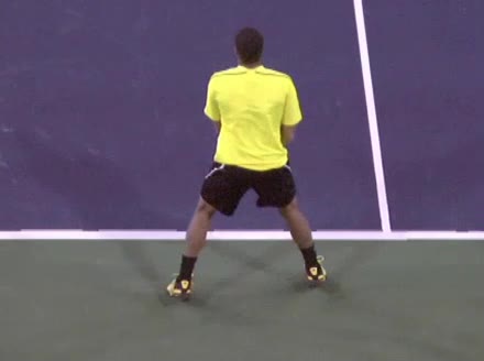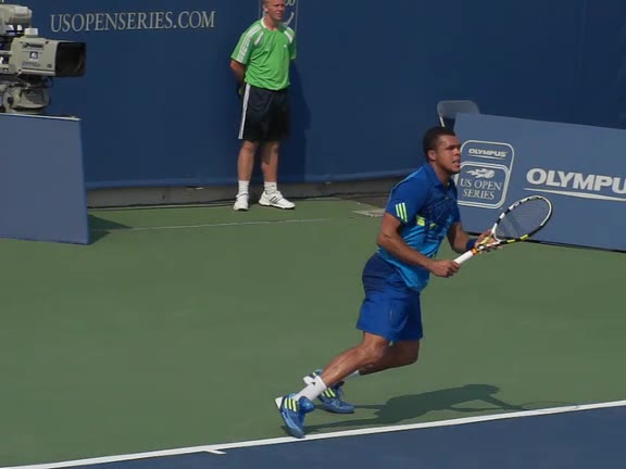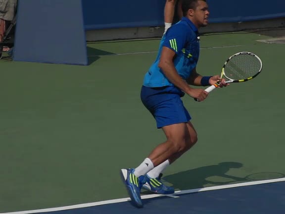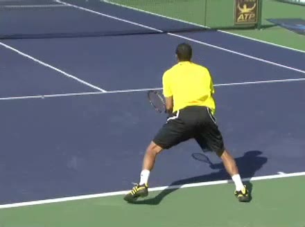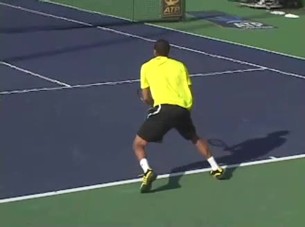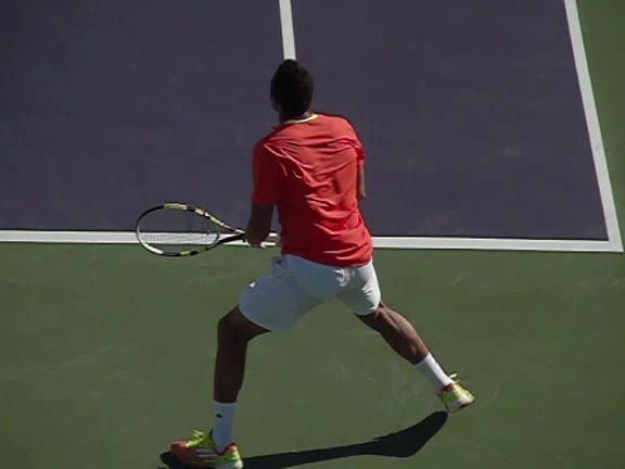 Jo-Wilfried Tsonga's forehand approach followed by a backhand volley from a central position, filmed from the rear. His quick adjustment steps into an open stance on the forehand and immediate crossover recovery toward the net are clearly visible from this angle.
