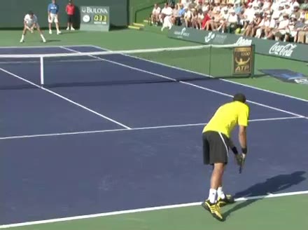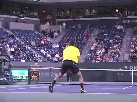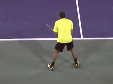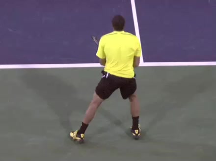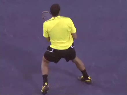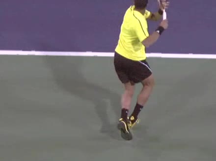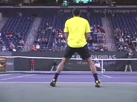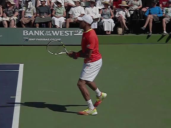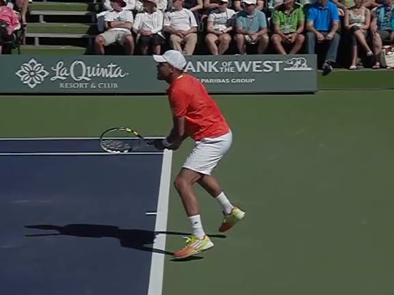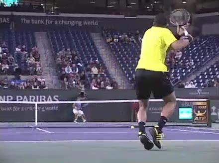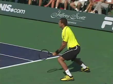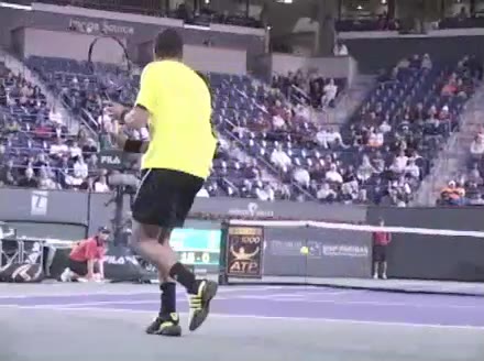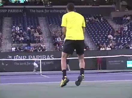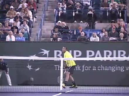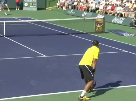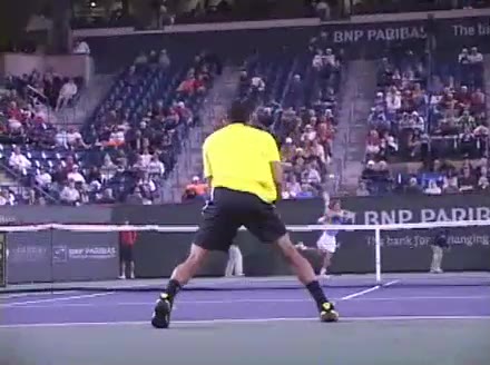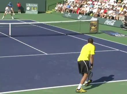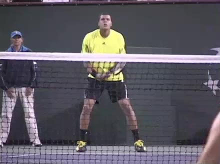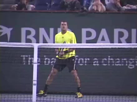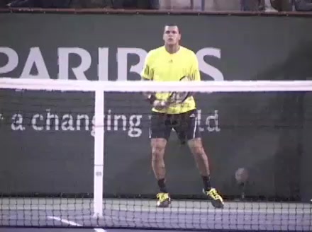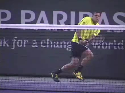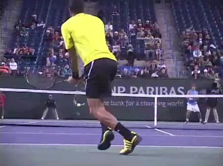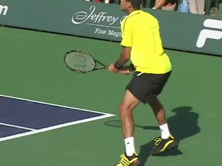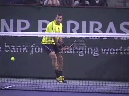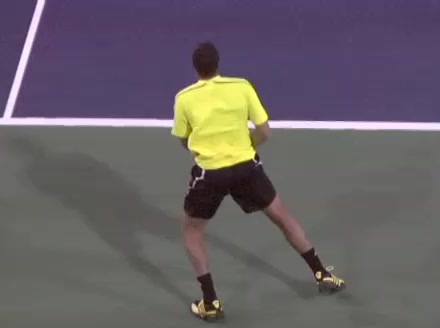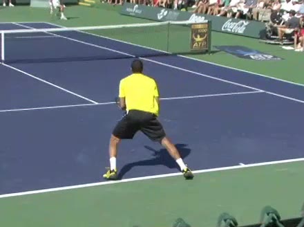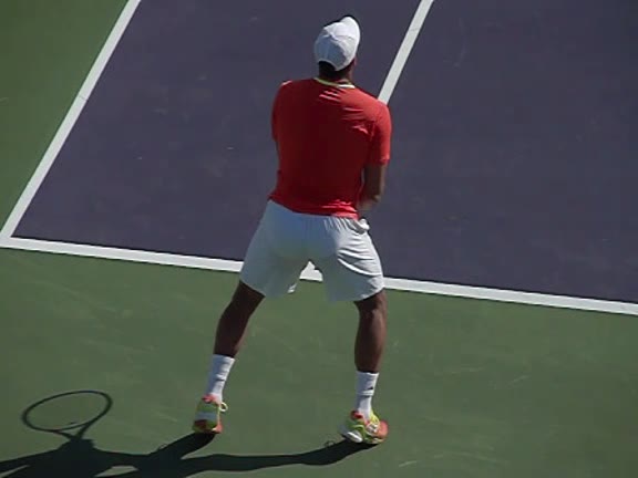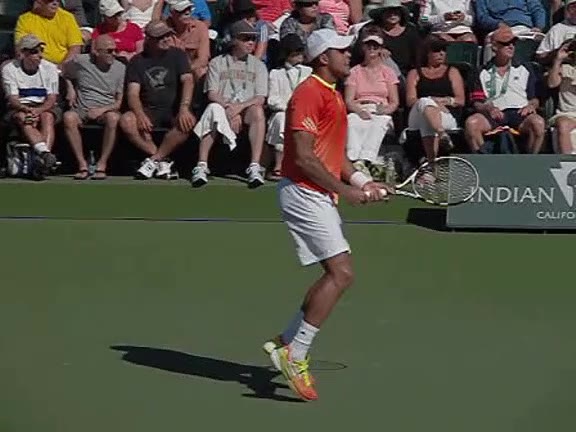 Jo-Wilfried Tsonga's forehand approach followed by a backhand volley from a central position, filmed from the rear. His quick adjustment steps into an open stance on the forehand and immediate crossover recovery toward the net are clearly visible from this angle.