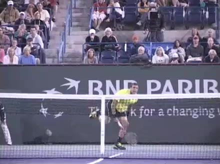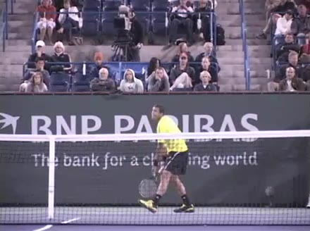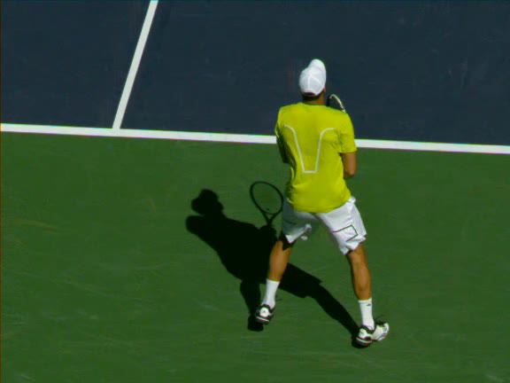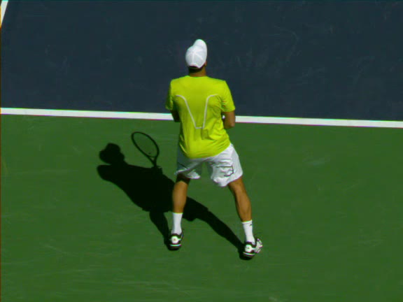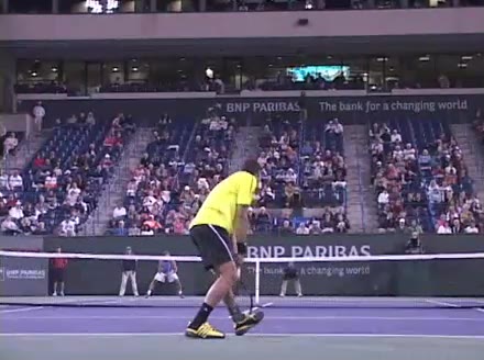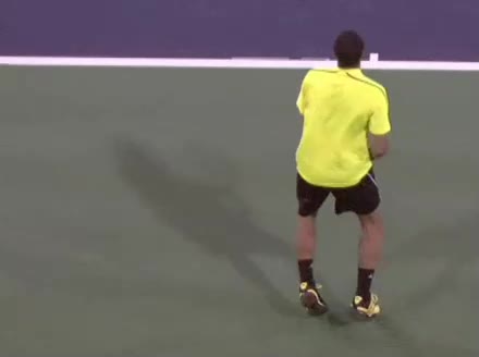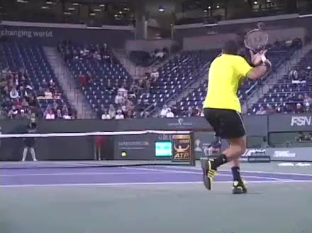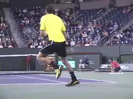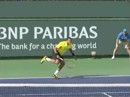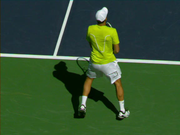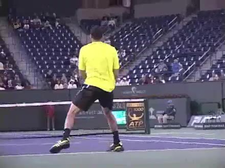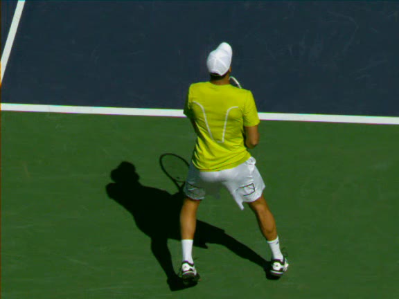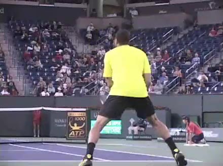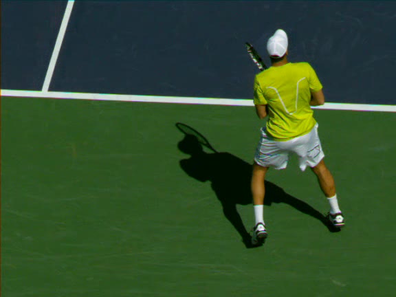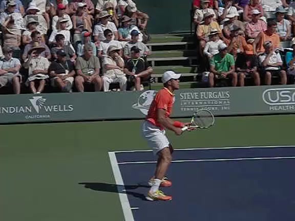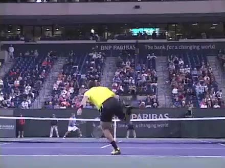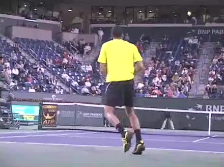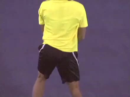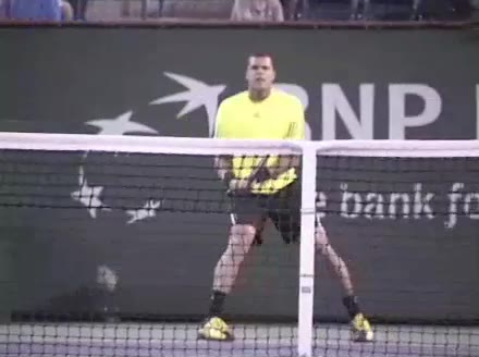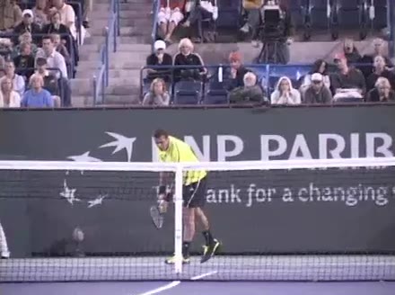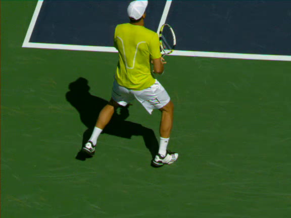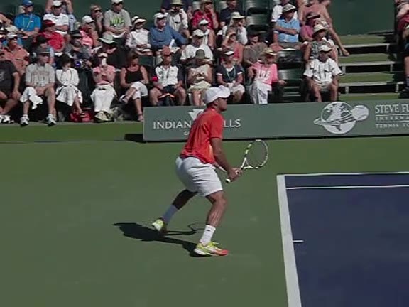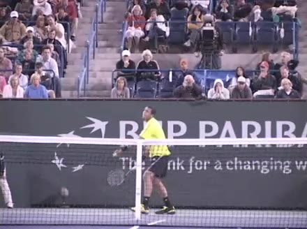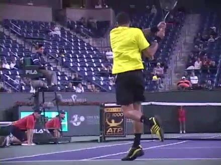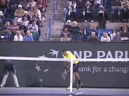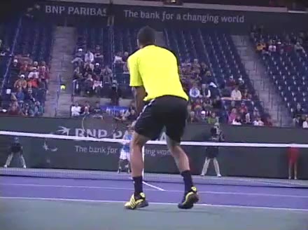 Jo-Wilfried Tsonga's forehand approach followed by a backhand volley from a central position, filmed from the rear. His quick adjustment steps into an open stance on the forehand and immediate crossover recovery toward the net are clearly visible from this angle.