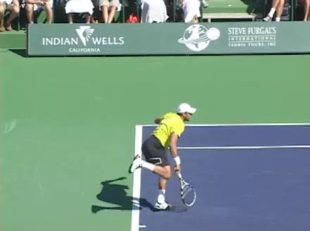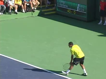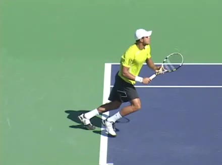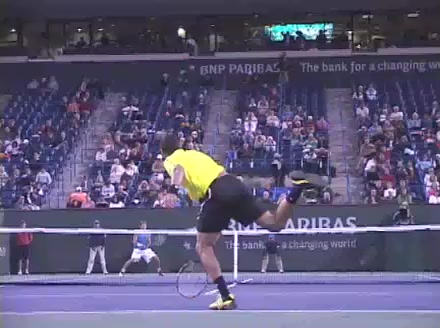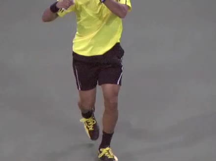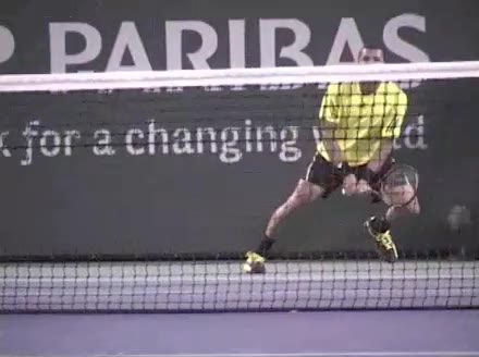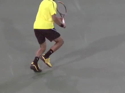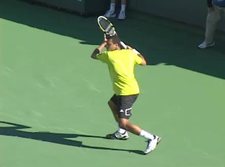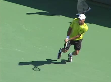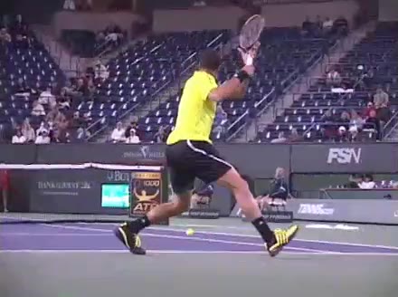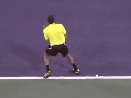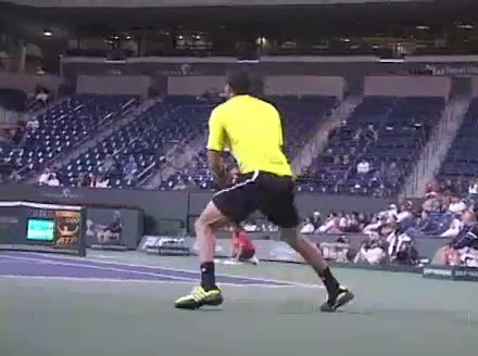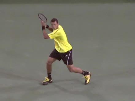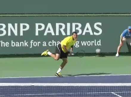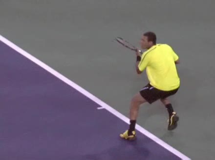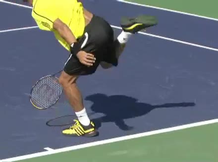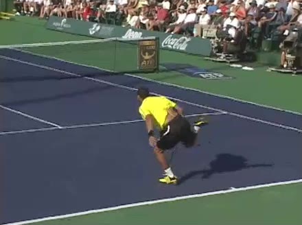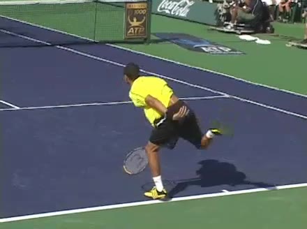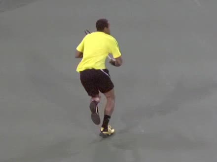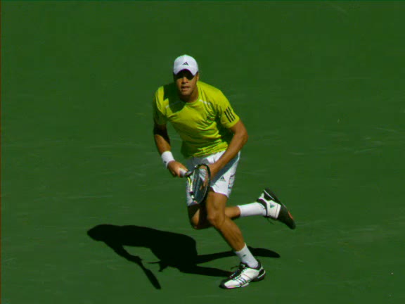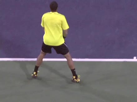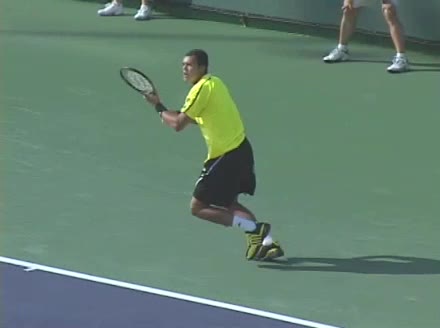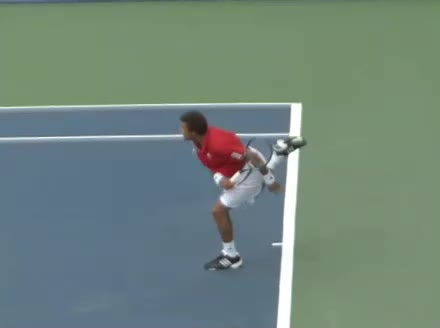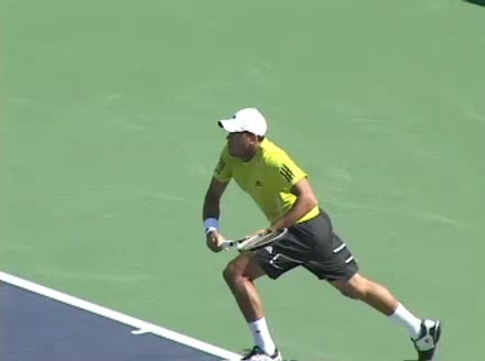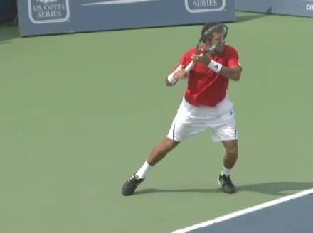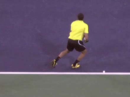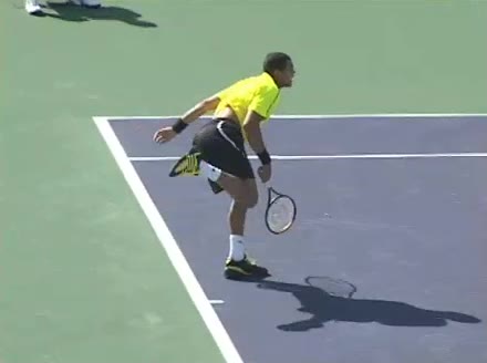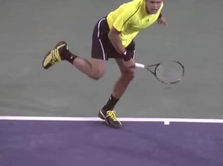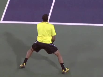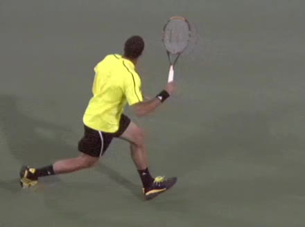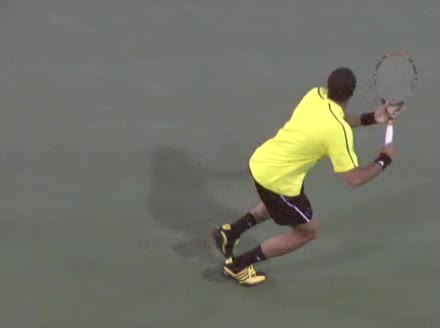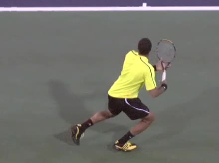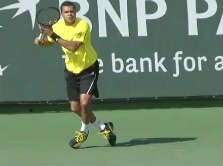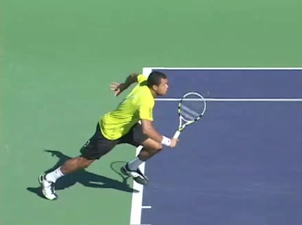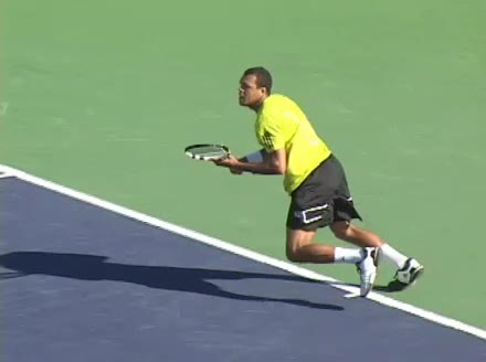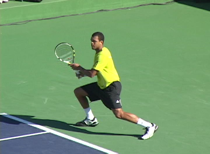 Jo-Wilfried Tsonga's running forehand slice from the side, filmed from a side angle. After contact his racquet finishes out in front with the non-hitting arm extended back for counterbalance as he continues his forward momentum into a low, wide recovery stance.
