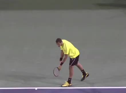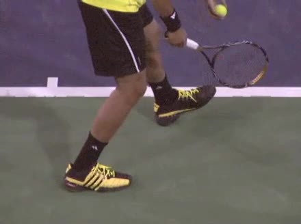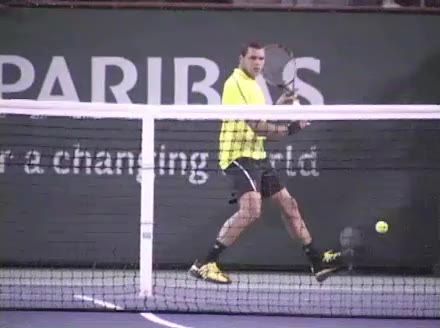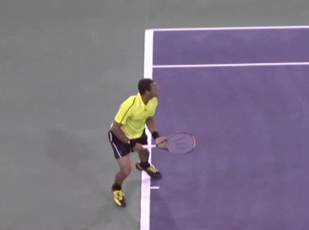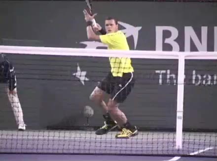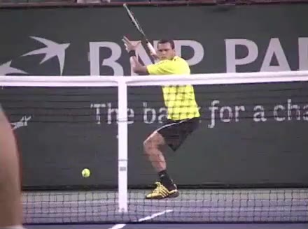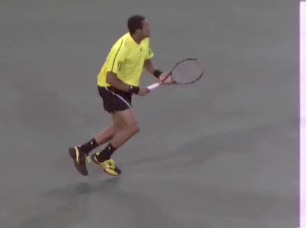 Jo-Wilfried Tsonga's forehand approach followed by a backhand drop volley from mid-court, filmed from the side. His semi-western forehand grip sets up visible wrist lag through the forward swing, while on the backhand drop volley his continental grip keeps the wrist relatively firm with a subtle softening right at contact.