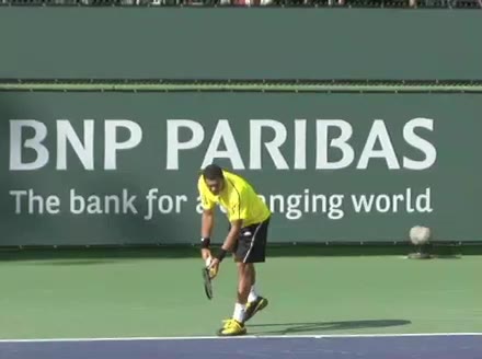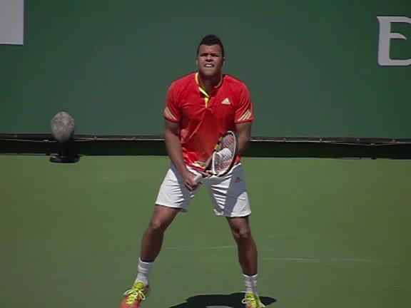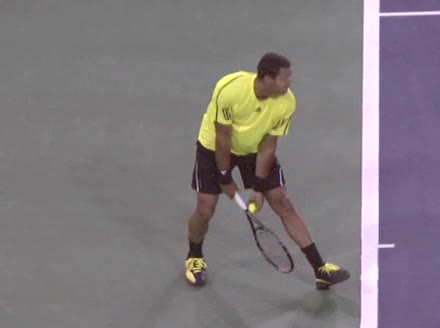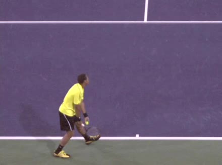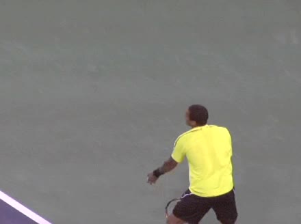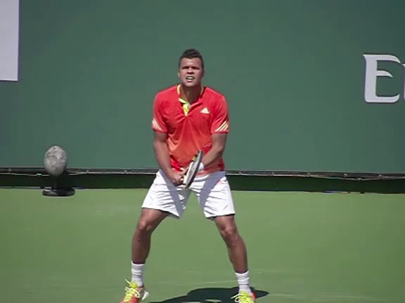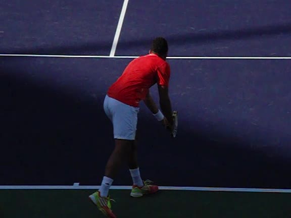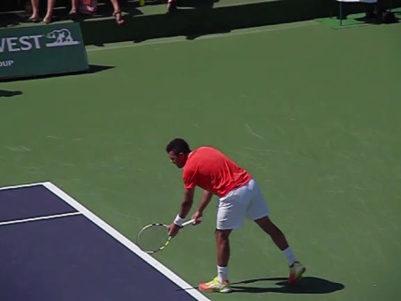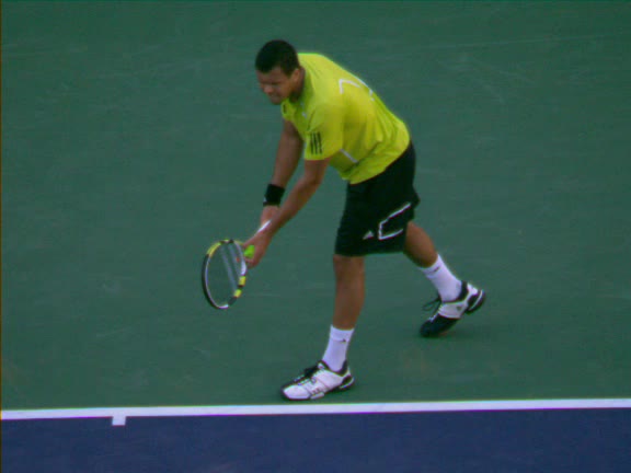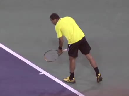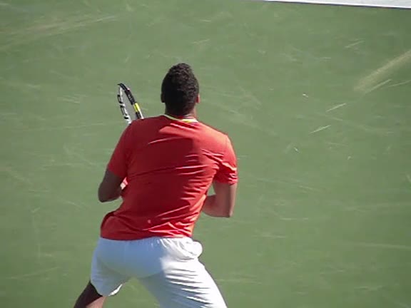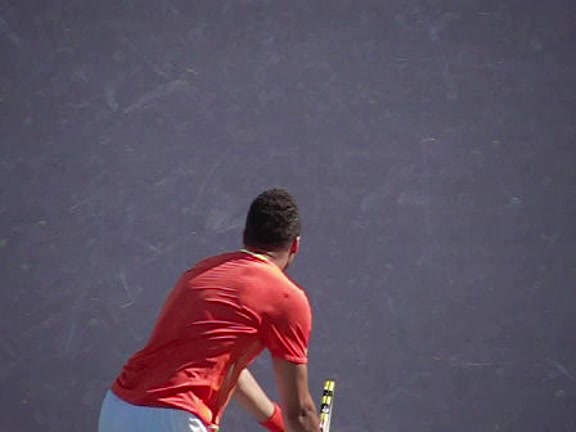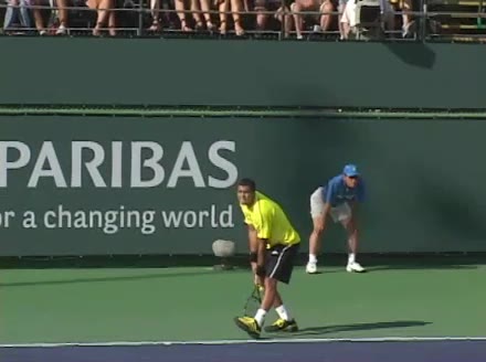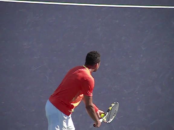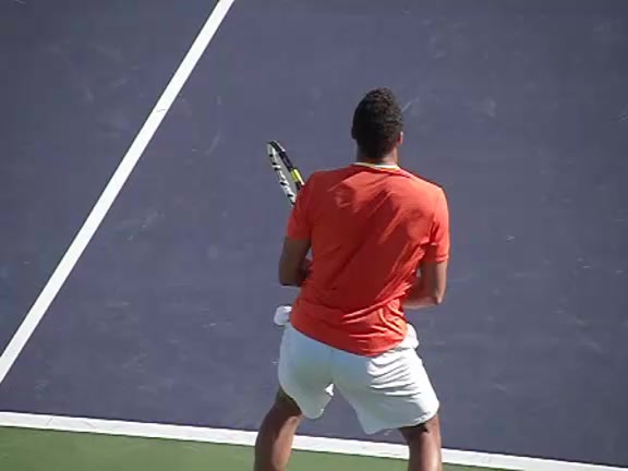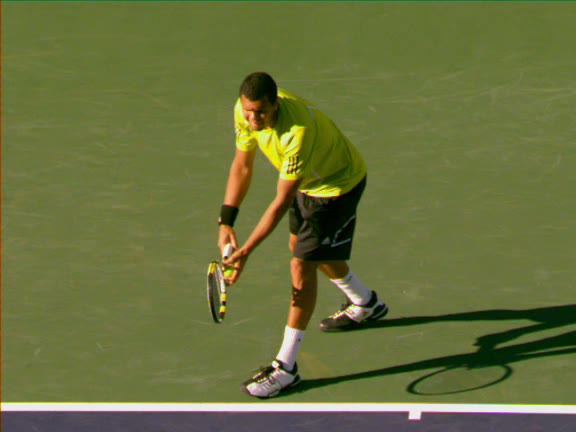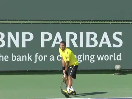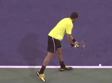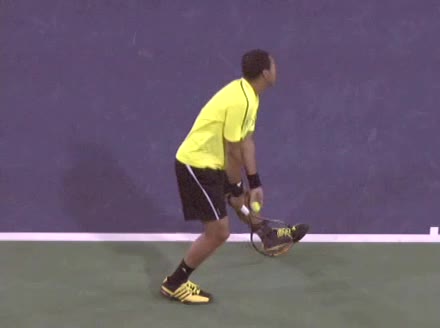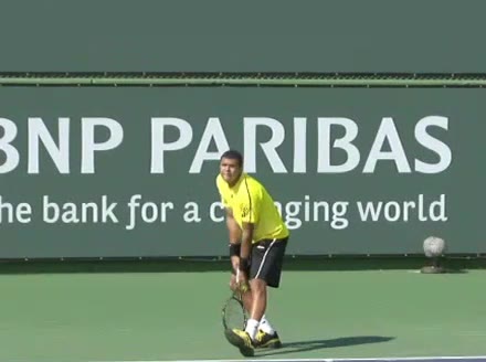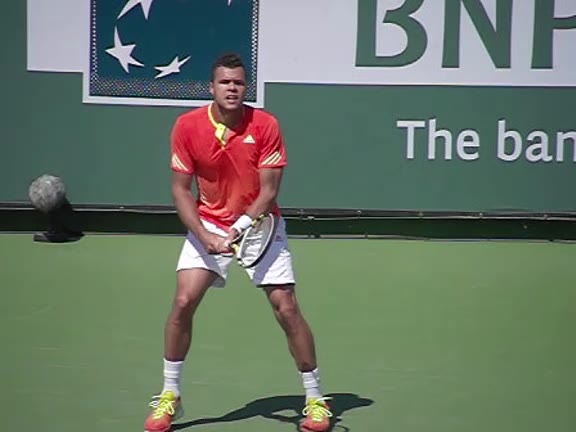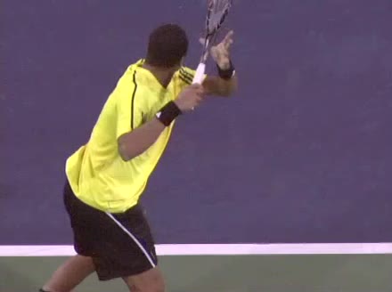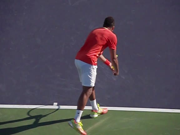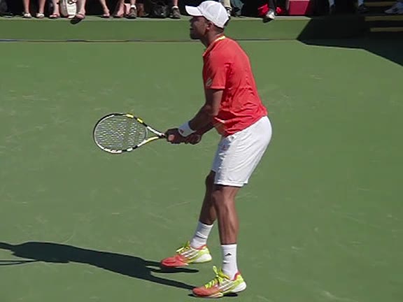Jo-Wilfried Tsonga's second serve from the deuce court, filmed from the side. The racket moves up to contact with a slightly closed face and reaches the ball at about head height, showing a steep upward swing path for spin.