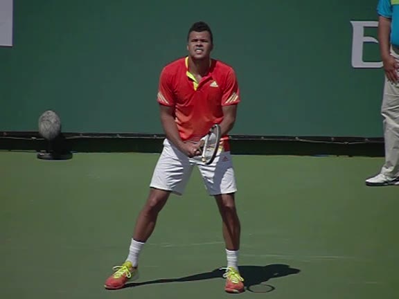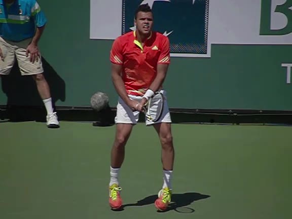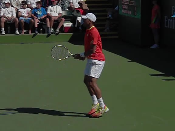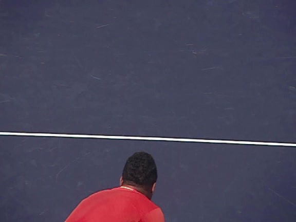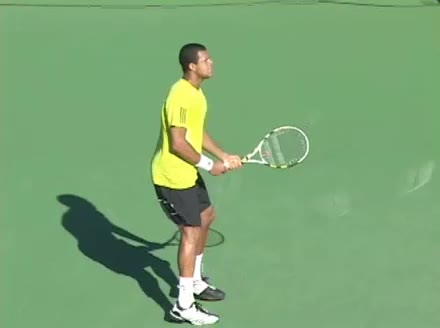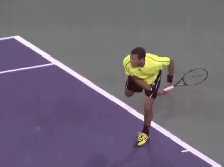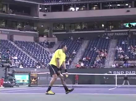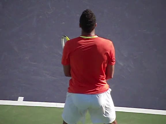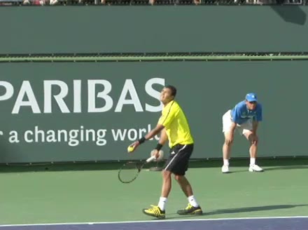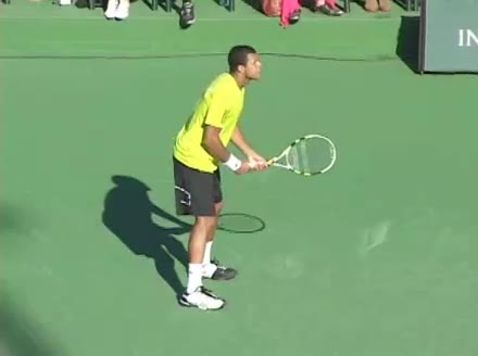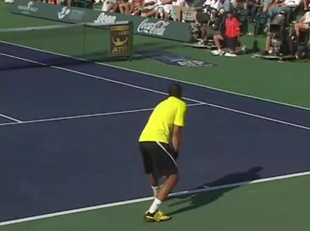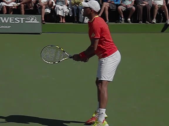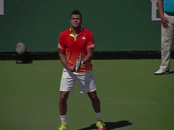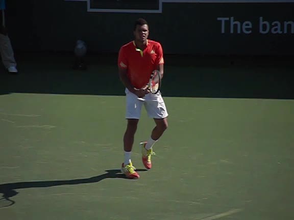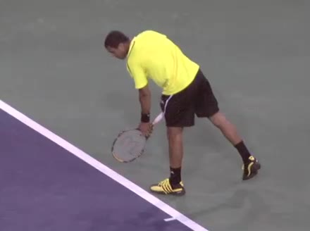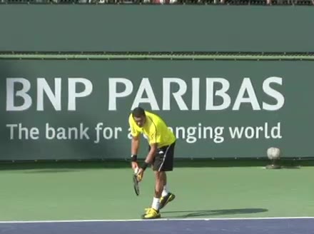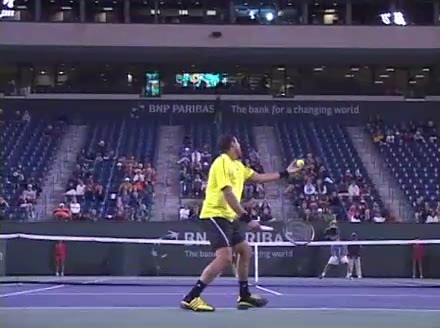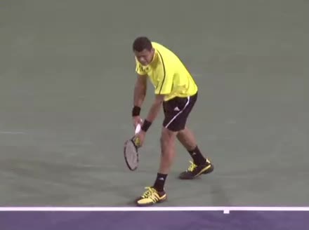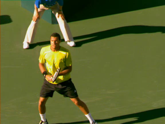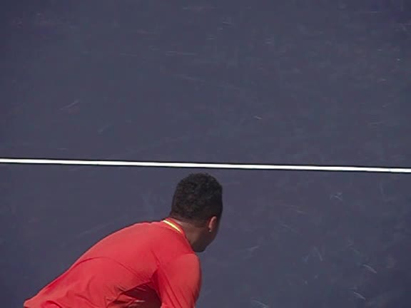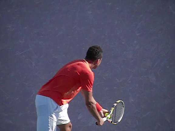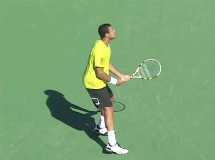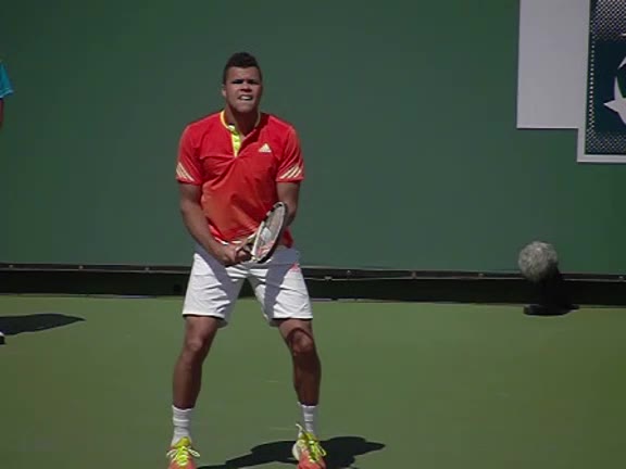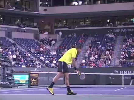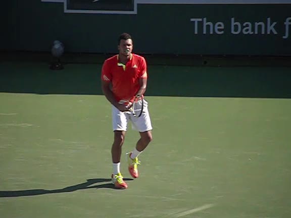 Jo-Wilfried Tsonga's second serve from the deuce court, filmed from the side. The racket moves up to contact with a slightly closed face and reaches the ball at about head height, showing a steep upward swing path for spin.