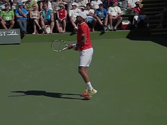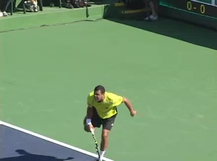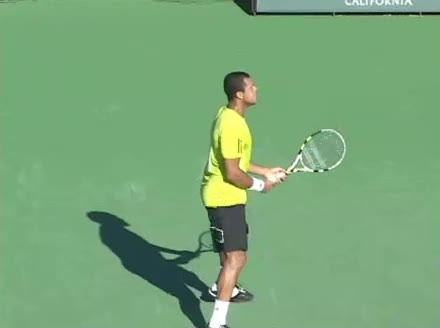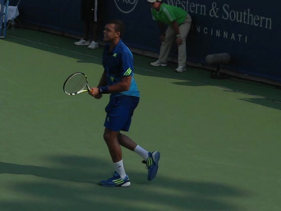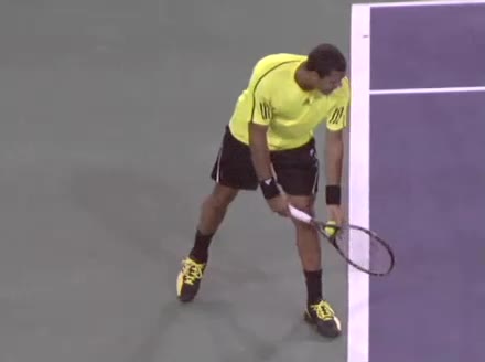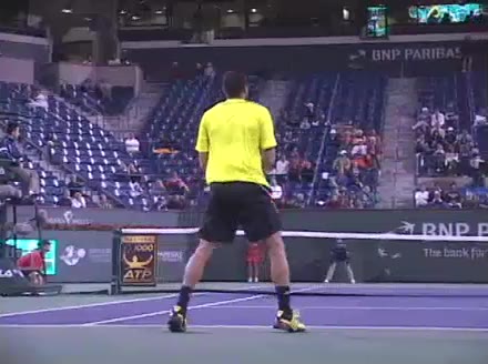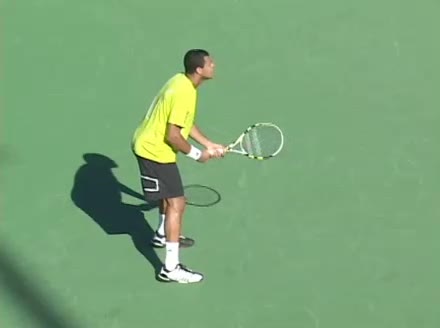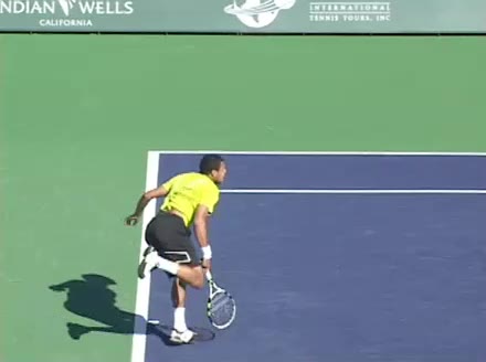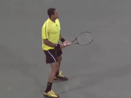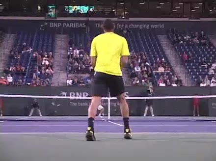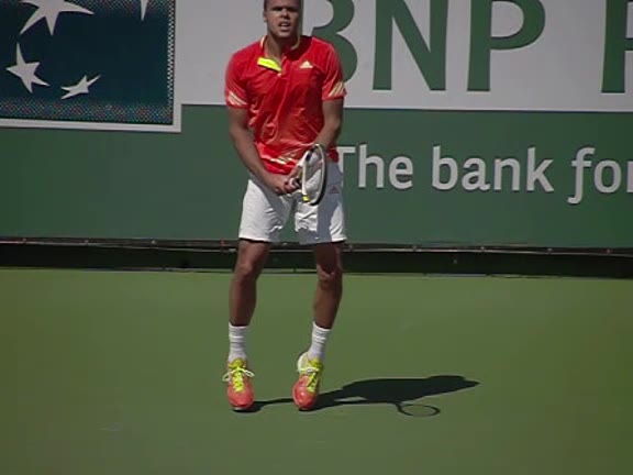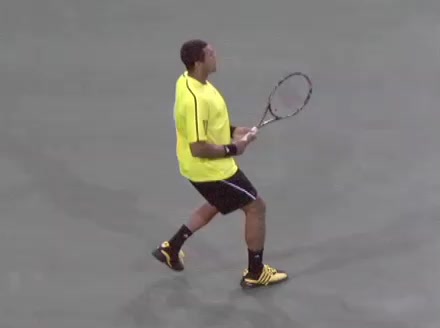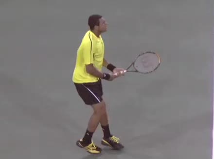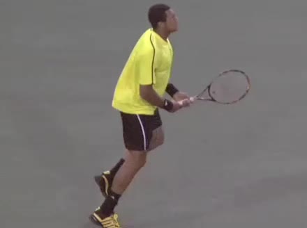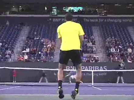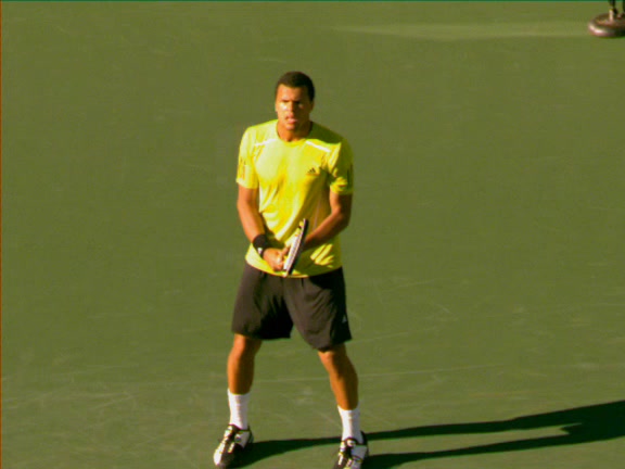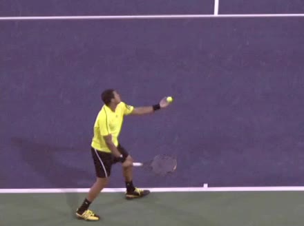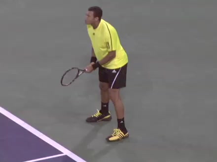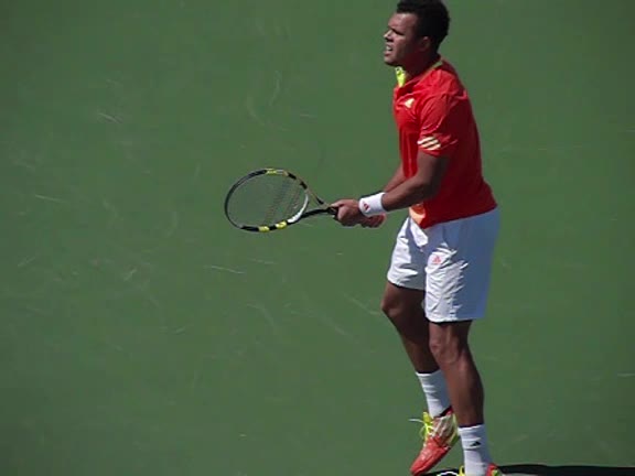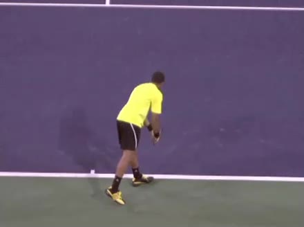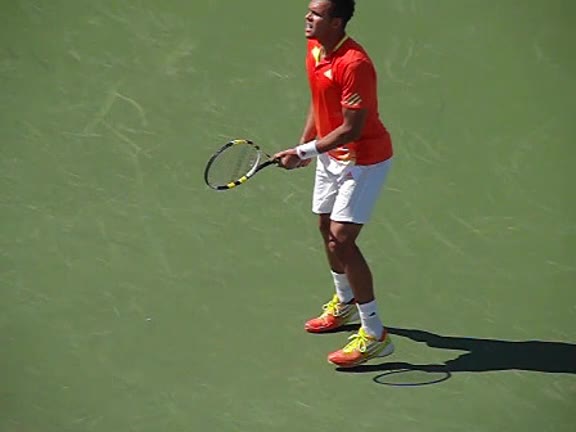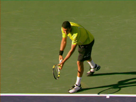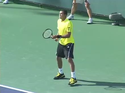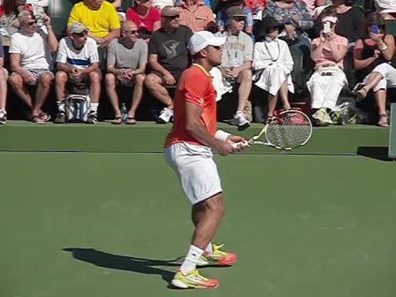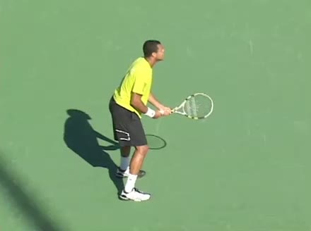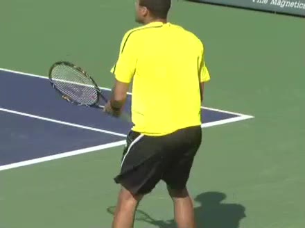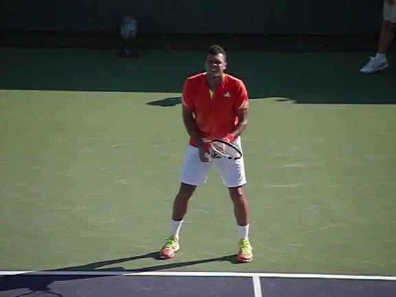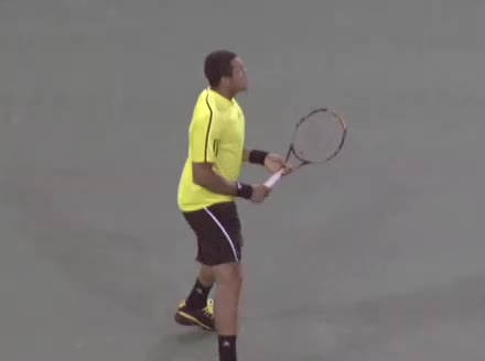 Jo-Wilfried Tsonga's second serve from the deuce court, filmed from the side. The racket moves up to contact with a slightly closed face and reaches the ball at about head height, showing a steep upward swing path for spin.